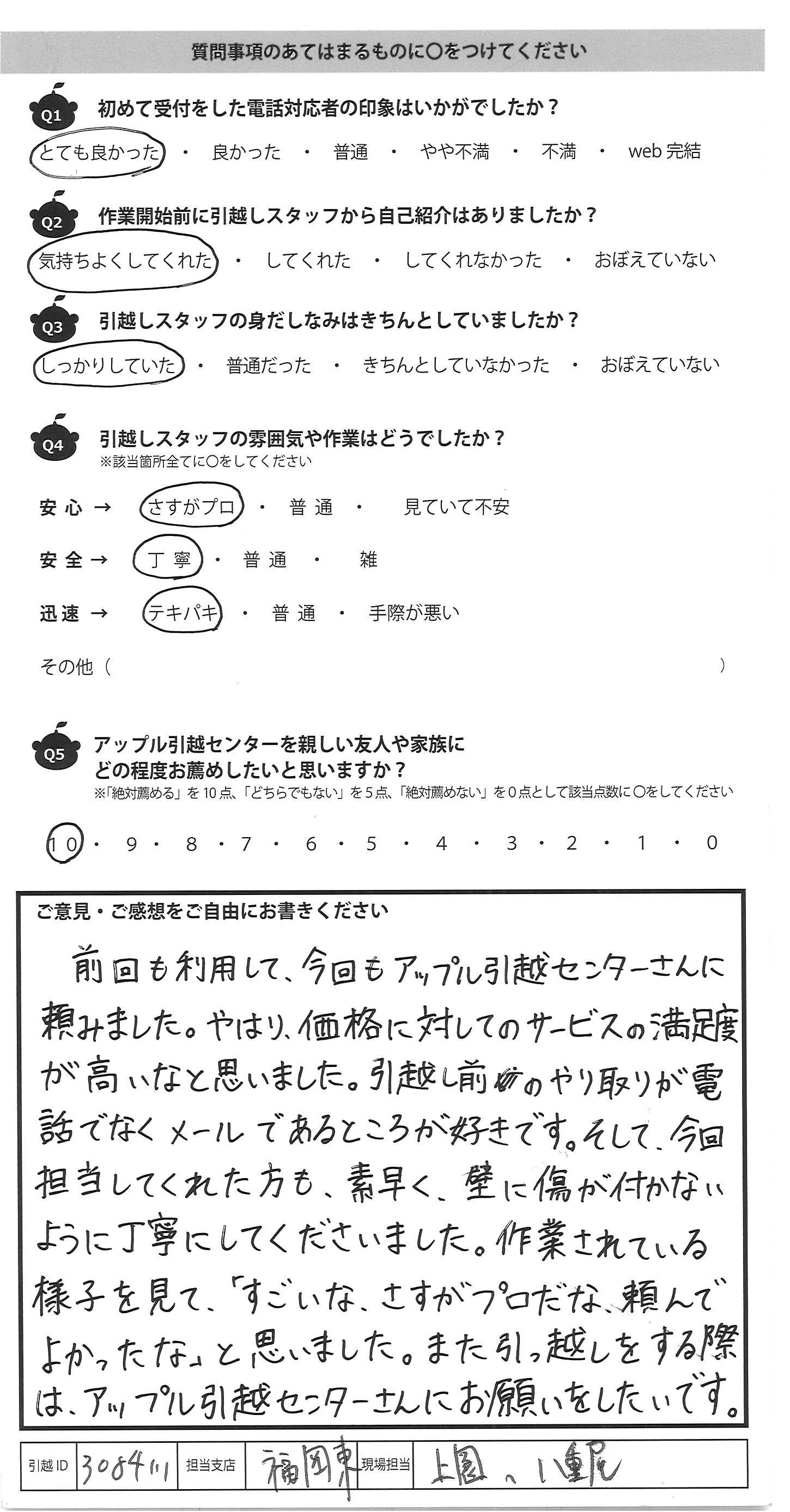 A.前回も利用して、今回もアップル引越センターさんに 頼みました。やはり、価格に対してのサービスの満足度 が高いなと思いました。引越し前のやり取りが電 話でなくメールであるところが好きです。そして、今回 担当してくれた方も、素早く、壁に傷が付かない ように丁寧にしてくださいました。作業されている 様子を見て、「すごいな、さすがプロだな、頼んで よかったな」と思いました。また引っ越しをする際 は、アップル引越センターさんにお願いをしたいです。