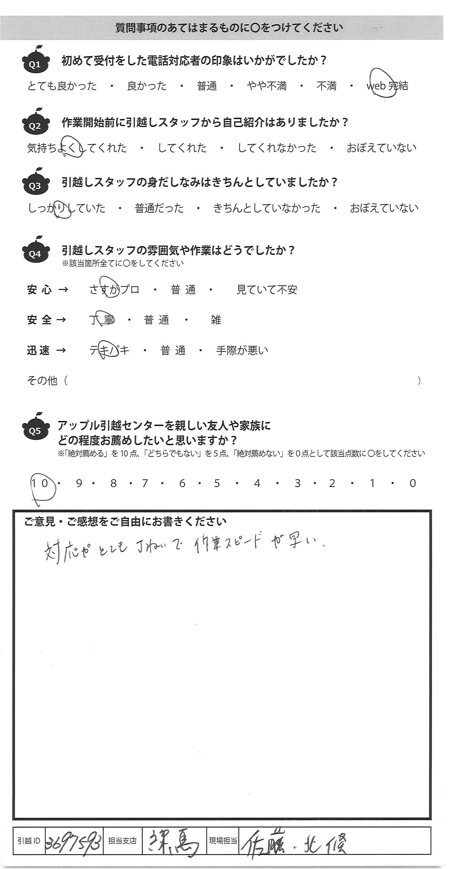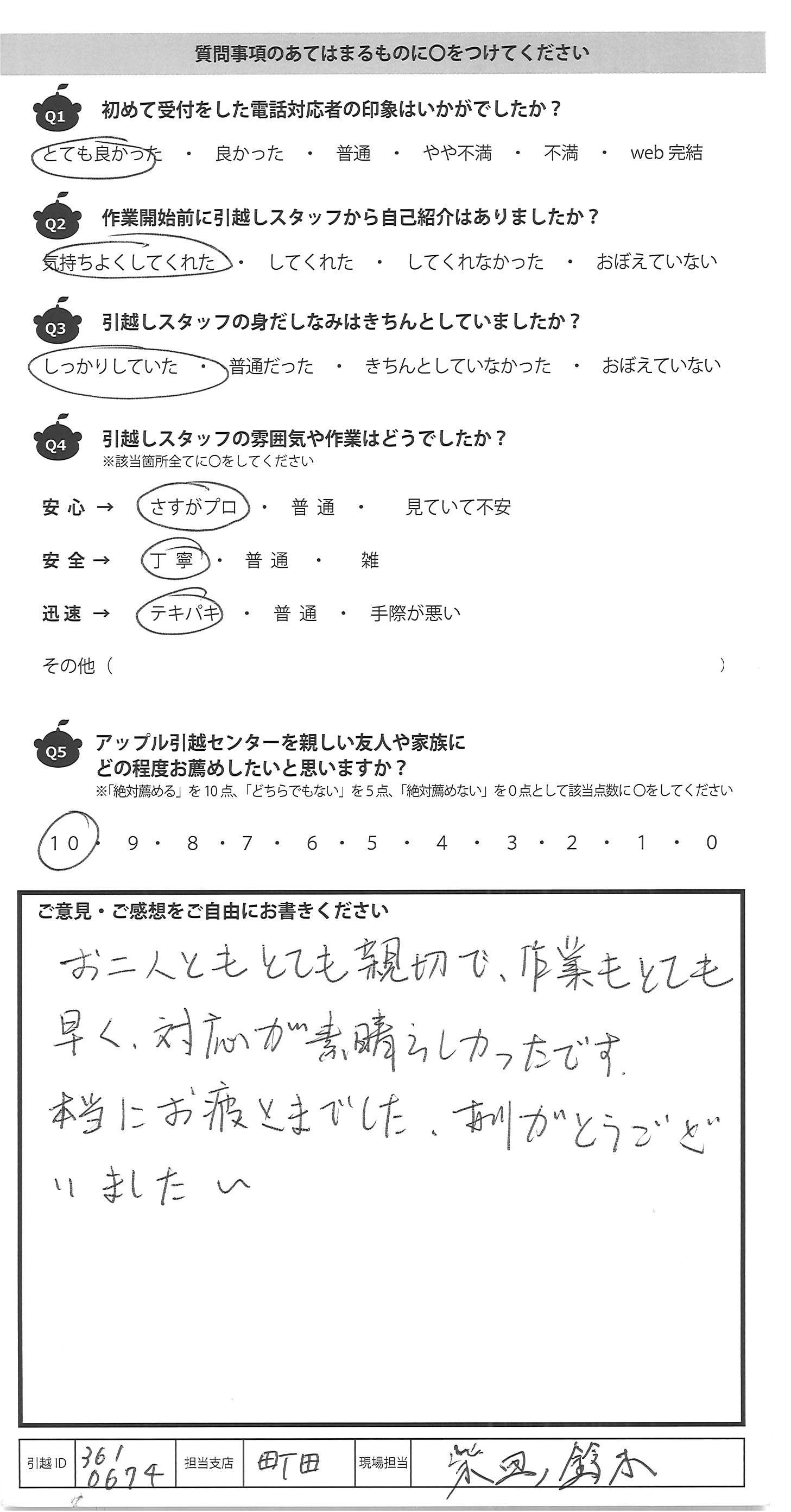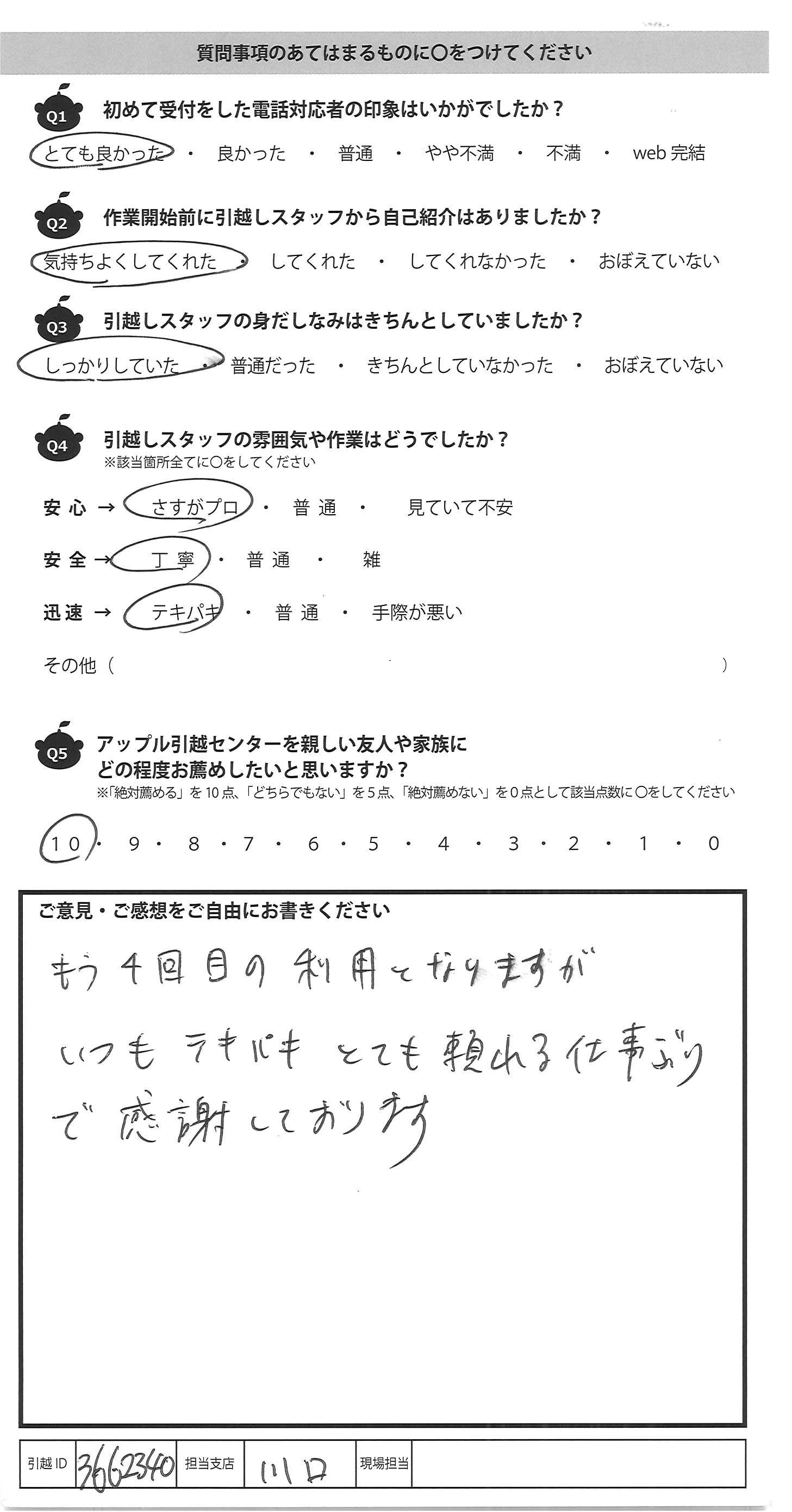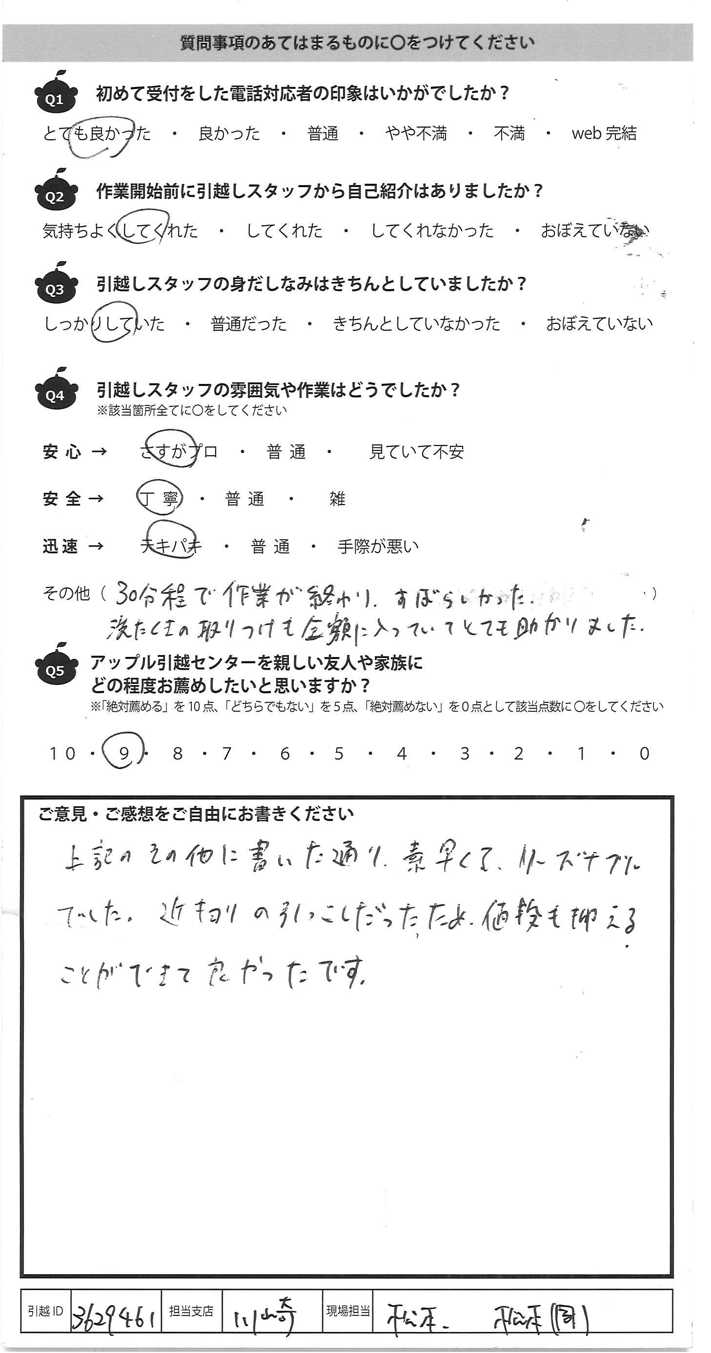 A.手際がよく、フレンドリーで とても良い引越しができました。 次もお願いしたいです。