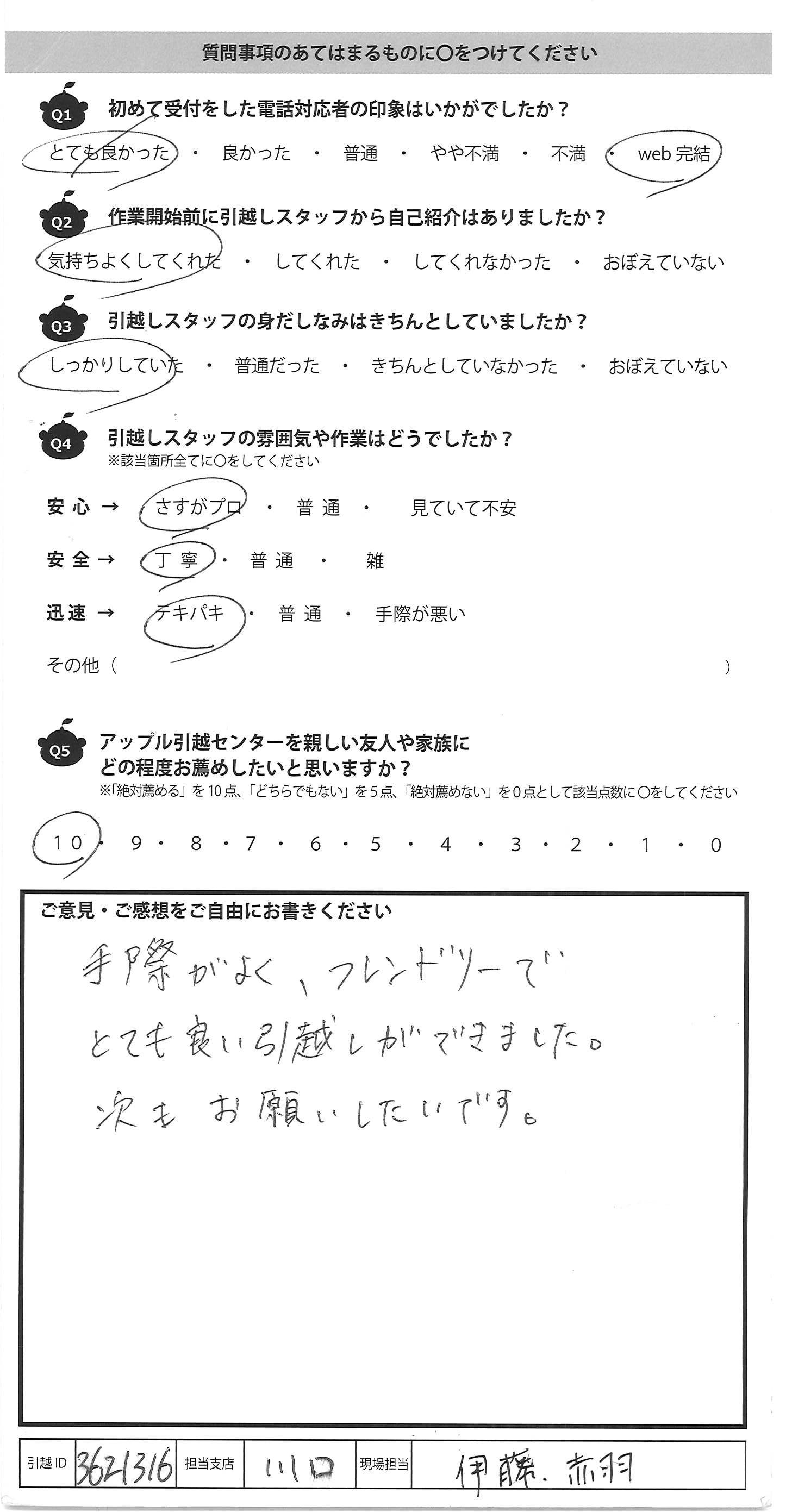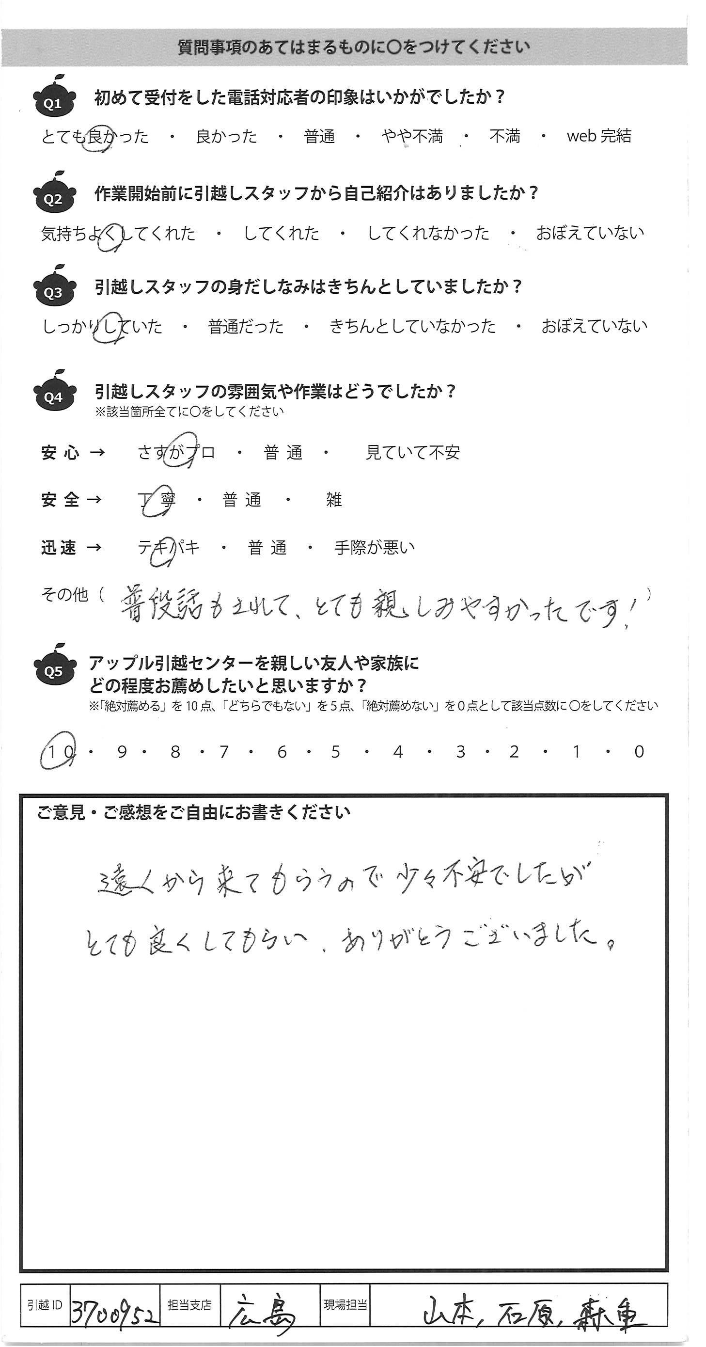 A.またもう一度引越しがあるのでしたら(しばらく無いと思うが)広島支店の山本伸郎さんがた今回の3人にまた来ていただきたいです。本当にありがとうございました、とお伝え下さい