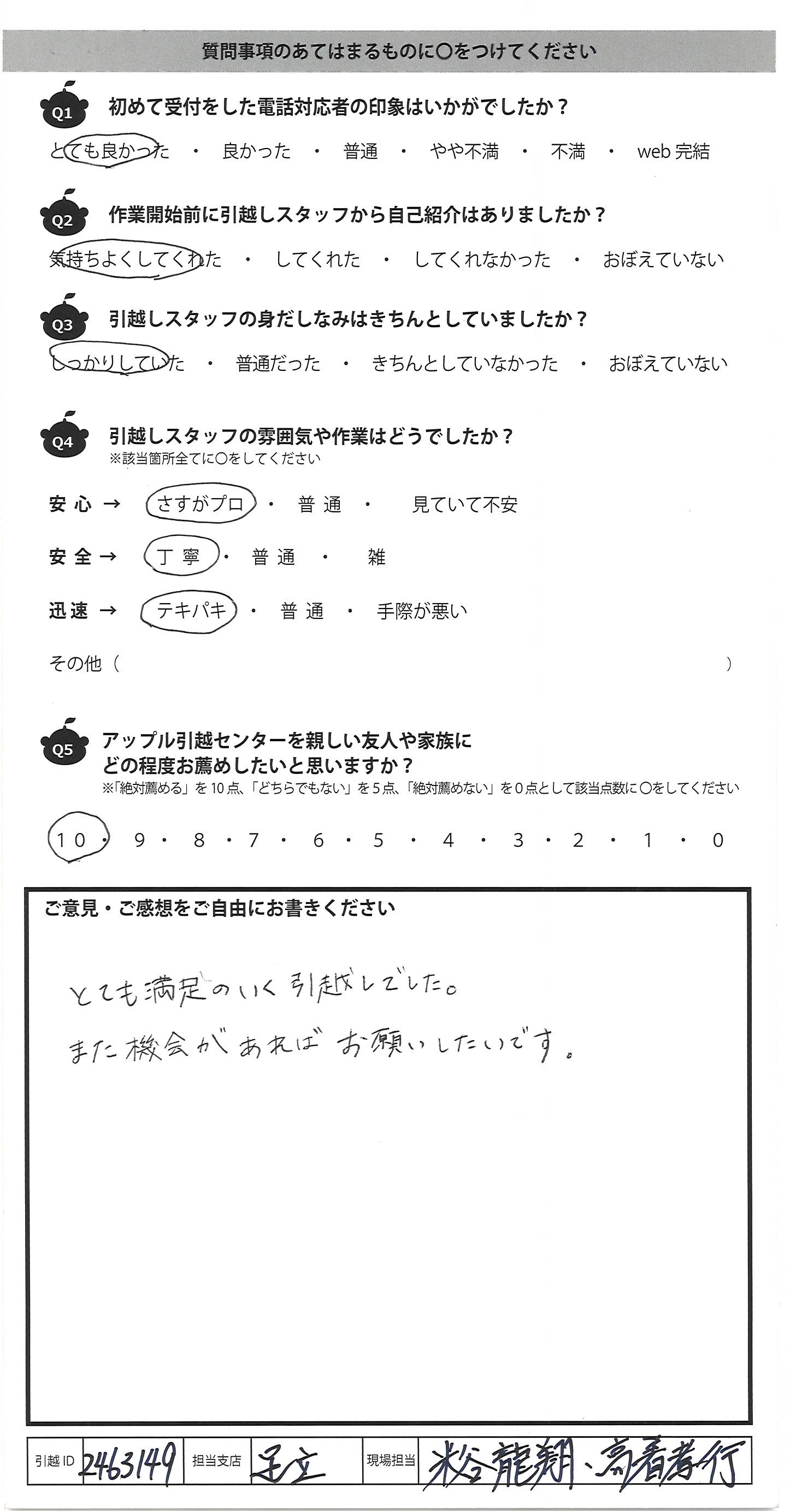 A.とても満足のいく引越しでした。 また機会があればお願いしたいです。