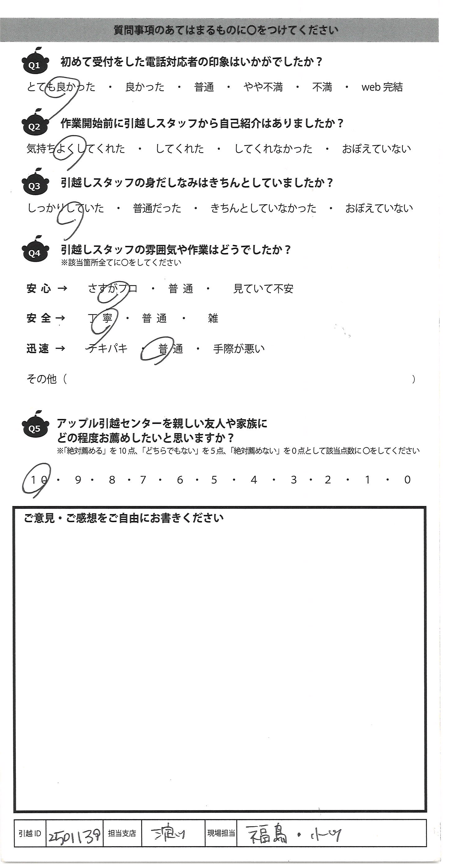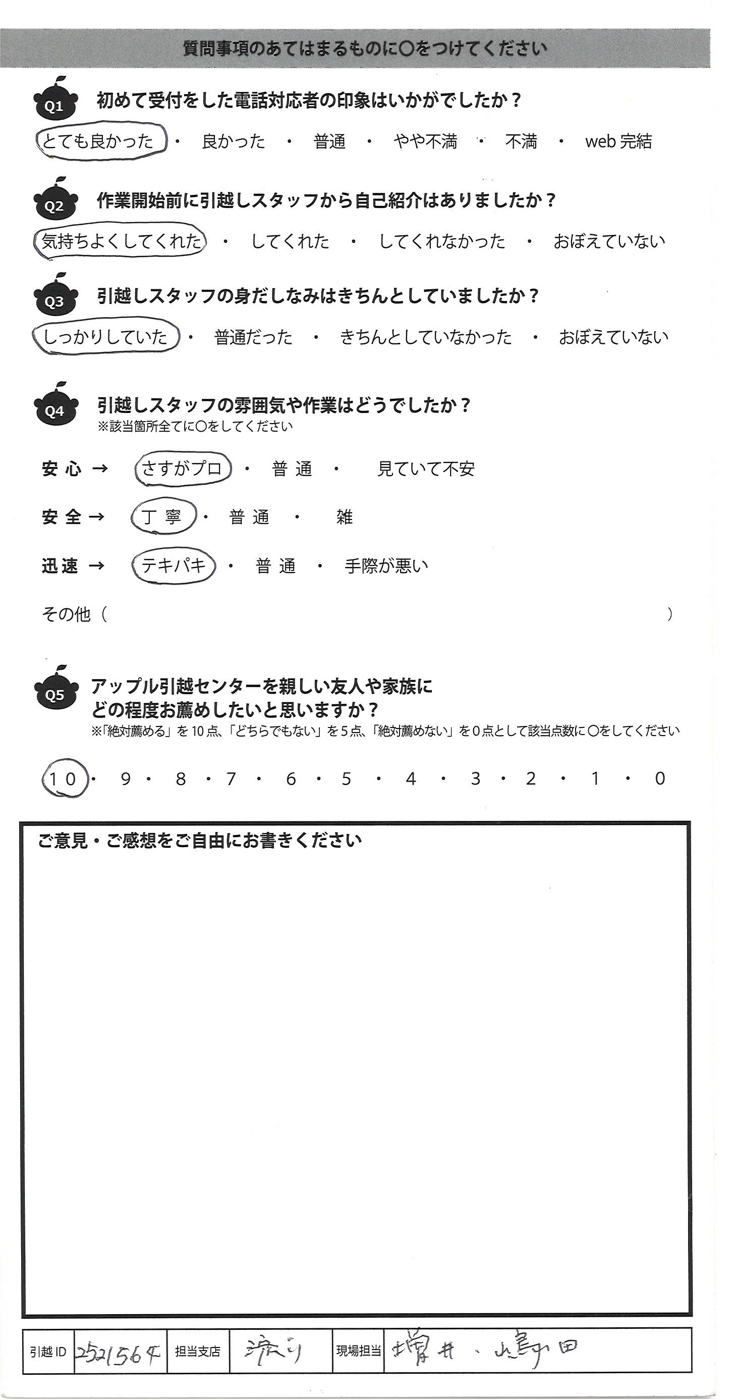 A.重い荷物や3階へ運ぶ本などたくさんあった中、 とてもスピードよく荷物を運び入れてくださりとても 助かりました。またうろうろする子供たちにも嫌な 顔せず接してくださりありがたかったです。 作業中もこちらに気をくばってくださり、すべてに おいて気持ちよく引越しをすることができました。 ありがとうございました。 (ハガキの投函が遅くなりすみません。2023、12、30)