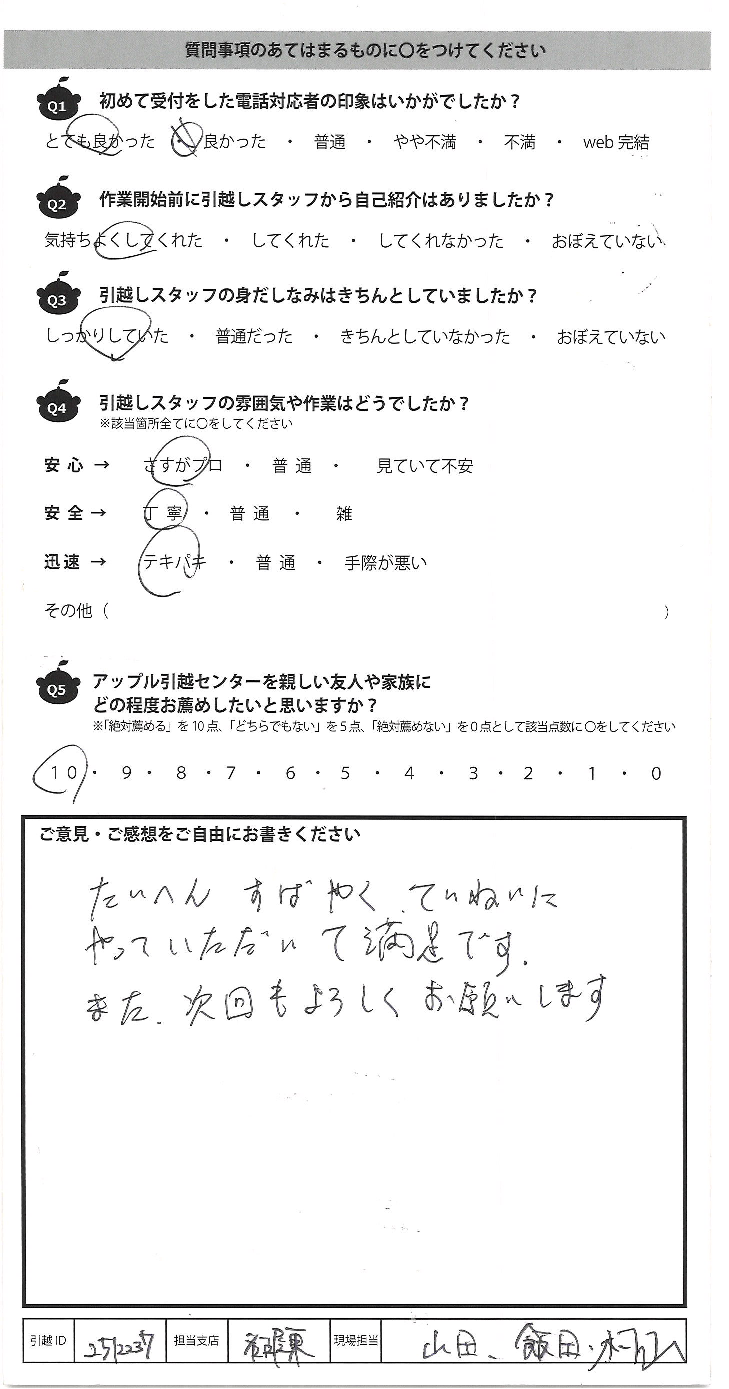 A.2度目の利用ですが、今回も迅速、丁寧、親切な 作業で大変感謝しております。 知人の引越の際もぜひ御社をお薦めしたいと 思っています。 ありがとうございました。