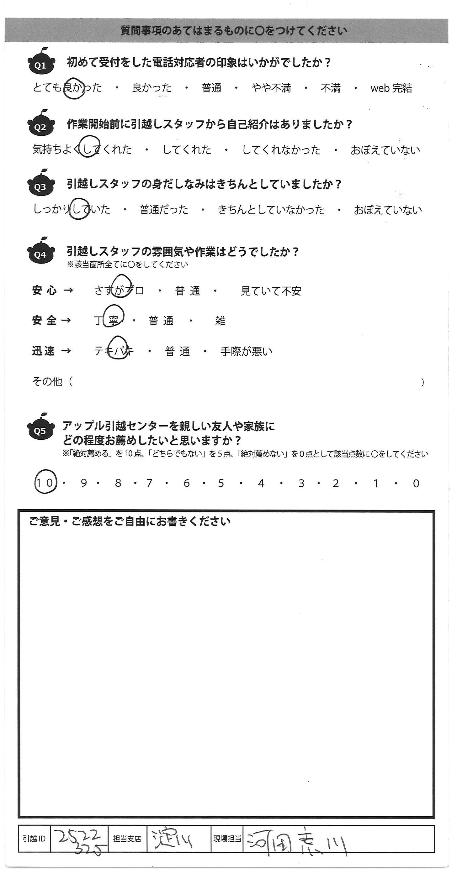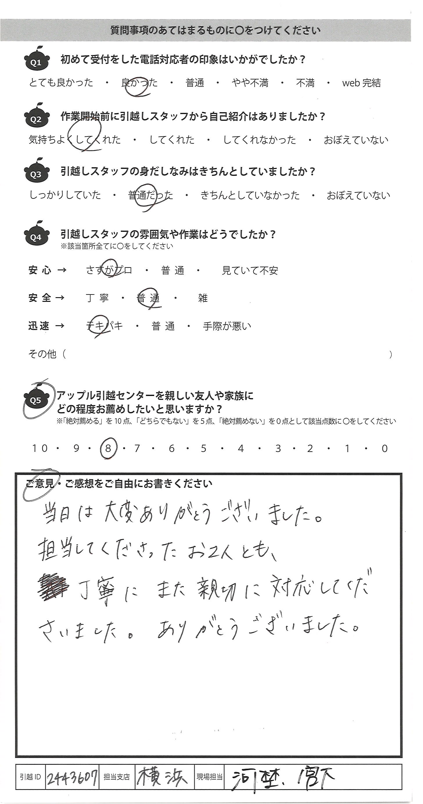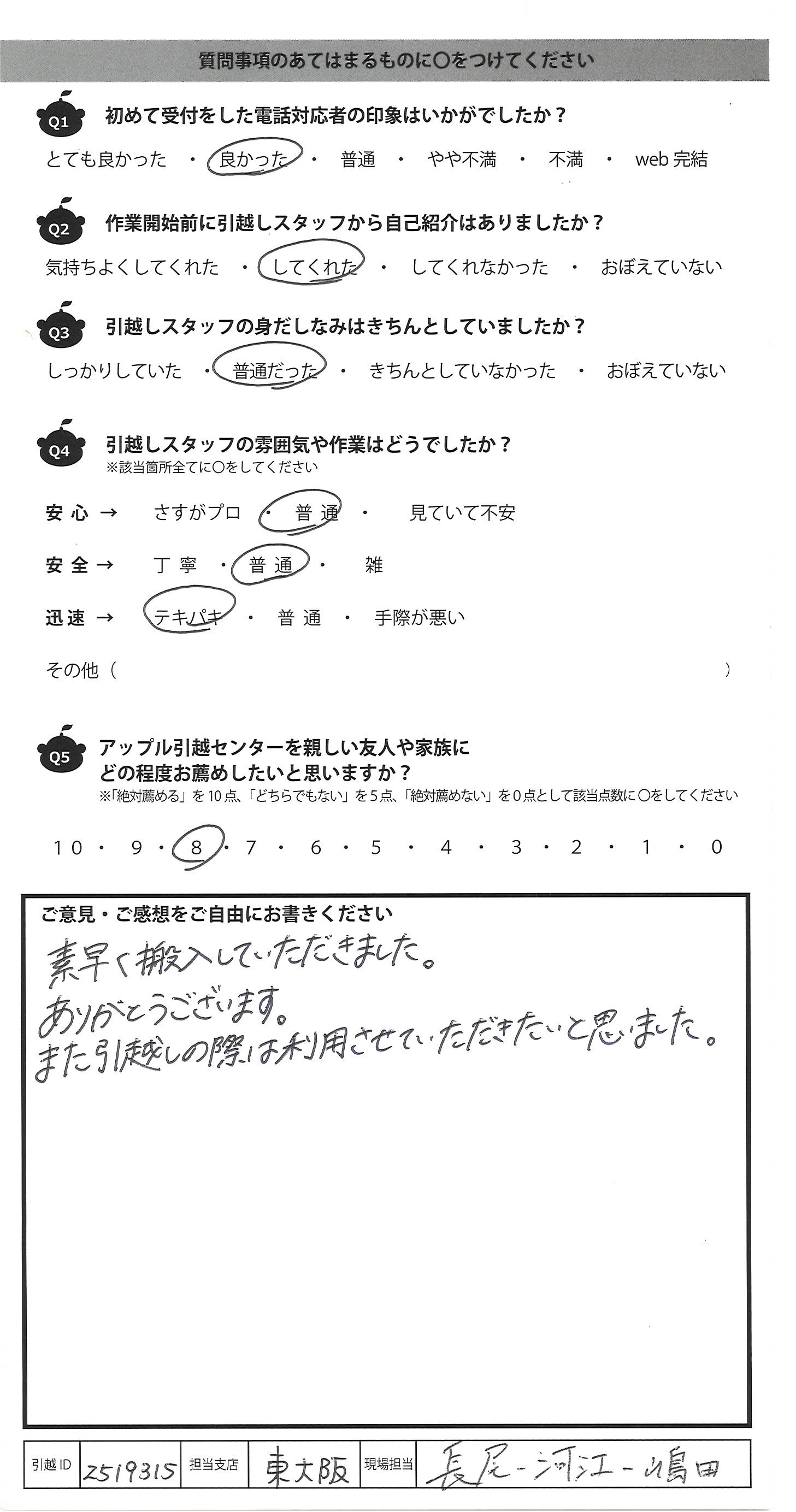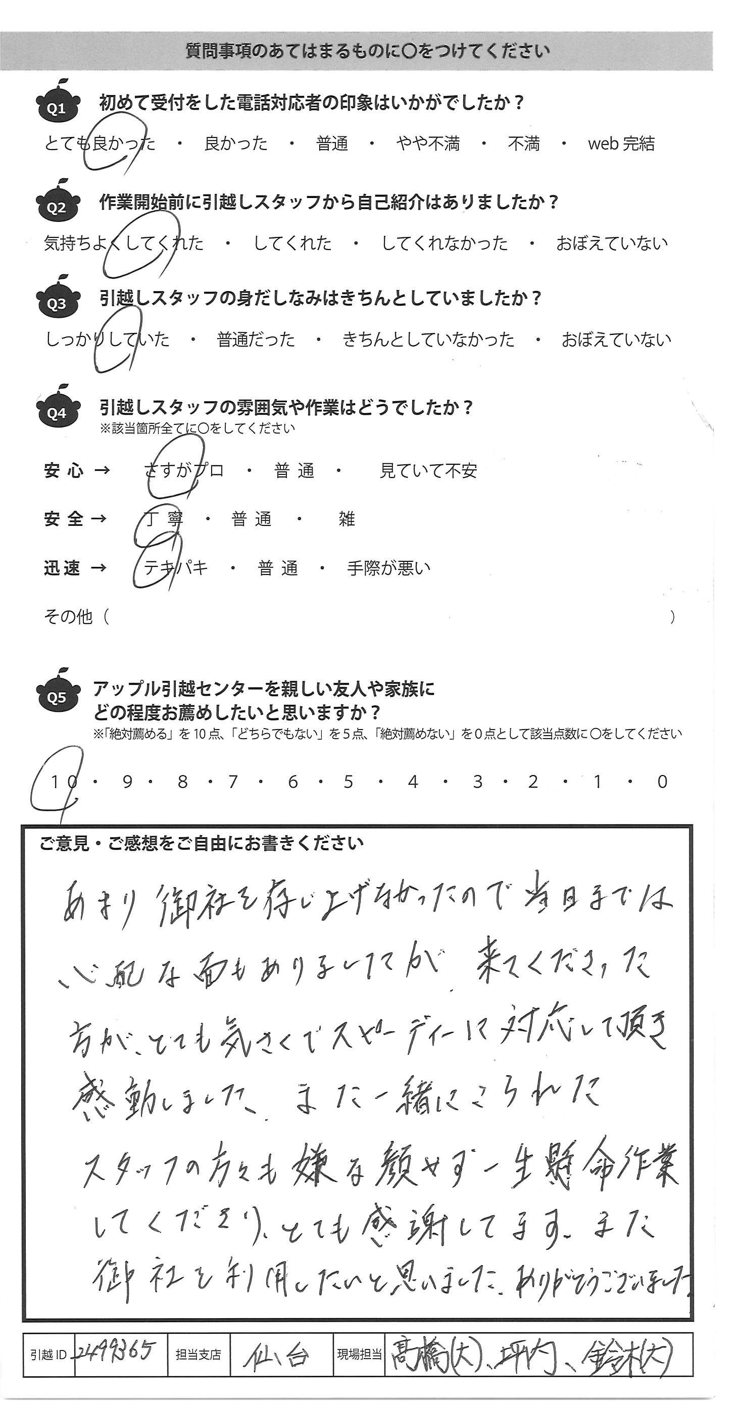 A.あまり御社を存じ上げなかったので当日までは 心配な面もありましたが、来てくださった 方が、とても気さくでスピーディーに対応して頂き 感動しました。また一緒にこられた スタッフの方々も嫌な顔せず一生懸命作業 してくださり、とても感謝してます。また 御社を利用したいと思いました。ありがとうございました。