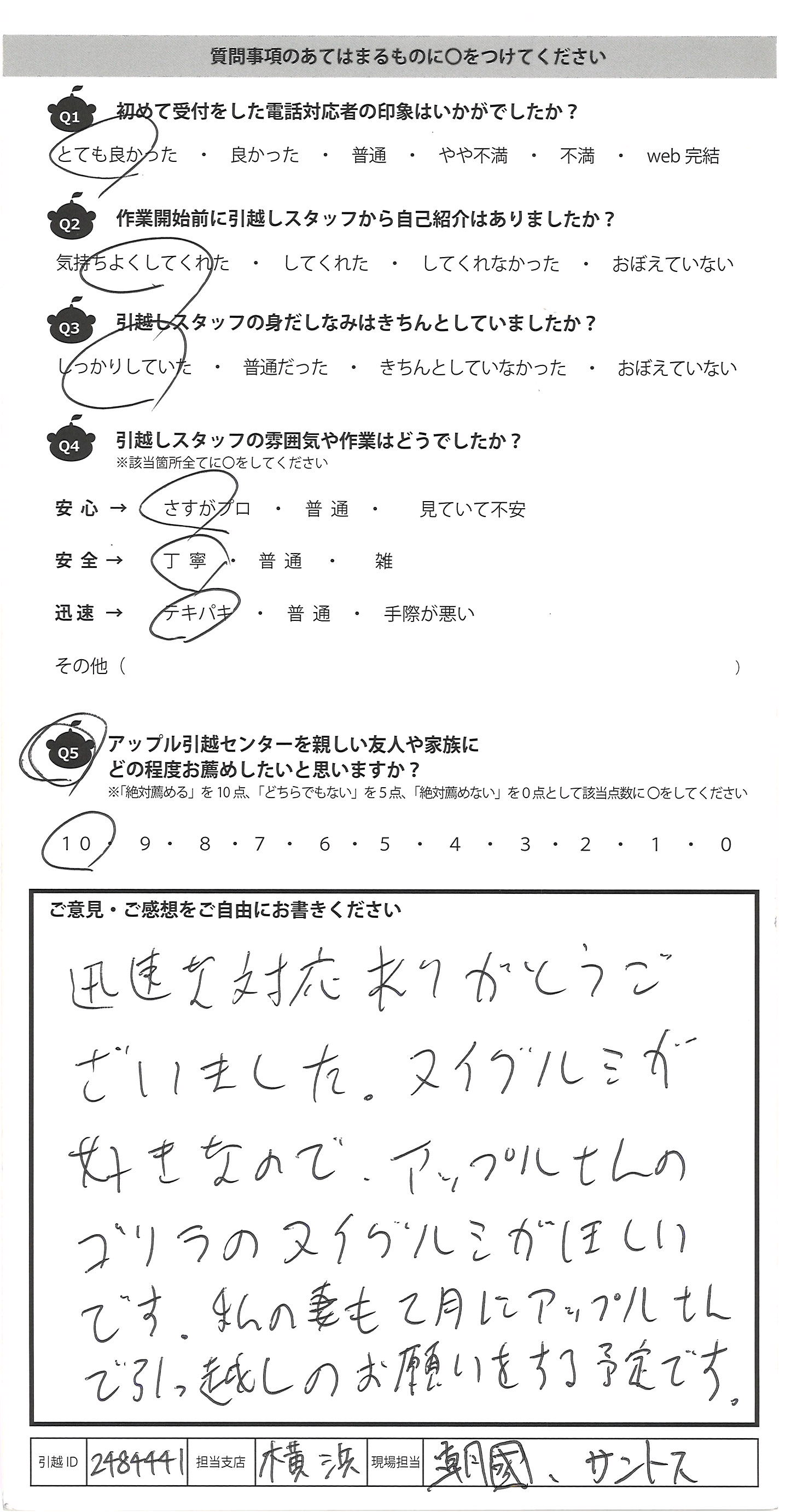 A.迅速な対応ありがとうご ざいました。ヌイグルミが 好きなので、アップルさんの ゴリラのヌイグルミがほしい です。私の妻も2月にアップルさん で引っ越しのお願いをする予定です。
