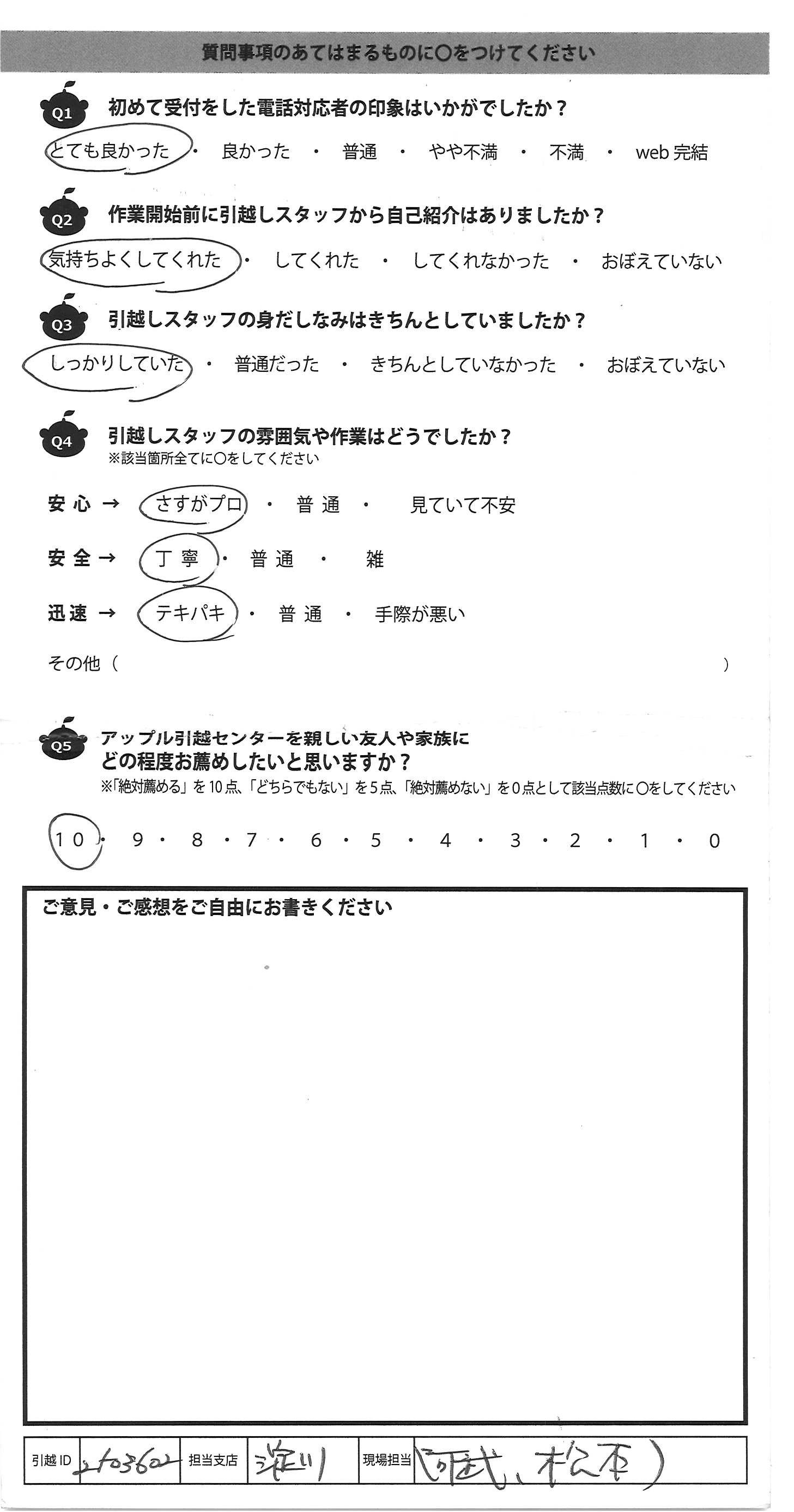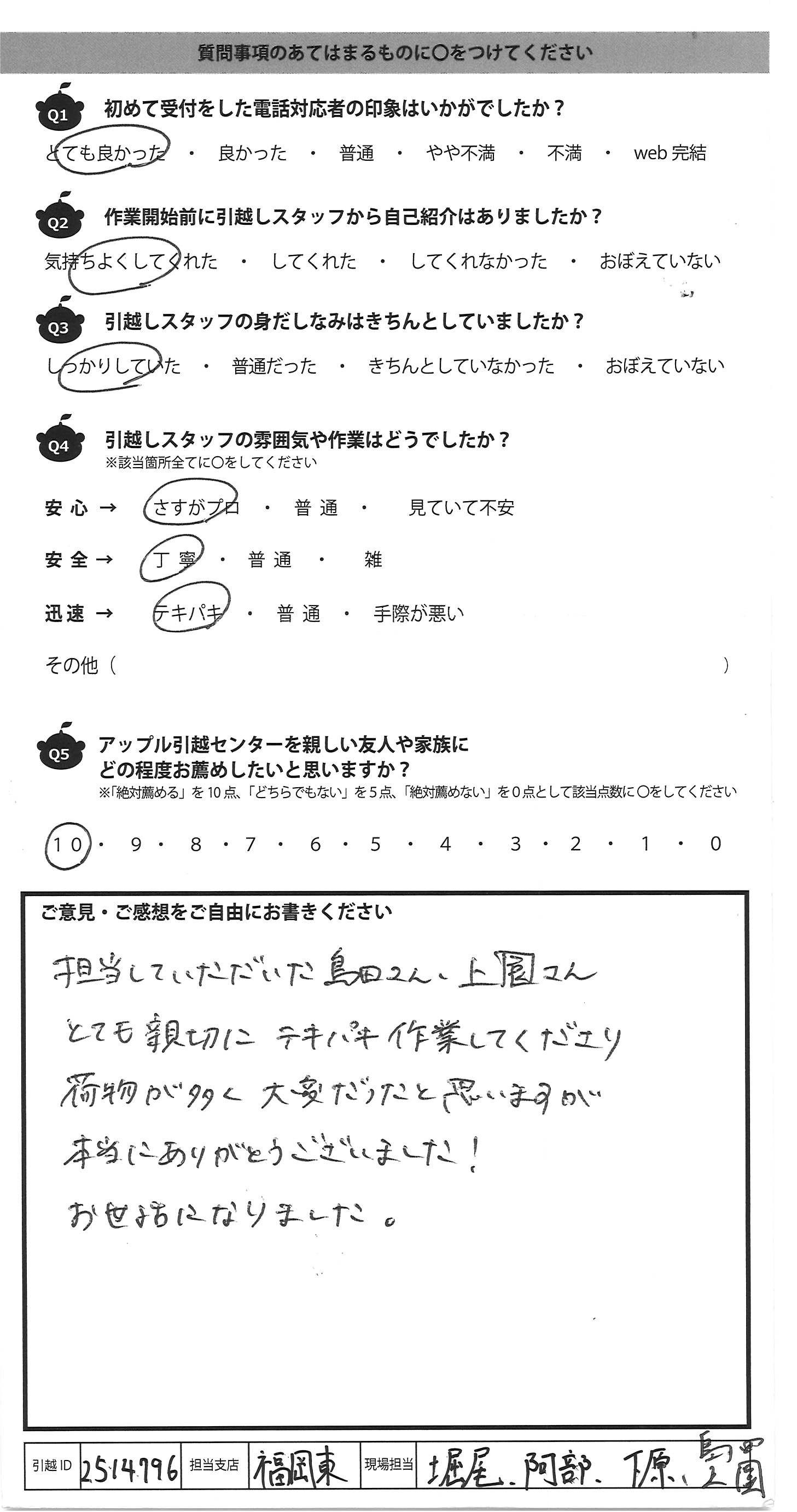 A.担当していただいた島田さん、上園さん とても親切にテキパキ作業してくださり 荷物が多く大変だったと思いますが 本当にありがとうございました! お世話になりました。