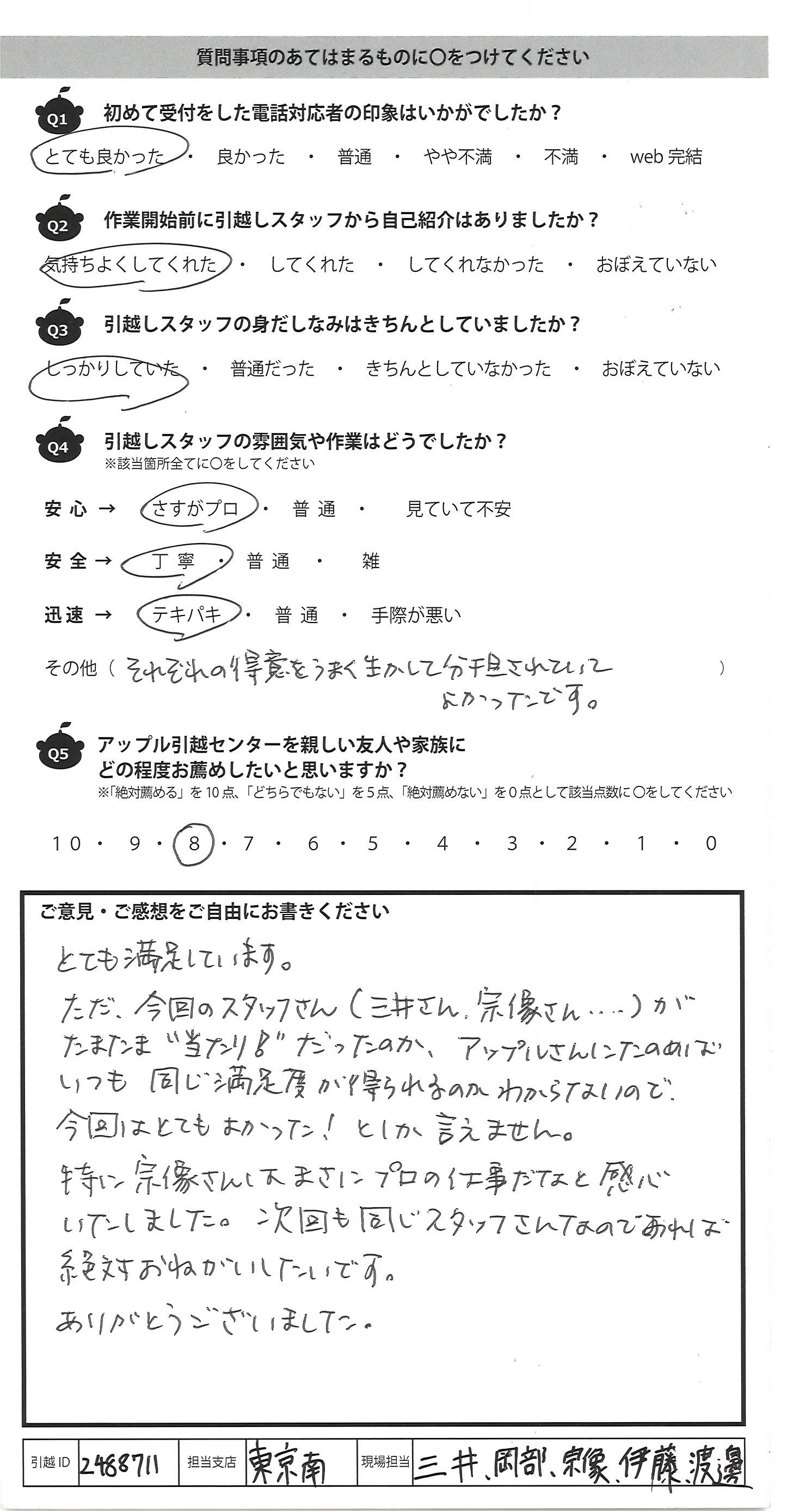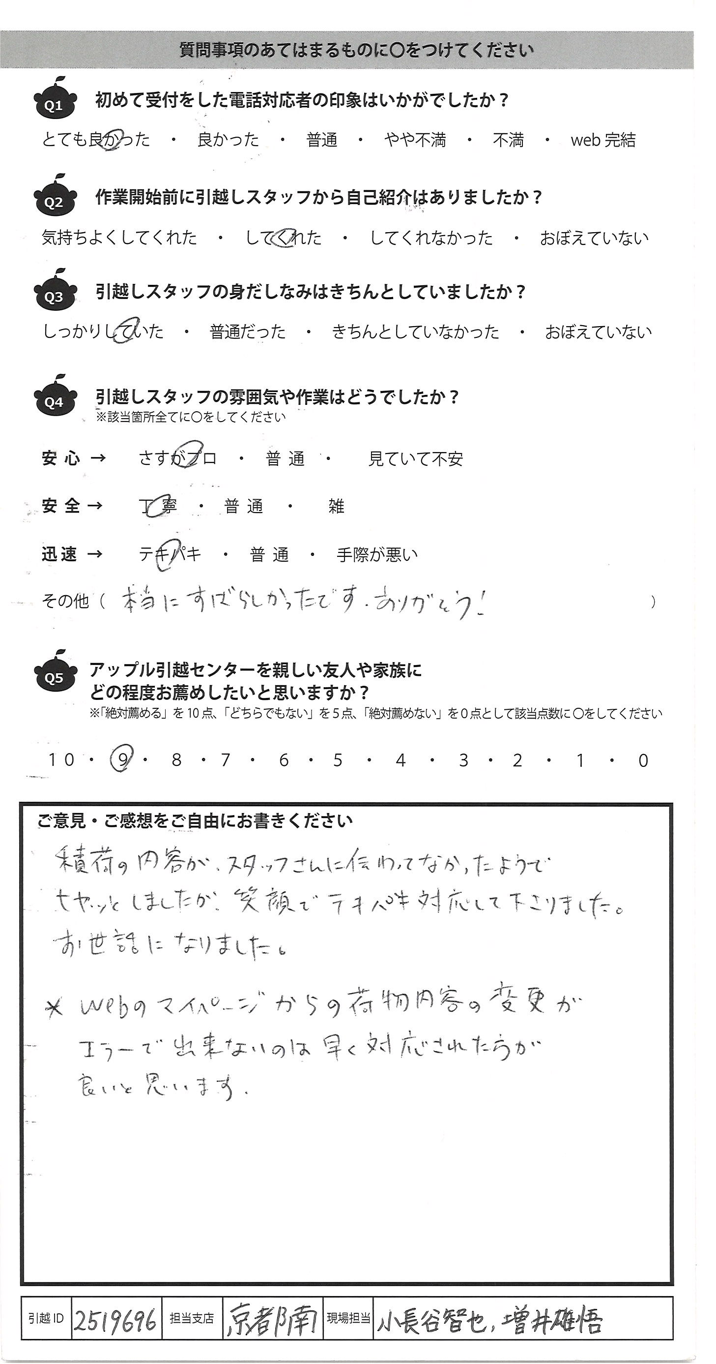 A.私は結構引越が多い方だと思います。他社さんにも色々頼みましたが、2度アップルさんにお願いしました。アップルさんはとても感じ良く、手際良く、疲れているだろうに笑顔でテキパキして、こちらの方が暖かい気持ちになりました。次回も是非よろしくお願いしたいです。
