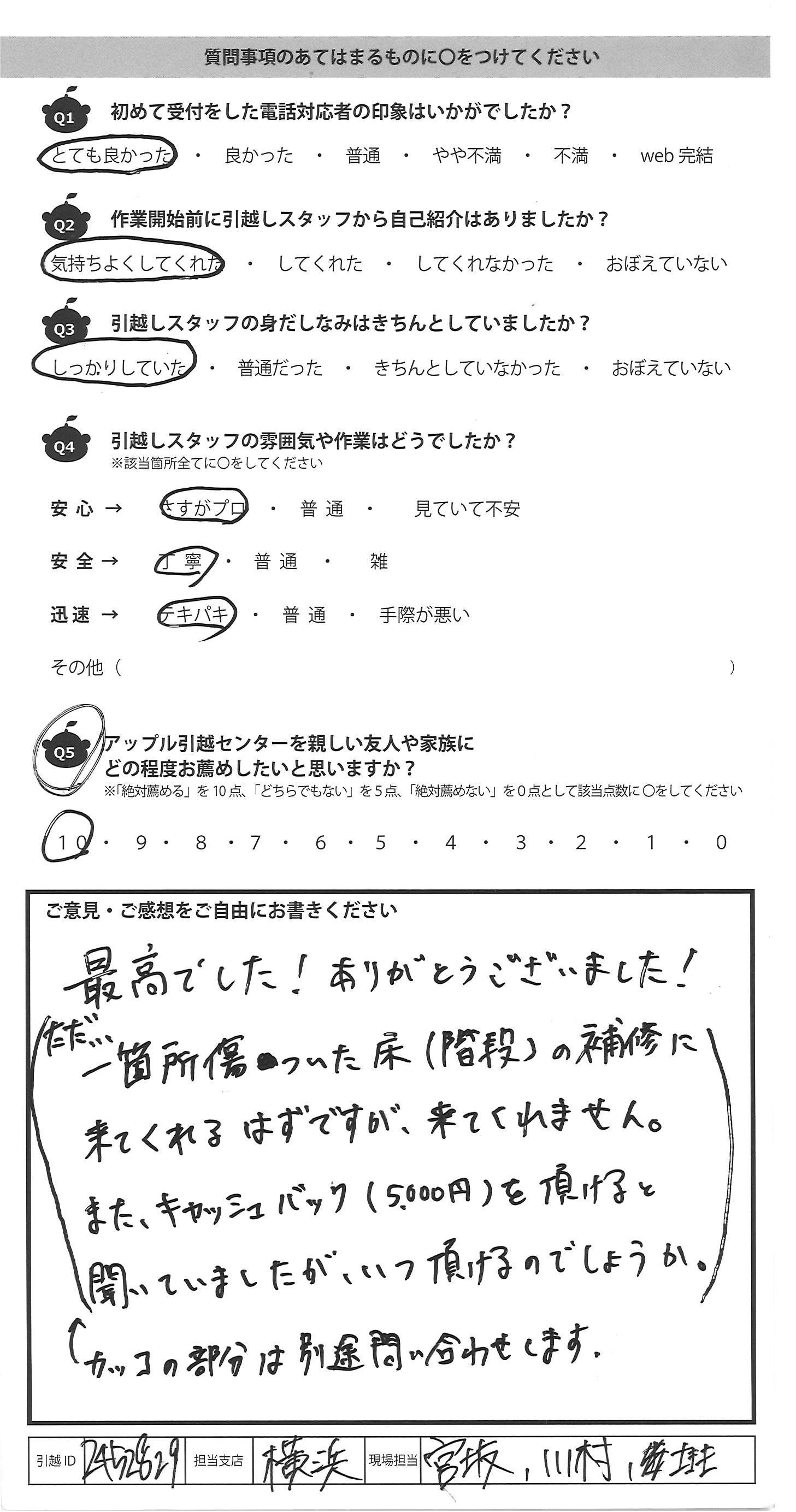 A.最高でした!ありがとうございました! ただ…一箇所傷ついた床(階段)の補修に 来てくれるはずですが、来てくれません。 また、キャッシュバック(5,000)を頂けると 聞いていましたが、いつ頂けるのでしょうか。 カッコの部分は別途問い合わせします。