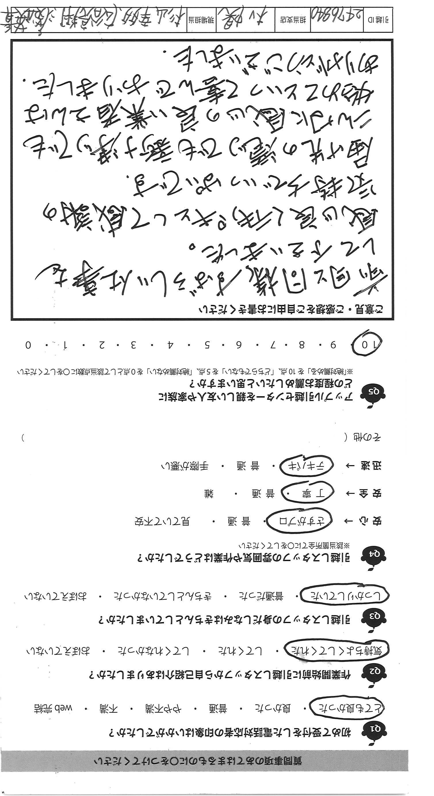 A.お世話になりました。 難しい照明の取り付けもありがとうございました。 1点、気になったことです。 作業中、部屋の外で部下に叱責している声が客に聞こえてきました。 ドアを全開にして作業をするので、声が聞こえてしまいます。 より良いサービスのために、部下の成長のための叱責であることは承知しています。 しかし、その声が客に聞こえてしまうと、非常に不快な気分になってしまいます。 いくら客に丁寧に対応していても、「ああ、この人接客のときは態度良いけど、こんな風に怒る人なんだ…」と少し落胆してしまいます。 叱責するなら、トラックの中・作業後など、絶対に客の耳に入らない状況でしていただきたい。 客も人間なので、すごく緊張してしまいました。 それ以外は良かったです! 客がより気持ちよくなるようなサービスをお待ちしております! それでは、good luck!