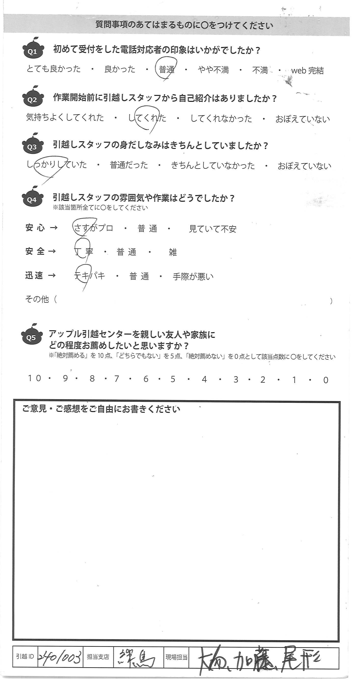 A.今までの引越し業者で一番よかった。 最高でした! 友人にも薦めます。 ありがとうございました。
