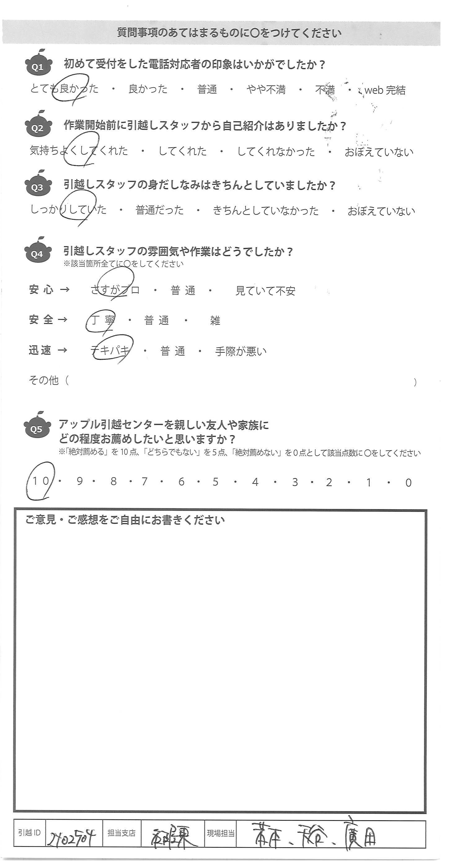 A.動画投稿サイトで紹介されていたのをきっかけに今回初めて利用させていただきましたが、web受付時の返信の早さ&丁寧さ(特に人が交代しても文面が大きく変わることが無く会話がスムーズだった点がよかった)、当日の対応の明るさ&安心感(メインで応対してくれた方は勿論、ペアの方もテキパキと動いていらして、話し掛けた時もしっかりと返してくれて非常に頼もしかったです)共にとてもよかったです。 ひとつだけ要望?があるとすれば、無料で用意してもらったクラフトテープに関してです。 よくみるガムテープや養生テープよりも幅がかなり狭く、段ボールの組み立てに慣れていない身では綴じ目を塞ぐ際にはみ出さないように真っ直ぐ貼るのがかなり難しかったです。 同居人に押さえてもらえば普通に貼れましたが、1人でさくっとやりたい時もあったので結局は面倒になり幅が広いクラフトテープを近所で買い足しました。 主にこちらの不器用さの問題だと思うので(笑)文句?クレーム?とかではないのですが、今後機会があったら知人などにも進めたいなと今回思ったので書かせていただきました。 荷造りがだいぶ苦だったのですが、段ボールの可愛さにずいぶんと助けられた気がします。本当にお世話になりました。