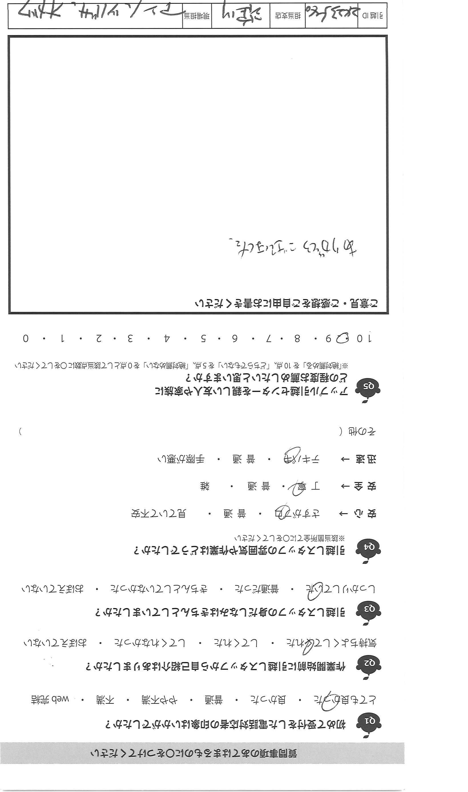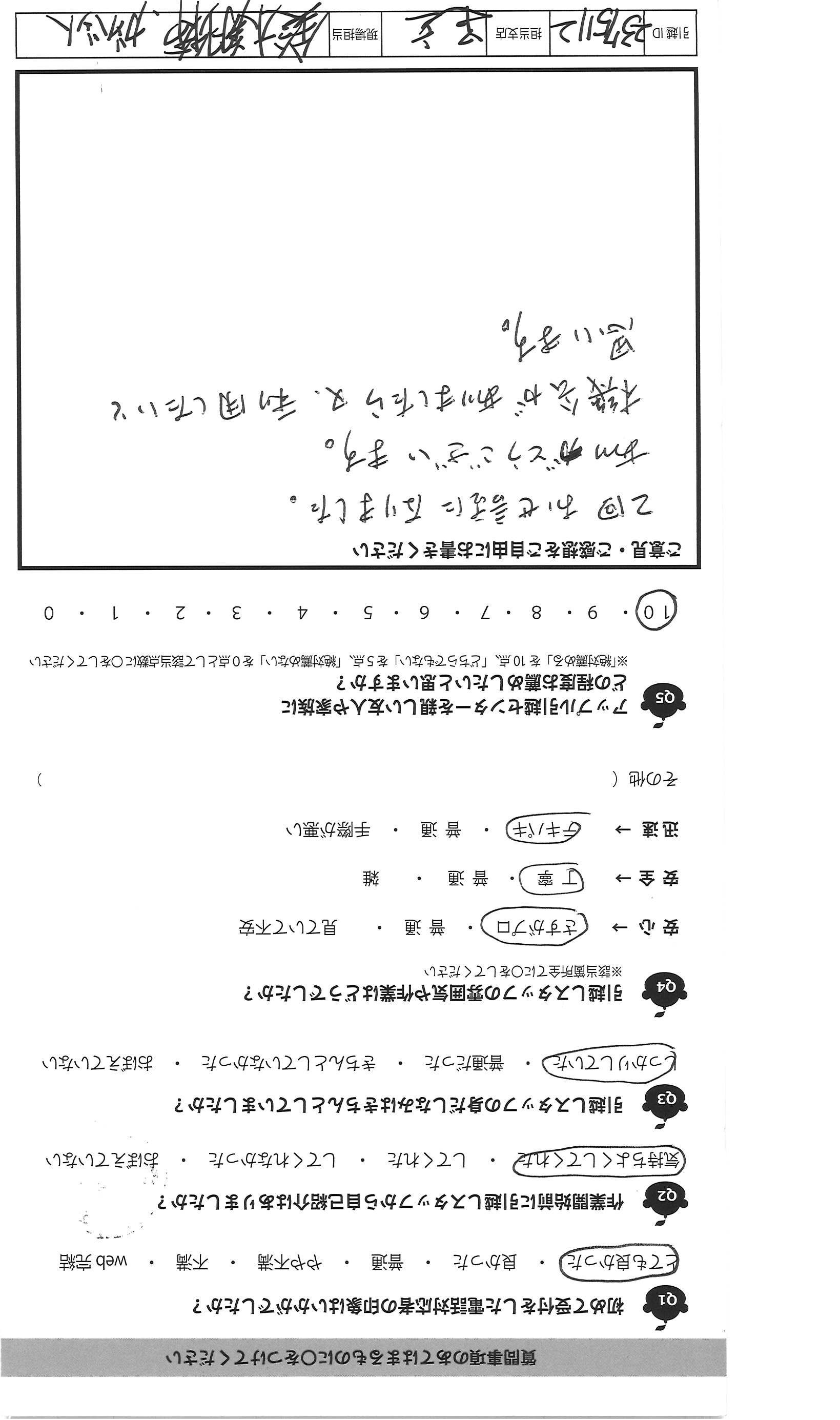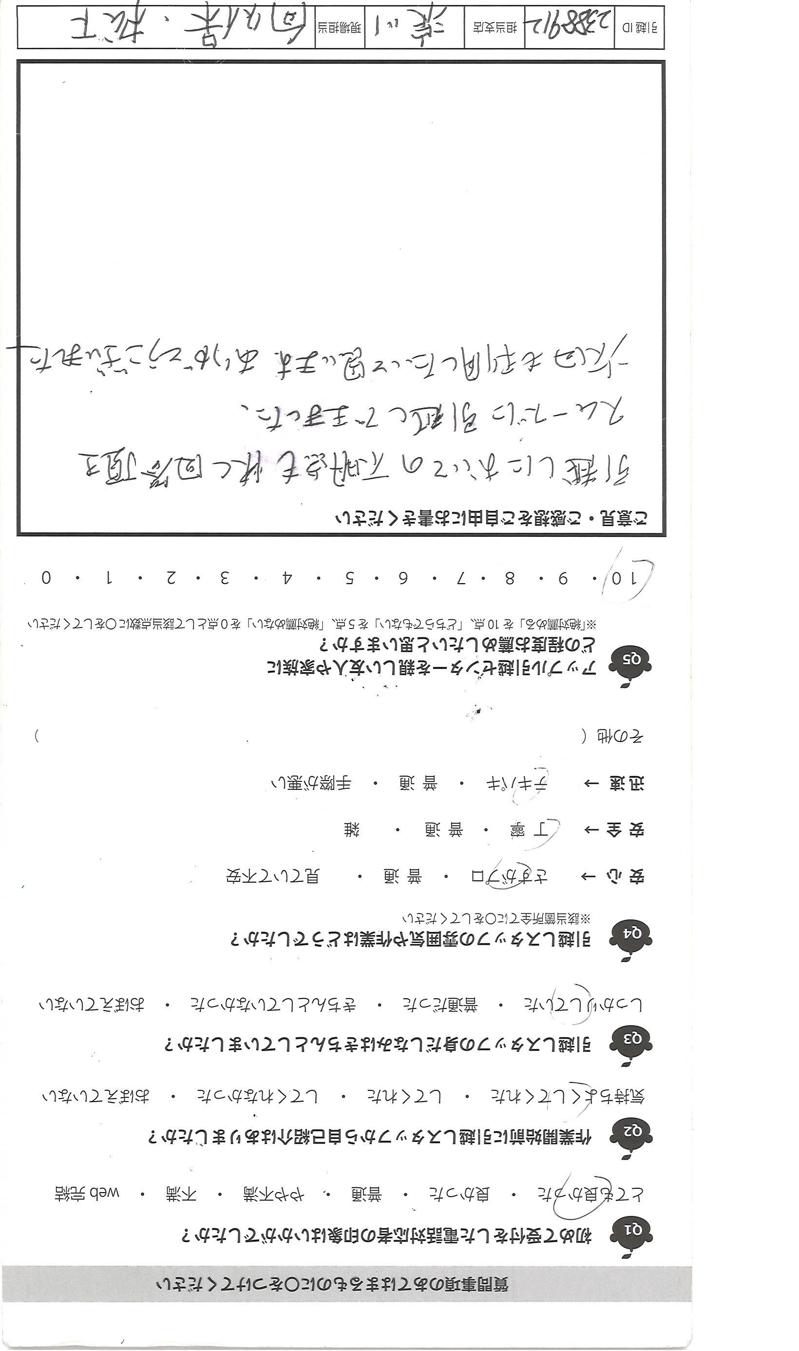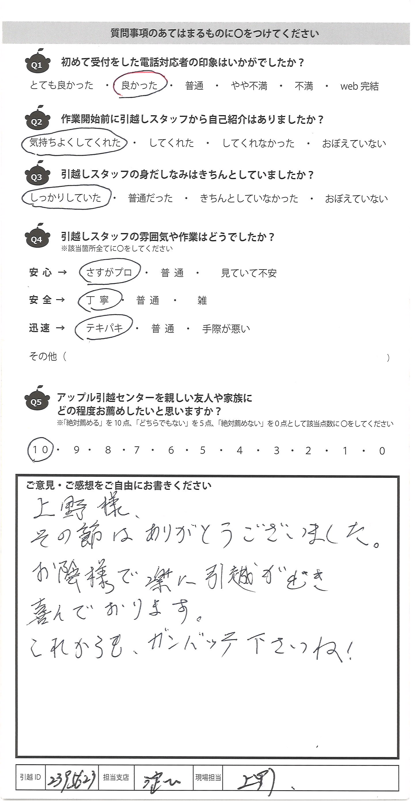 A.大変失礼ですが、始め聞いた事のない会社でしたが、見積りの 段階でリモートでしてくれたのが大手と御社の2社、これも企業努力 だと思いました。見積り内容も詳しく分かりやすく、少し不安もあり ましたが、依頼する事にしました。5年で3回引越しをしましたが、 「この箱、番号が書いてないのですが、どの部屋に運びますか?」とていねい に聞いて下さる所はなかったです。子供と一緒でしたが、人見知りの 3才の子供にもやさしく切して下さり、好印象でした。 中には見積りに来た人が片手で名紙を渡し、家に入ると「あと何社 見るのですが?うちで決めたら安くします」と特に見積りも出さず帰った 会社がありましたが、悪い印象でした。みなさん人が良さそうなので きっといい会社なのだと思いました。希望は食器等の梱包資材がもう 少しフカフカな物になる事と、担当の方の休息をもっとあげて ほしいです。(グッチっておられたわけではないです)