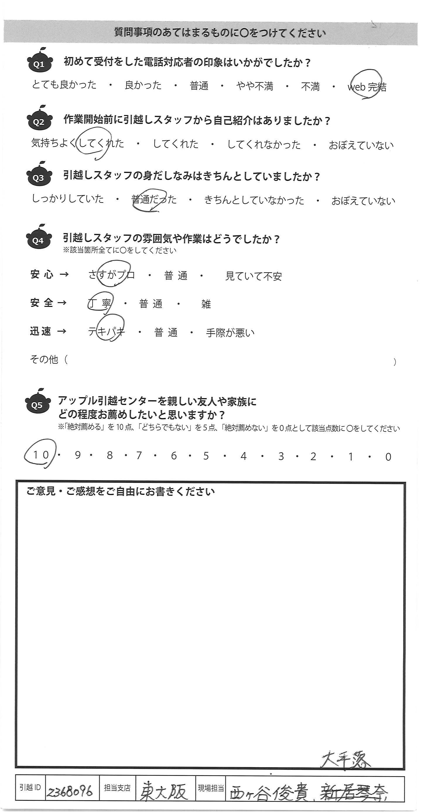 A.是非ともまた機会があればご利用させて頂きたいと思いました。引越し前の慌ただしい中、貴社の料金体系が明確なシステムについても非常に助かりました。ありがとうございます。