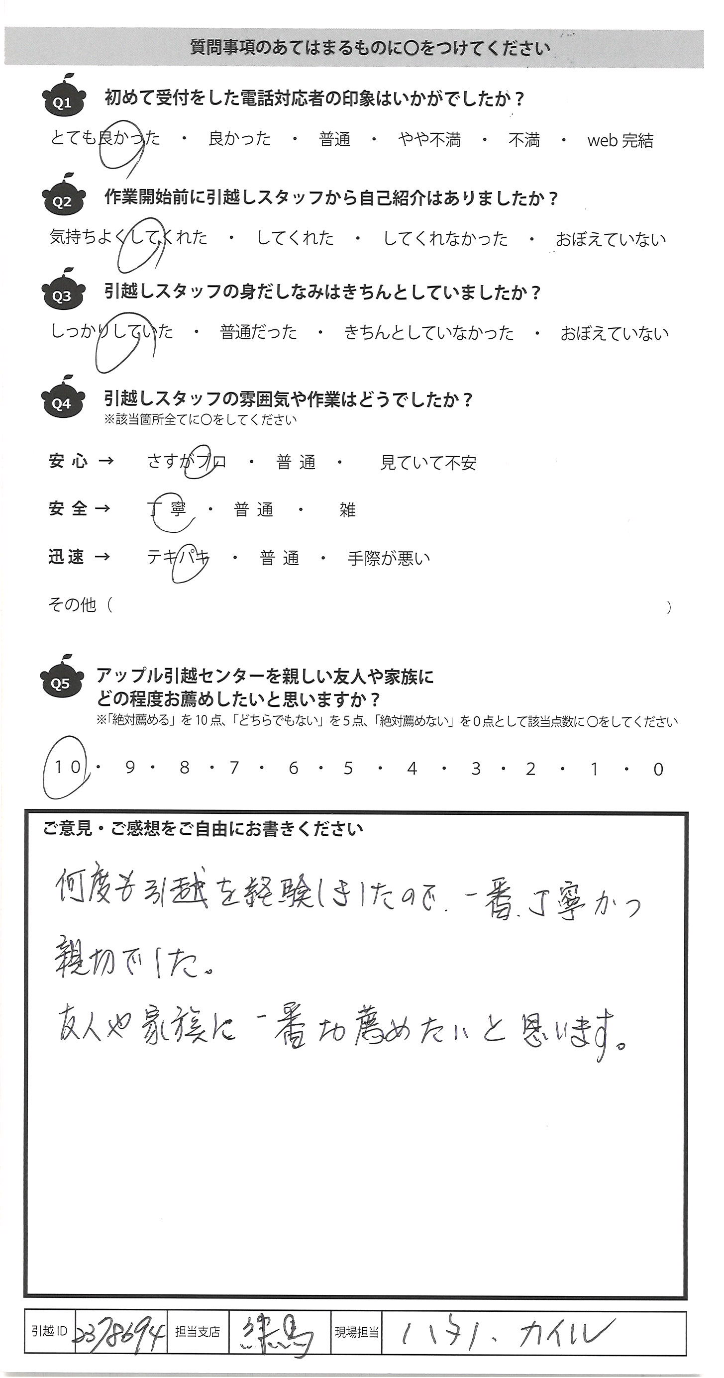 A.何度も引越を経験しましたので、一番丁寧かつ 親切でした。 友人や家族に一番お薦めしたいと思います。
