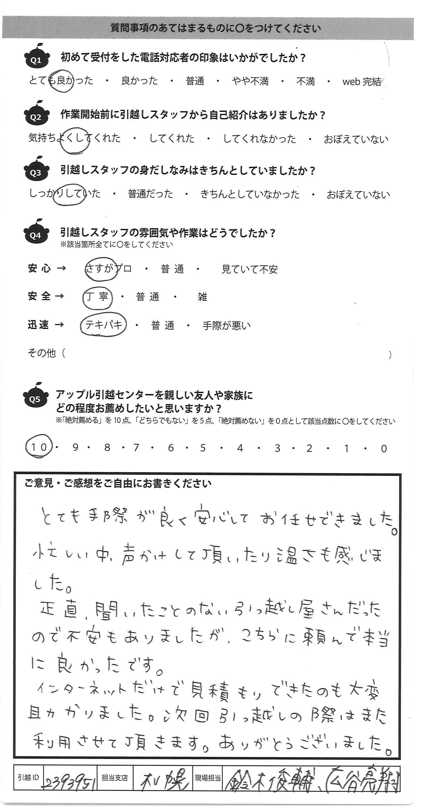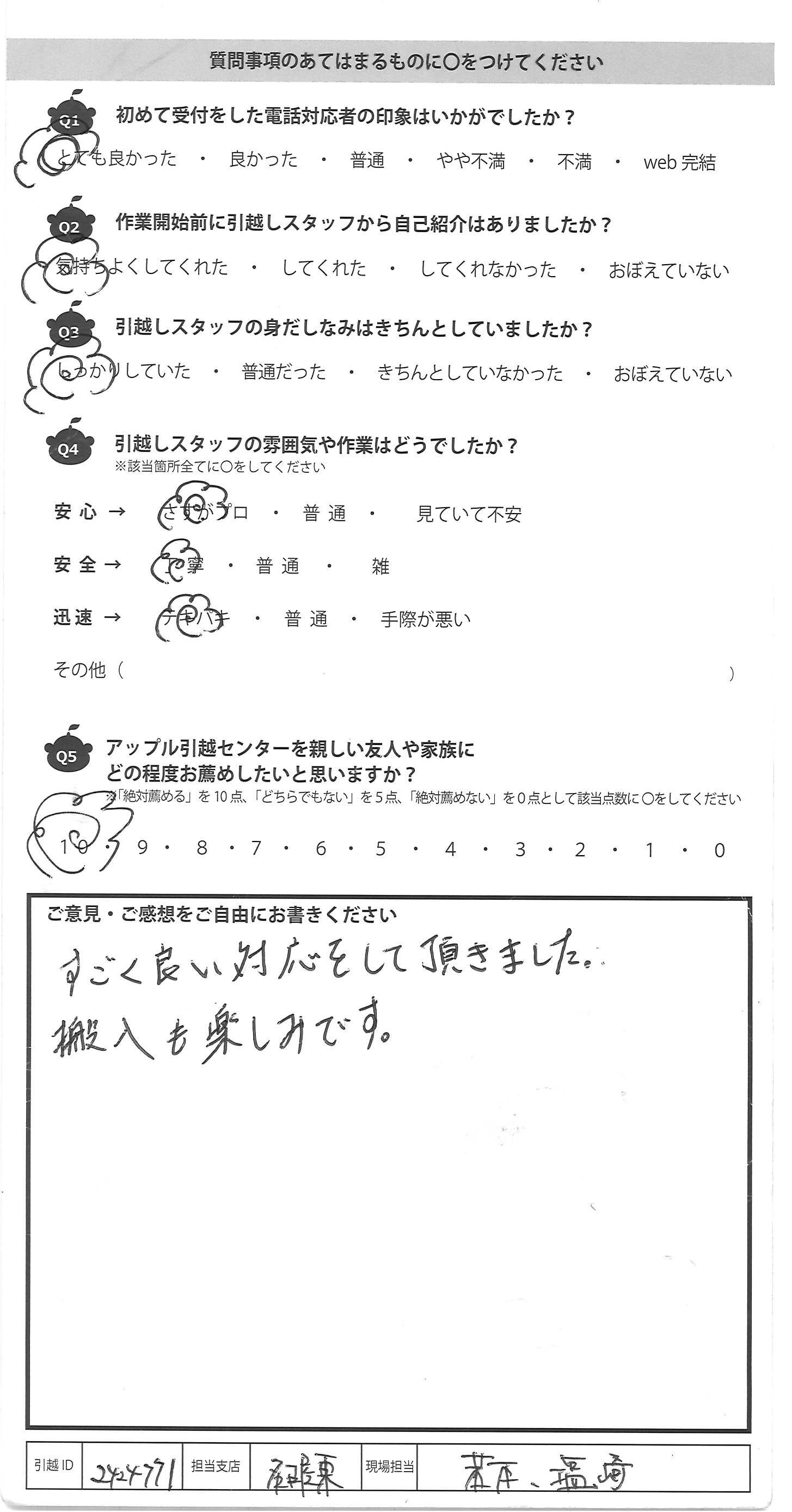 A.感じのいい方々でした。 大変な作業の中親切に対応して頂き感謝しております。 ありがとうございました。
