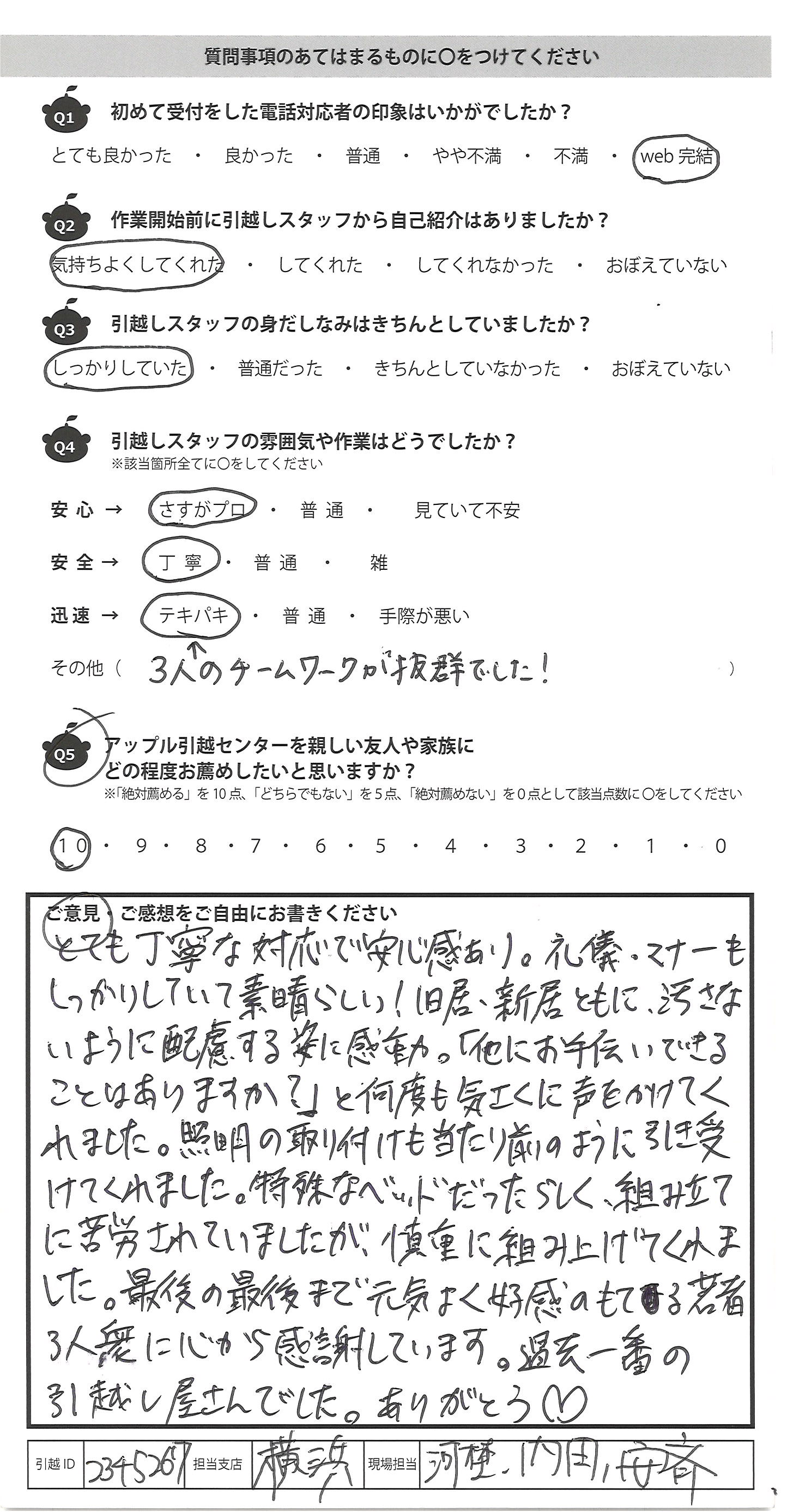 A.とても丁寧な対応で安心感あり。礼儀・マナーも しっかりしていて素晴らしい!旧居、新居ともに、汚さな いように配慮する姿に感動。「他にお手伝いできる ことはありますか?」と何度も気さくに声をかけてく れました。照明の取り付けも当たり前のように引き受 けてくれました。特殊なベッドだったらしく、積み立て に苦労されていましたが、慎重に組み上げてくれま した。最後の最後まで元気よく好感のもてる若者 3人衆に心から感謝しています。過去一番の 引越し屋さんでした。ありがとう