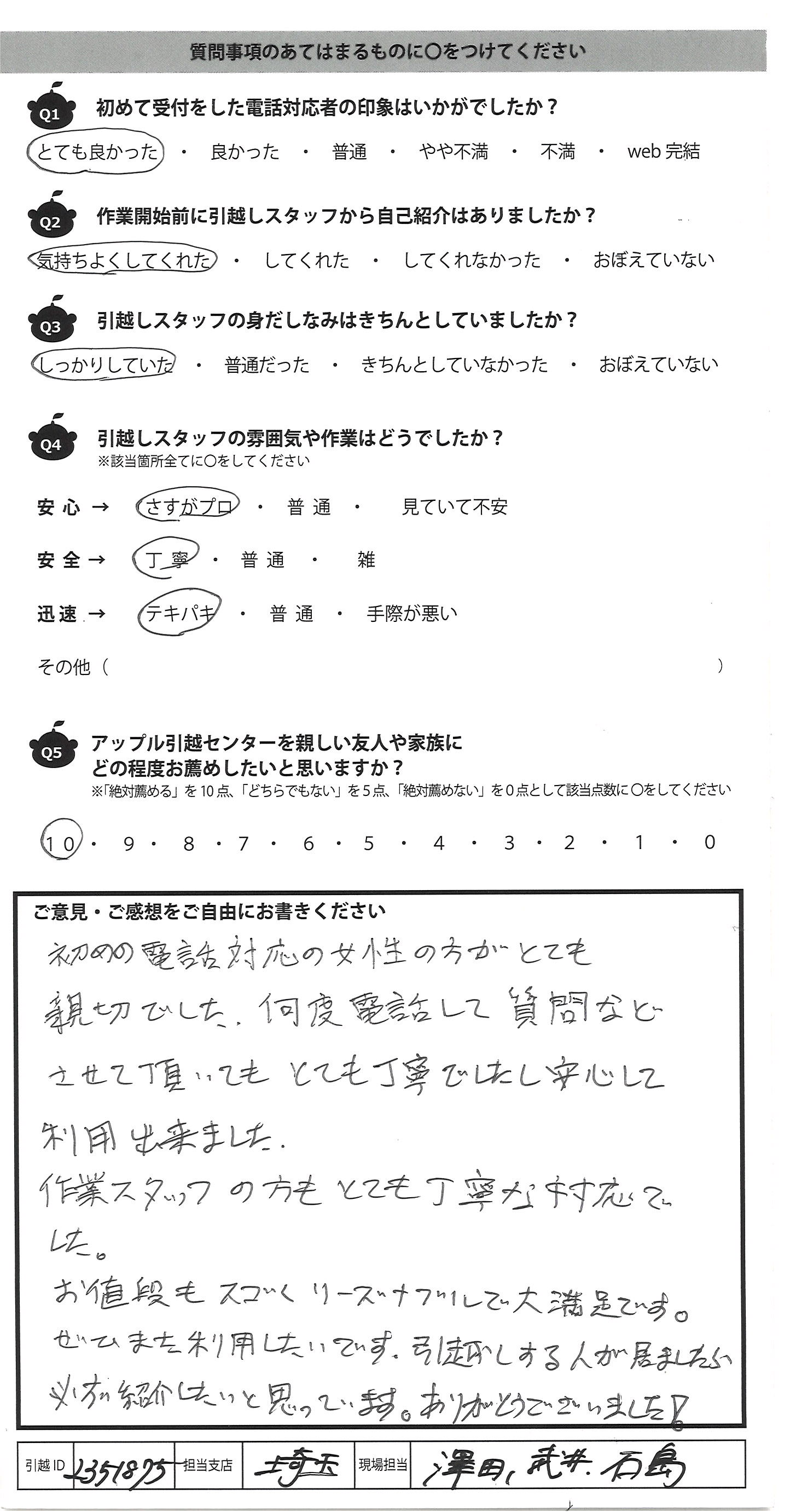 A.初めの電話対応の女性の方がとても 親切でした。何度電話して質問など させて頂いてもとても丁寧でしたし安心して 利用出来ました。 作業スタッフの方もとても丁寧な対応で した。 お値段もスゴくリーズナブルで大満足です。 ぜひまた利用したいです。引越しする人が居ましたら 必ず紹介したいと思っています。ありがとうございました!