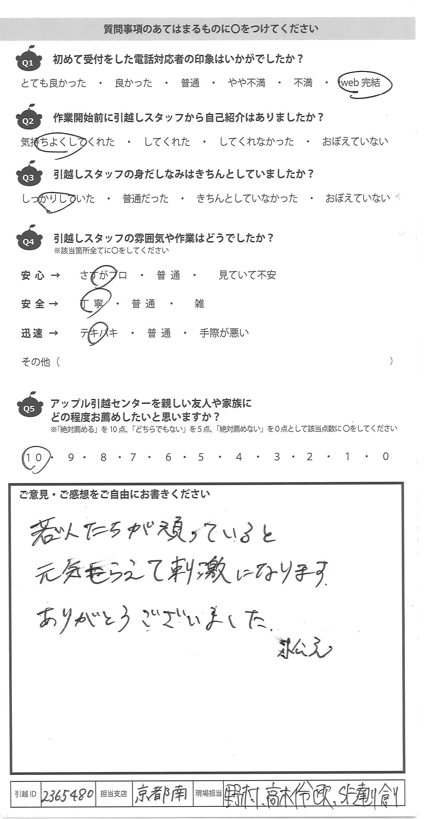 A.迅速に対応いただき、 不安に感じていた引越しが あっという間に終わり、とても助かりました。 ありがとうございます。 また知人にも紹介したいと思います。