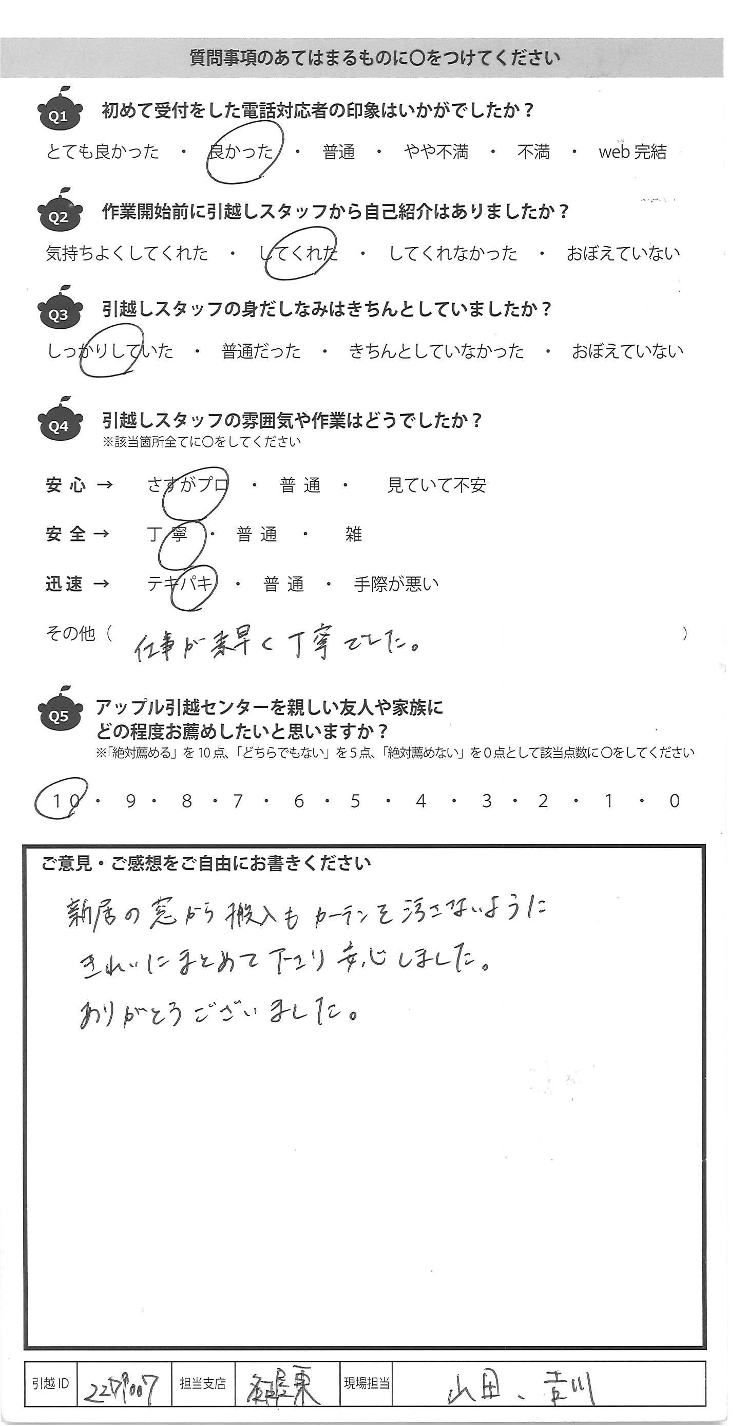 A.引っ越しの時には大変お世話に なりました。電話を何回もかけていろいろ 聞きましたが気持ちよく応対していただき 助かりました。当日来られた3人の方も テキパキと作業をしていただきました。 アップルさんに決めてよかったです。