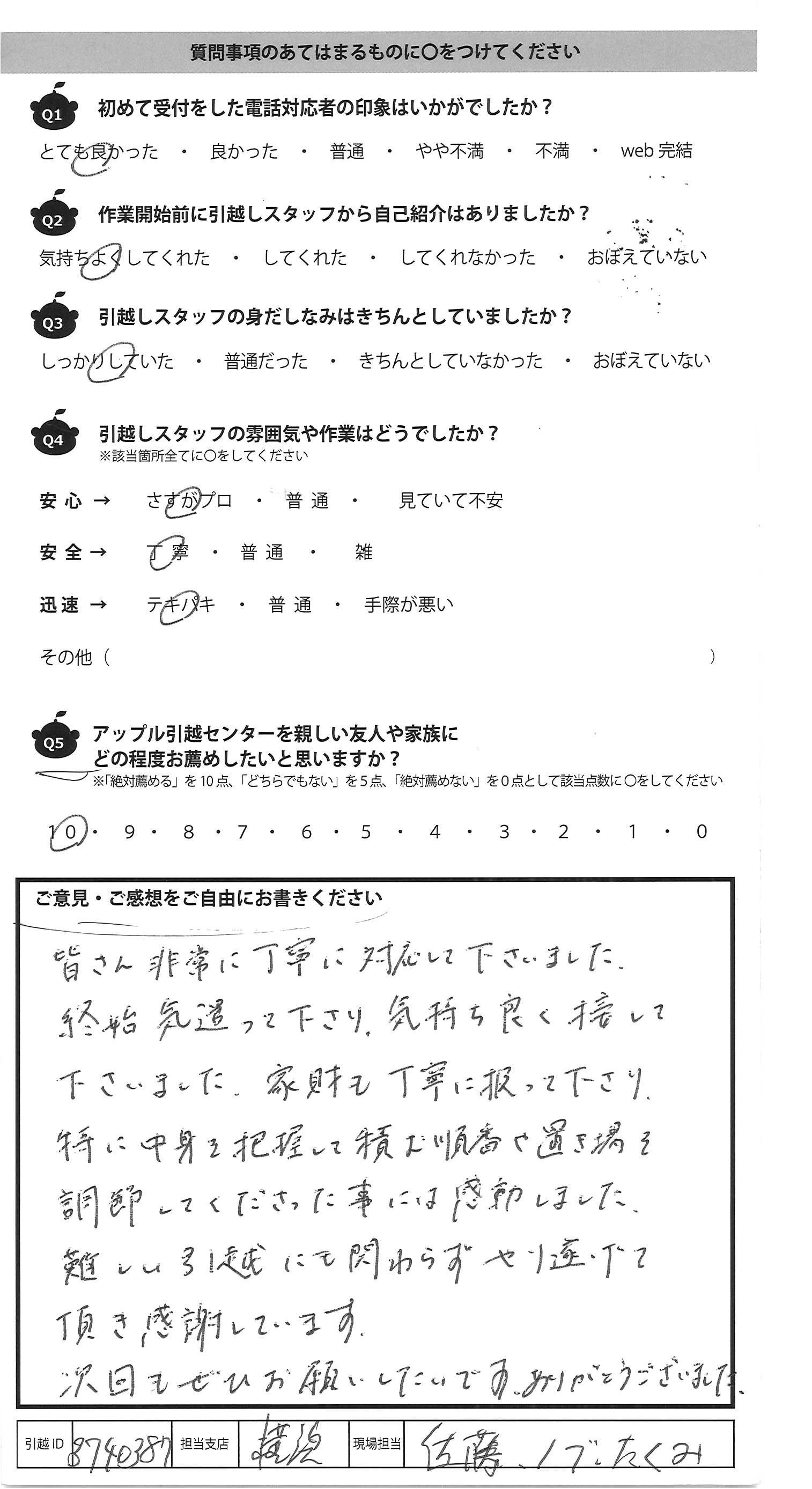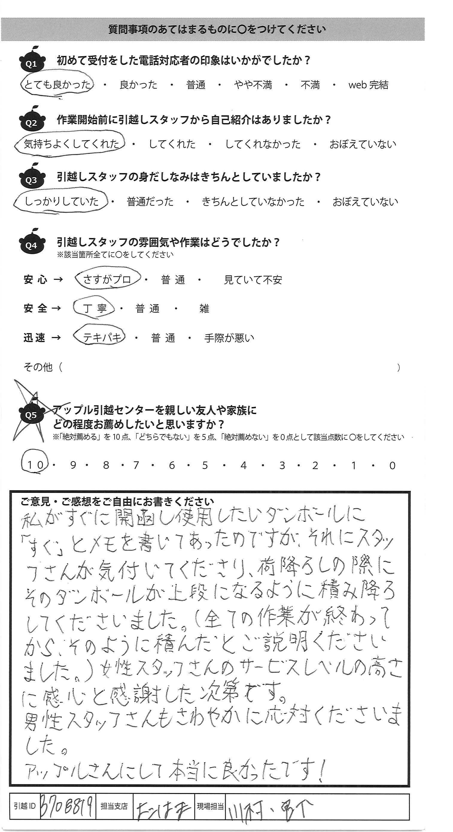 A.2回目に貴社を利用させていただいた者です。 他社も含め検討していたのですが、わざわざお電話をいただき 1回目の懸念事項の解決案をご提示いただき、貴社にお願い させていただくことにしました。(その際はフリープランの時間が懸念でした) 当日も、交通の便の良くない引越であったにも関わらず迅速かつ 丁寧にご対応をいただき、リーズナブルかつハイクオリティな サービスに大変感動しました。特に髙澤さん、養生など細かく 配慮をいただいた他、引越がスムーズに終わるよう、引越先 までの移動ルートや搬入など細かな心配りをいただきました。 次回もぜひ貴社にお願いしたいと思います。素晴らしいサービスを ありがとうございました。