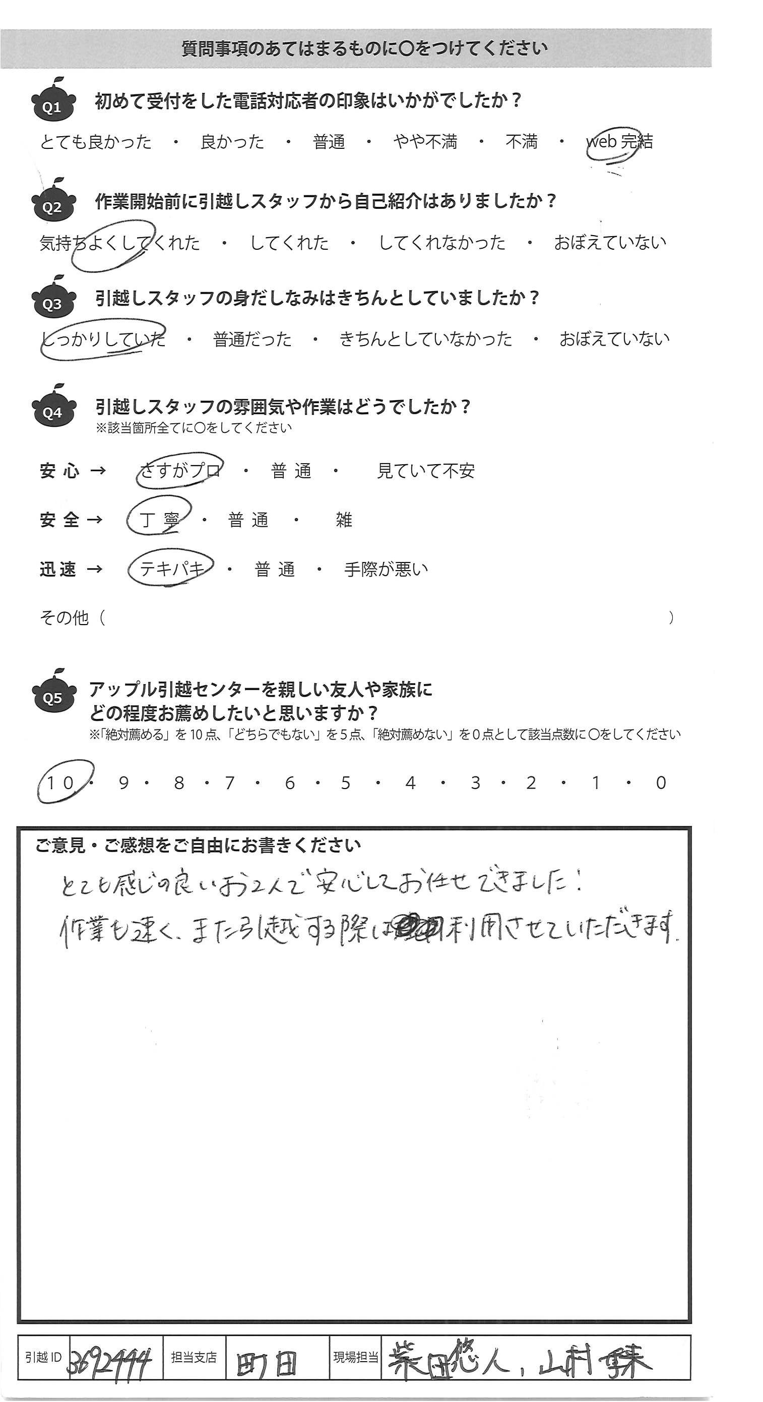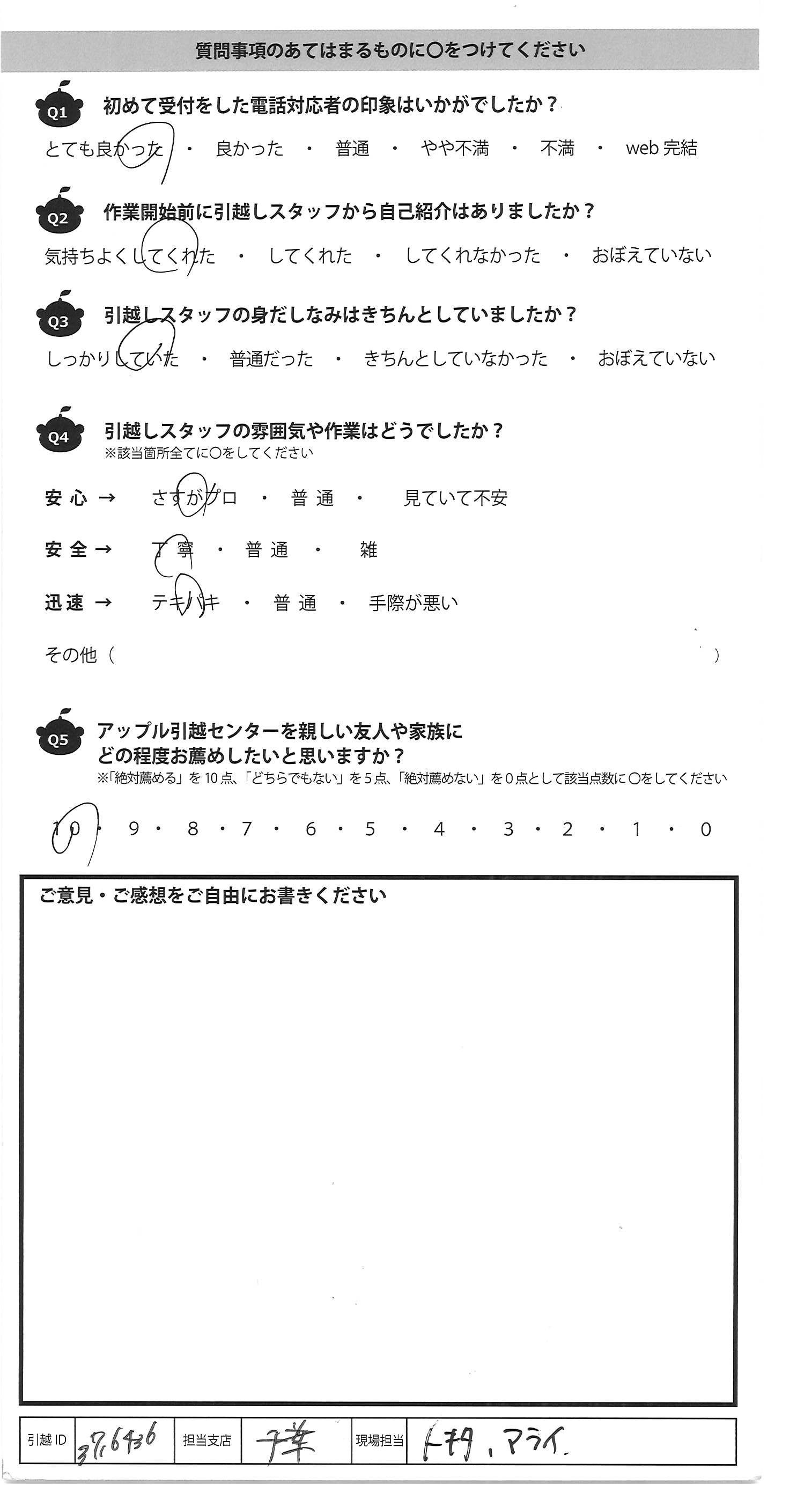 A.お二人ともさわやかな笑顔で安心感がありました。 事前にアップルさんにメールで確認させていただき、 すぐに荷物が出せる段ボールは、その場で回収して いただきました。引っ越し先はとても狭い部屋 でしたので、大変助かりました。 旭化成さんからの紹介でしたので、旭化成さんにも 高評価の旨をお伝えいただければと思います。 ありがとうございました。