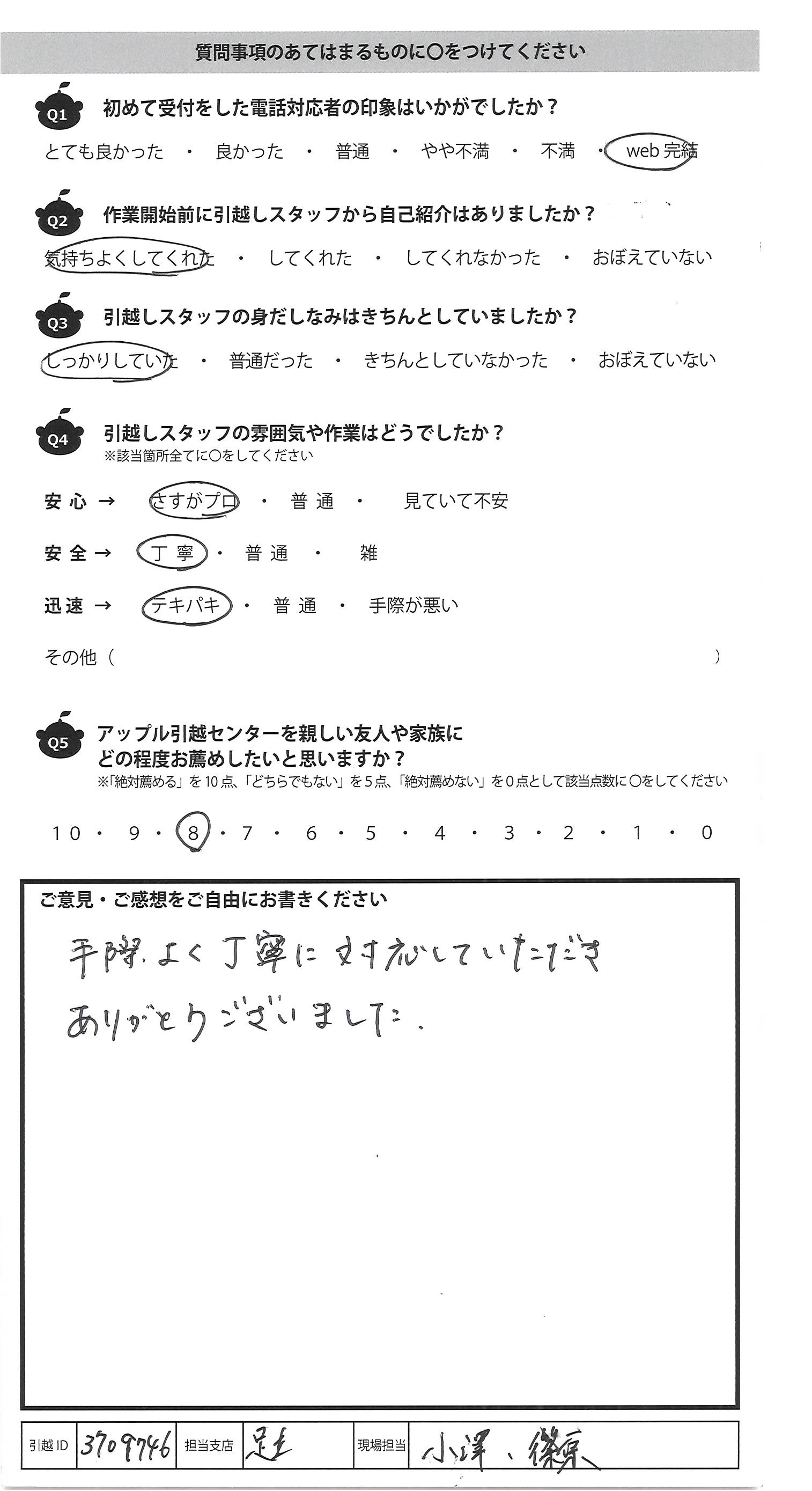 A.アップルを利用するのは2回目です。 1回目は見積もり不足で当日運べないかもというトラブルがありましたが、当日スタッフの方がなんとか運んでくれてとても助かったので今回も利用させて頂こうと思いました。 今回は石井さん、宇井さん、城さんの3名で対応して頂き明るくテキパキと作業していただいたので引越しも早く終わりとても助かりました。(みなさん本当に運ぶのが早くてびっくりでした) また、今回洗濯機を設置する際も水漏れに関してすごく丁寧に説明、対応して頂いたことがとても嬉しかったです。 次回の引っ越しがいつになるかはわかりませんが、次も是非利用したいと思っています! 今回は本当にありがとうございました。