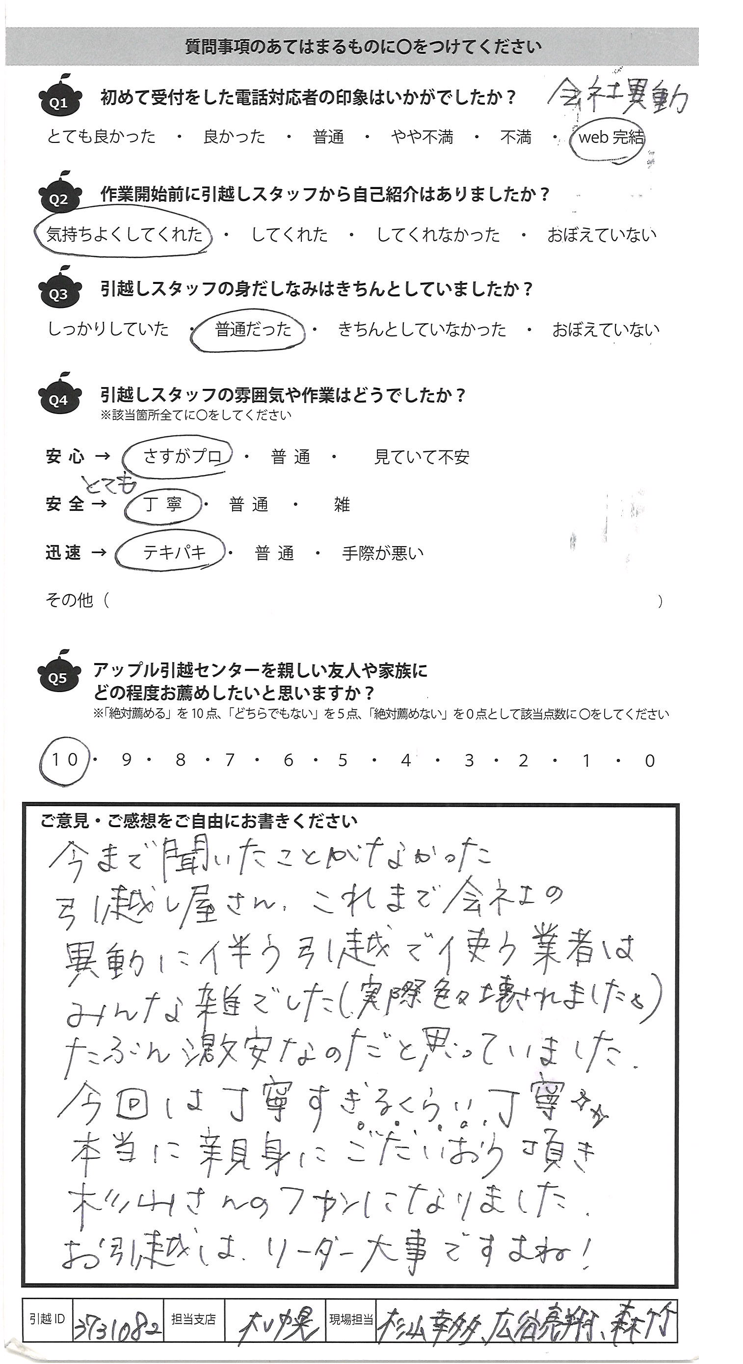 A.テキパキとしていて、ベットの組立とかも していただき、とても助かりました。 現地(引越先)でもマンションへの 心くばり等、とてもよかったです。 ありがとうございました。