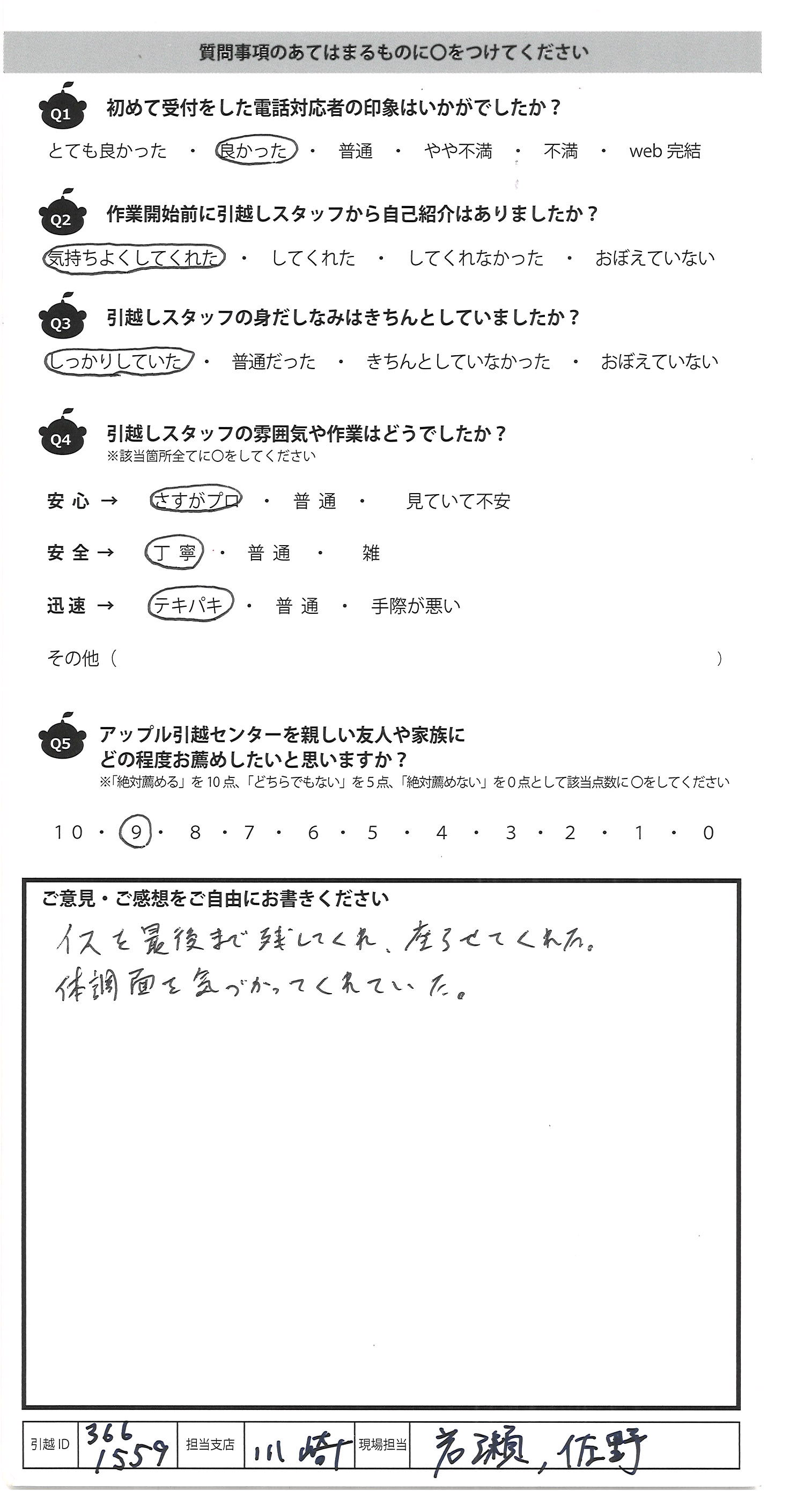 A.リーダー(宮下さん?)の男性がとても気さくで、安心感がある方で 初めての引っ越しでしたが、とてもスムーズに終わりました。 とても感謝しています。 本当にありがとうございました。 また引っ越しの際は、アップルさんに お願いしようと思います。