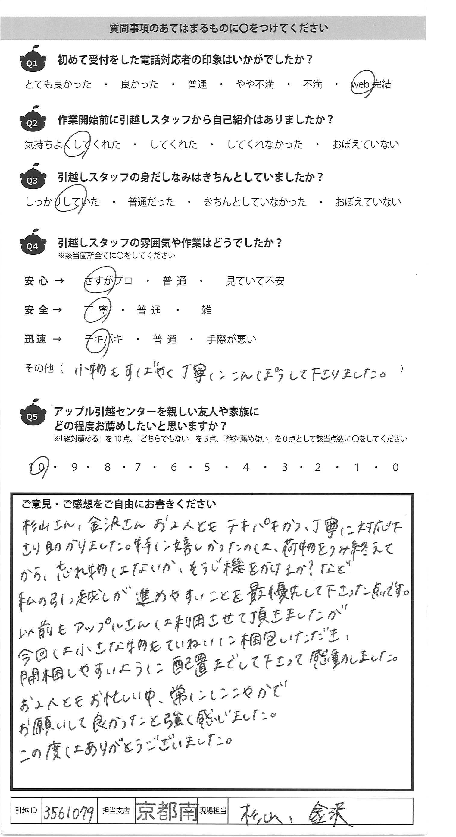 A.杉山さん、金沢さんお2人ともテキパキかつ、丁寧に対応下 さり助かりました。特に嬉しかったのは、荷物をつみ終えて から、忘れ物はないか、そうじ機をかけるか?など 私の引っ越しが進めやすいことを最優先して下さった点です。 以前もアップルさんは利用させて頂きましたが 今回は小さな物もていねいに梱包いただき、 開梱しやすいように配置までして下さって感動しました。 お2人ともお忙しい中、常ににこやかで お願いして良かったと強く感じました。 この度はありがとうございました。