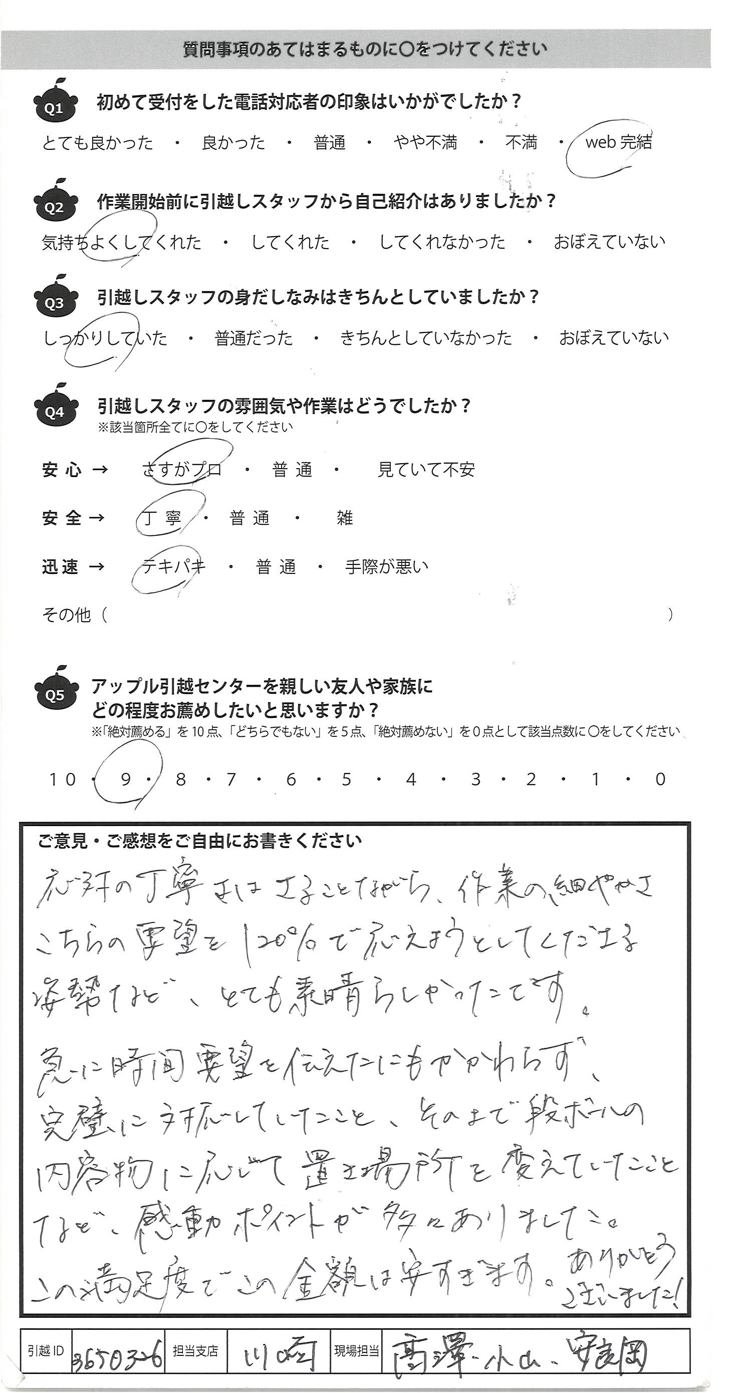 A.応対の丁寧さはさることながら、作業の細やかさ こちらの要望を120%で応えようとしてくださる 姿勢など、とても素晴らしかったです。 急に時間要望を伝えたにもかかわらず、 完璧に対応していたこと、その上で段ボールの 内容物に応じて置き場所を変えていたこと など、感動ポイントが多々ありました。 この満足度でこの金額は安すぎます。 ありがとうございました!