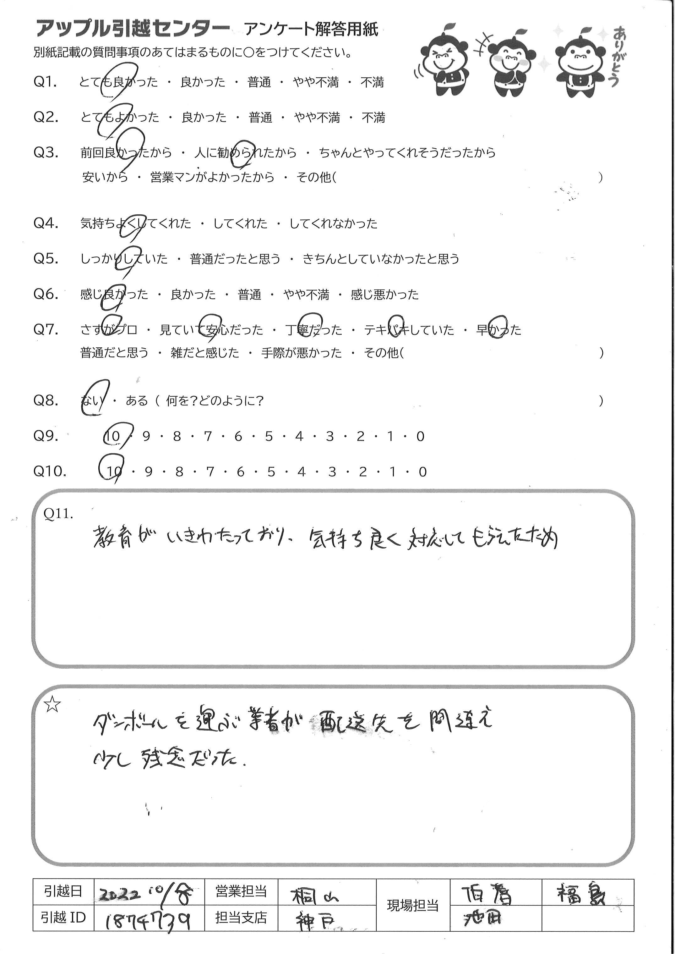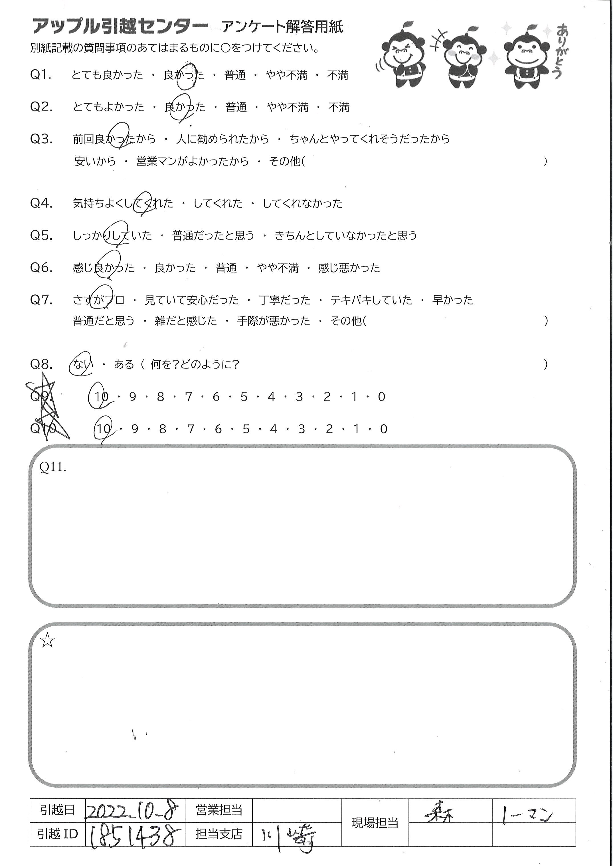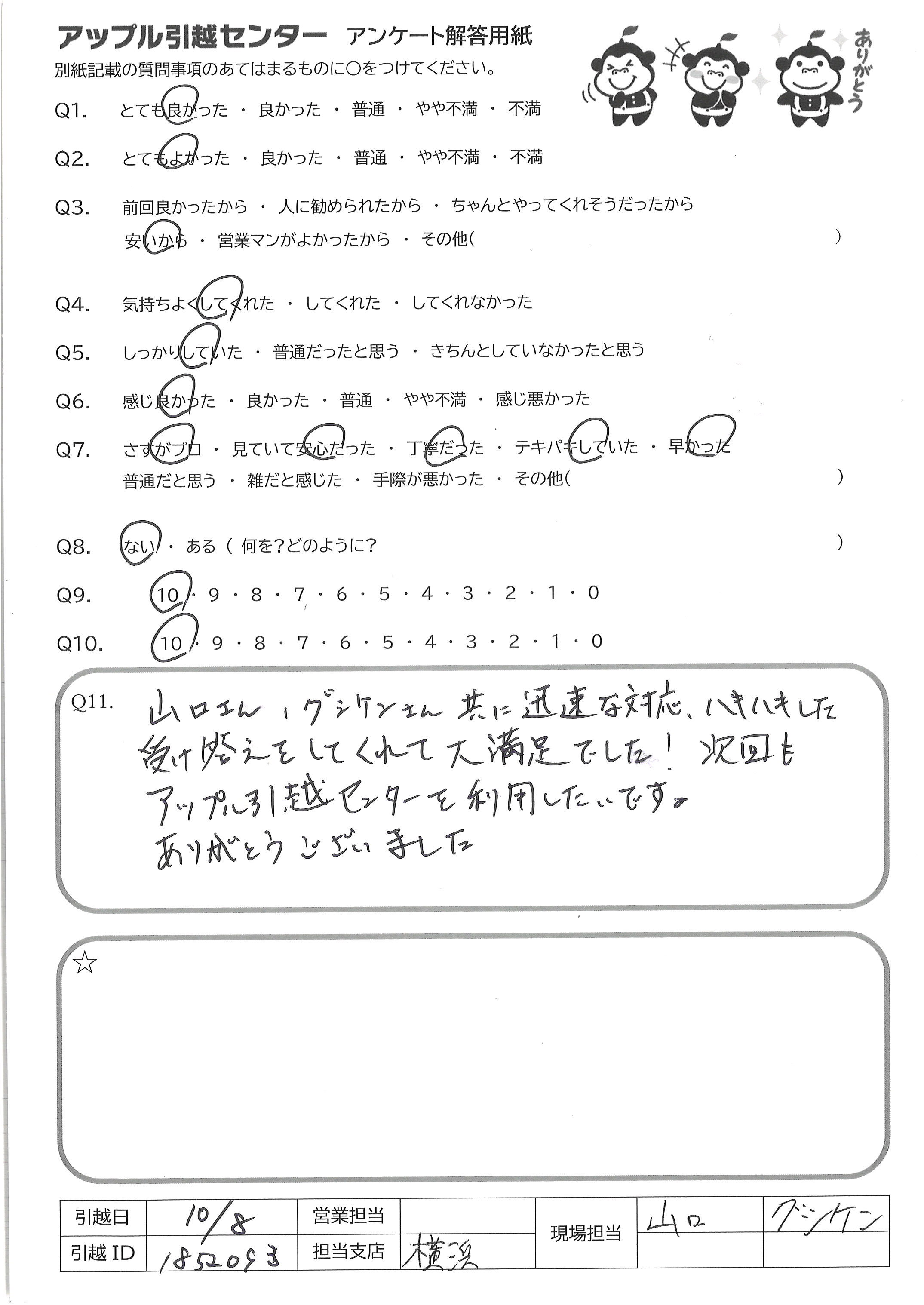 A.山口さん、グシケンさん共に迅速な対応、ハキハキした受け答えしてくれて大満足でした!次回もアップル引越センターを利用したいです。 ありがとうございました。