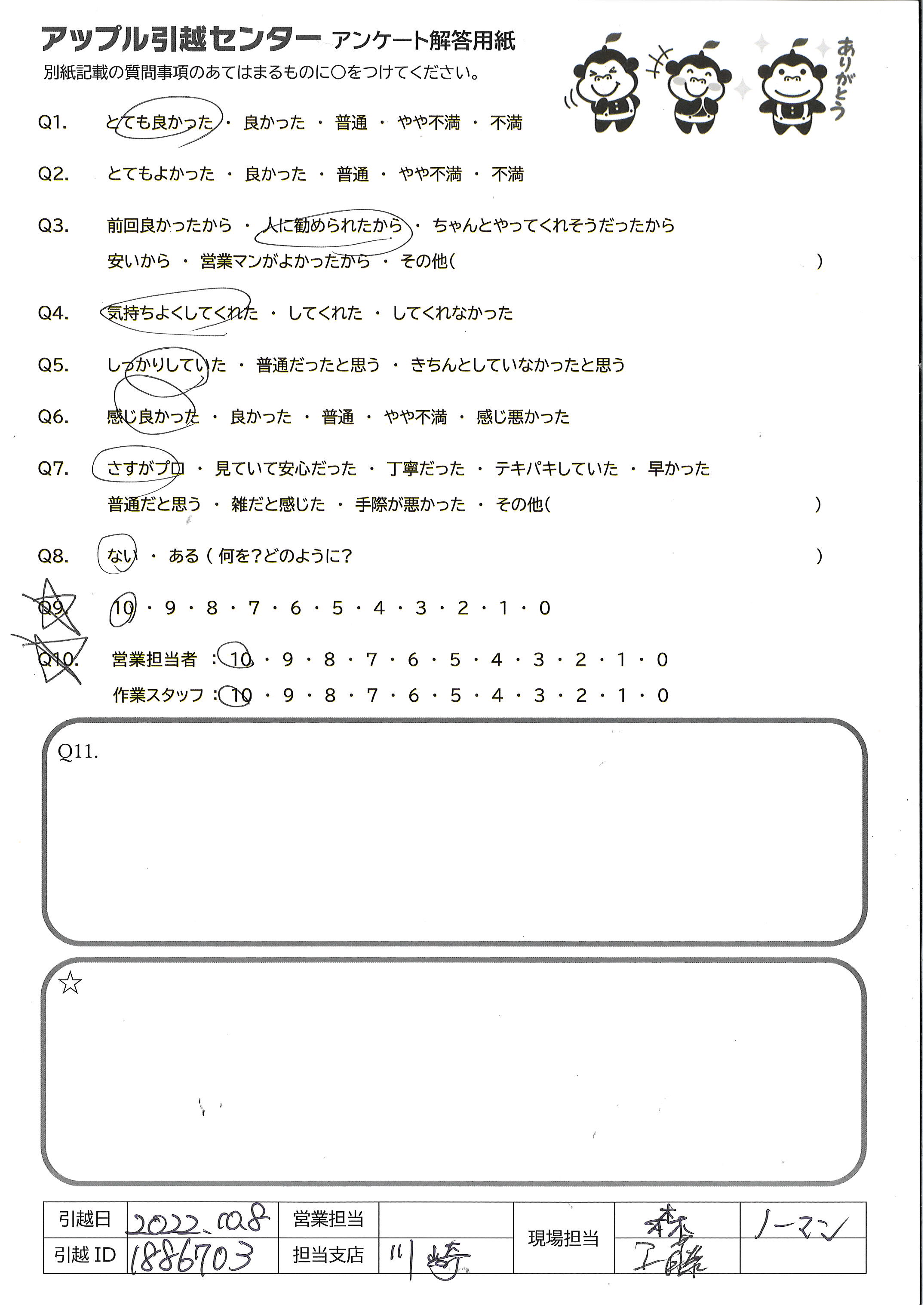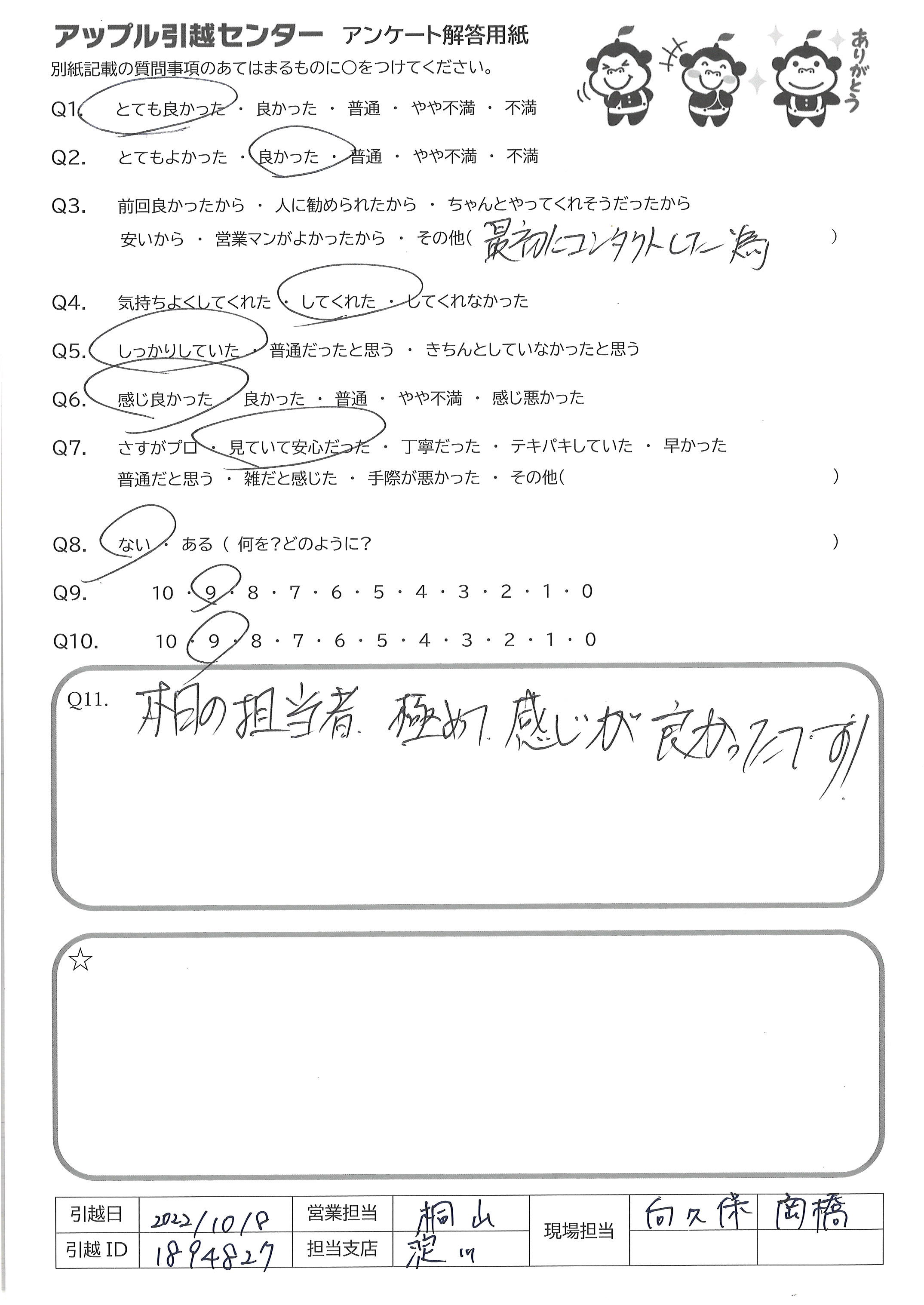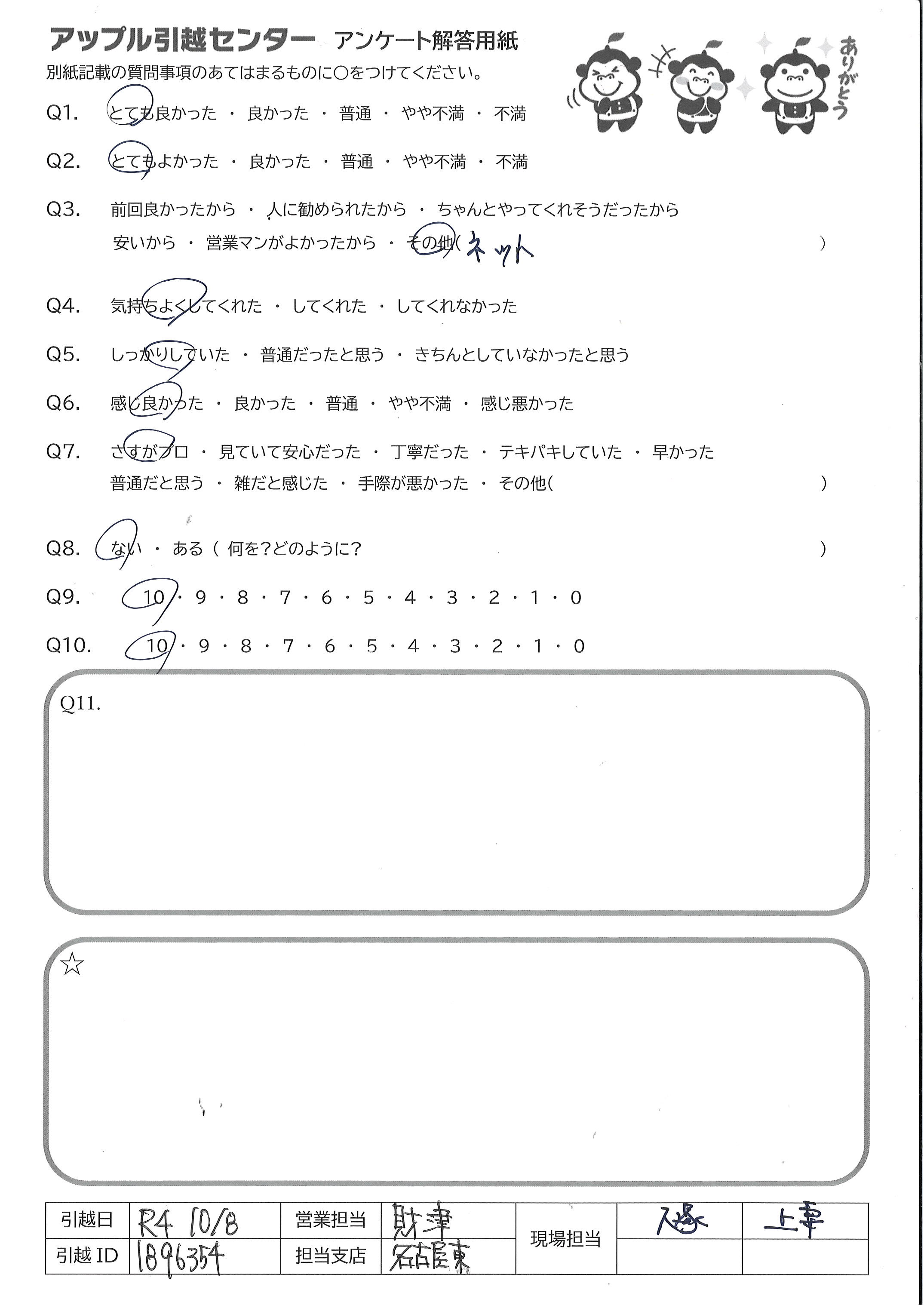 A.山口さん、グシケンさん共に迅速な対応、ハキハキした受け答えしてくれて大満足でした!次回もアップル引越センターを利用したいです。 ありがとうございました。