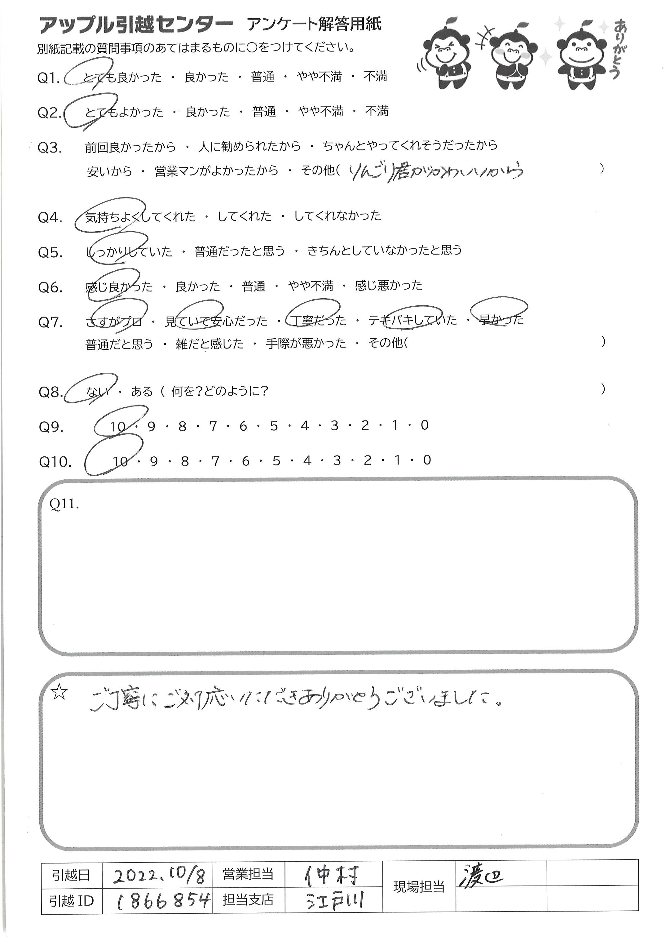 引越し日:2022年10月08日 エリア:東京都江東区