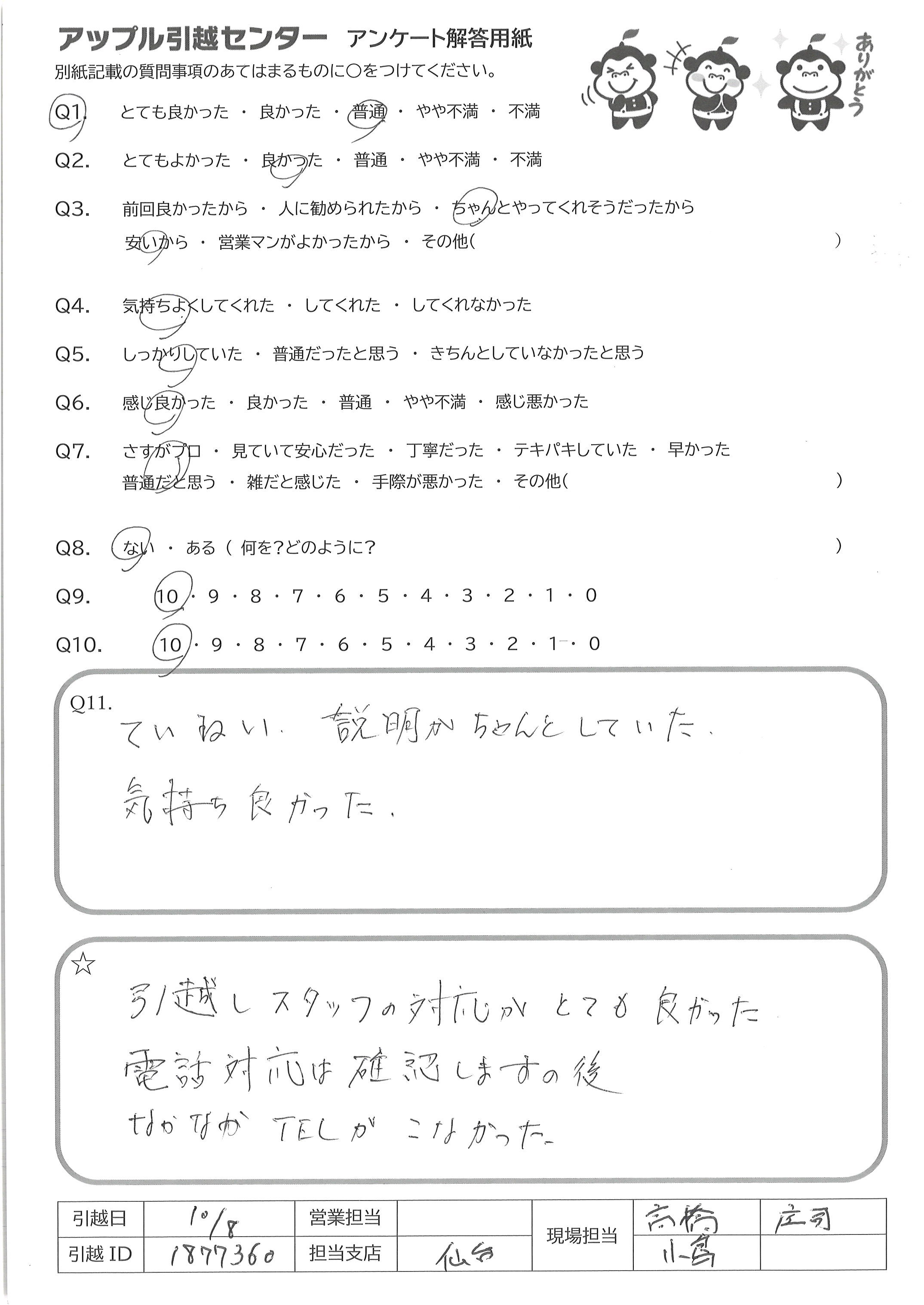 A.引っ越しスタッフの対応がとても良かった 電話対応は確認しますの後なかなかTELが来なかった。