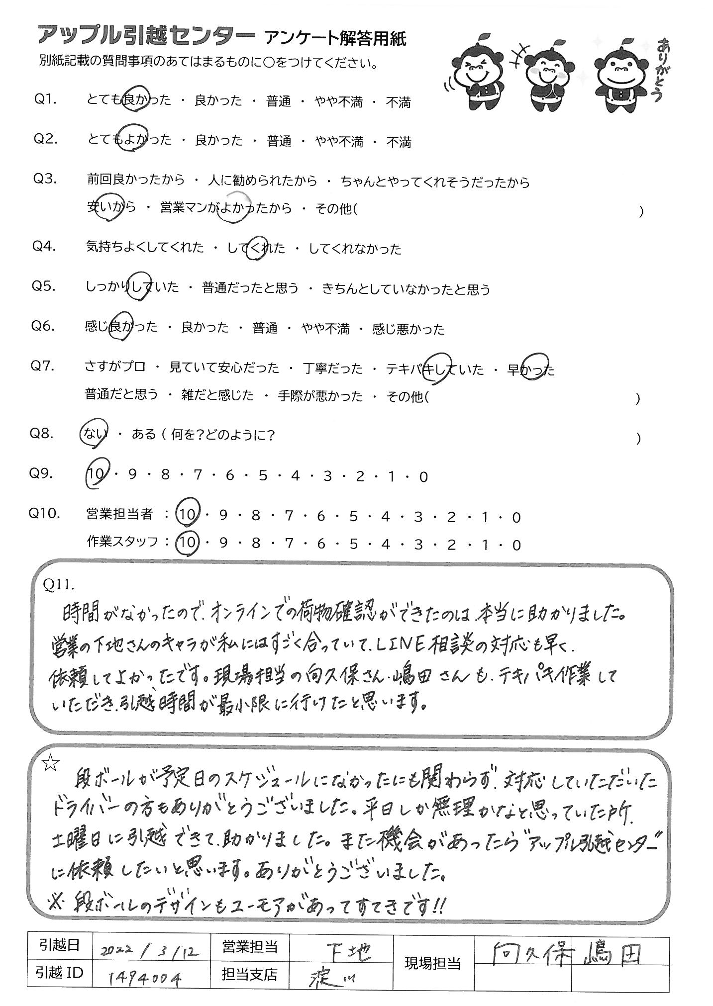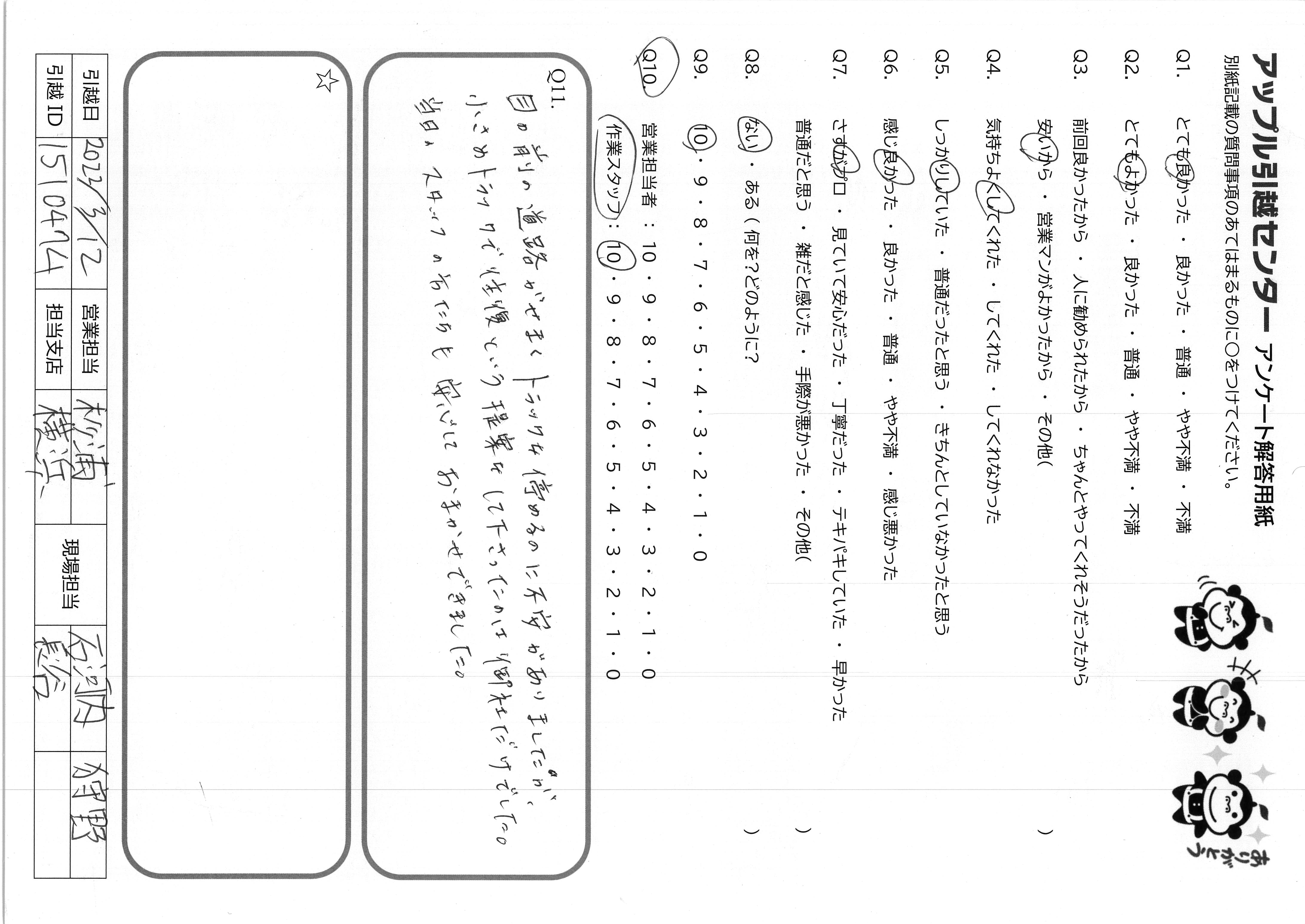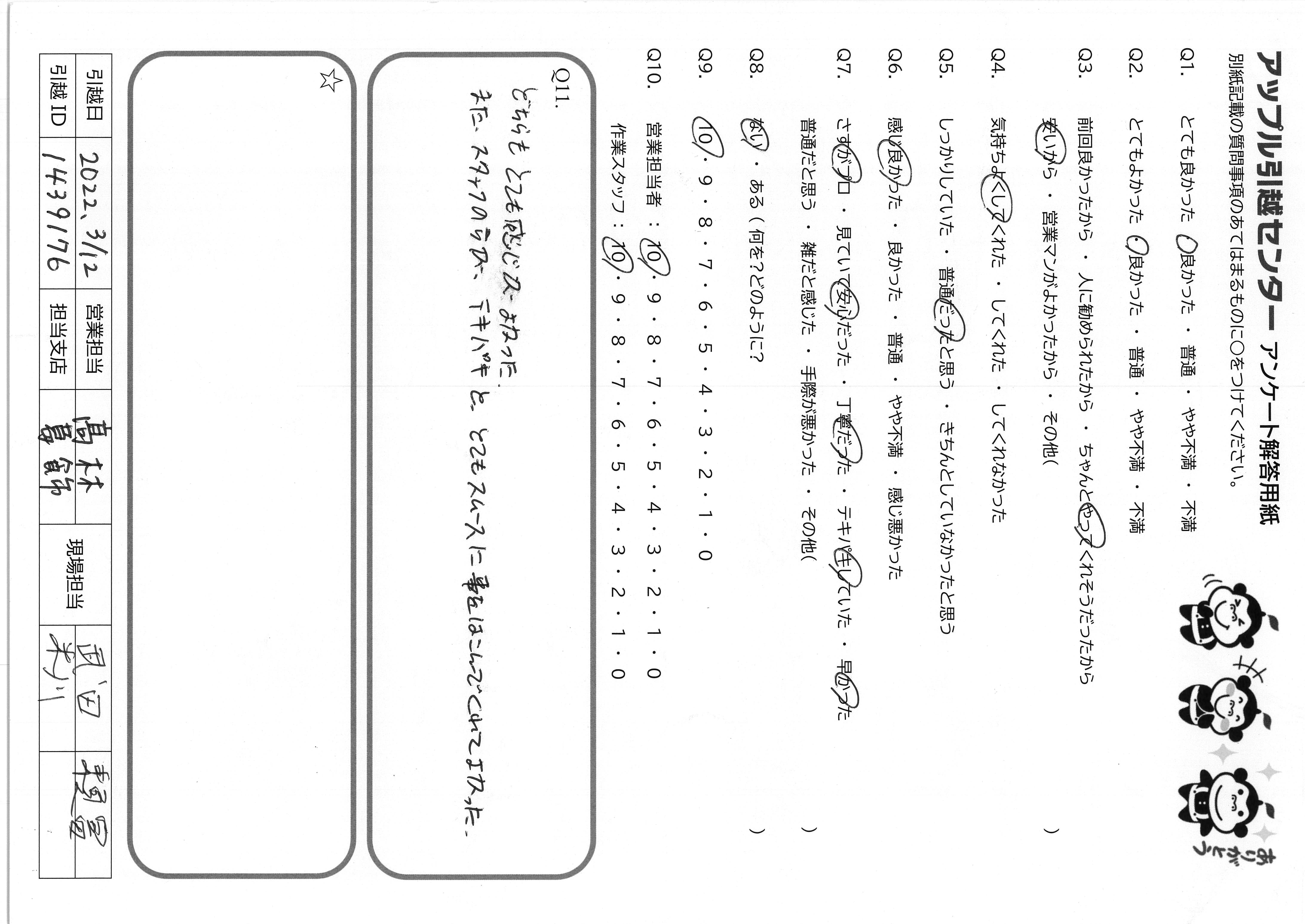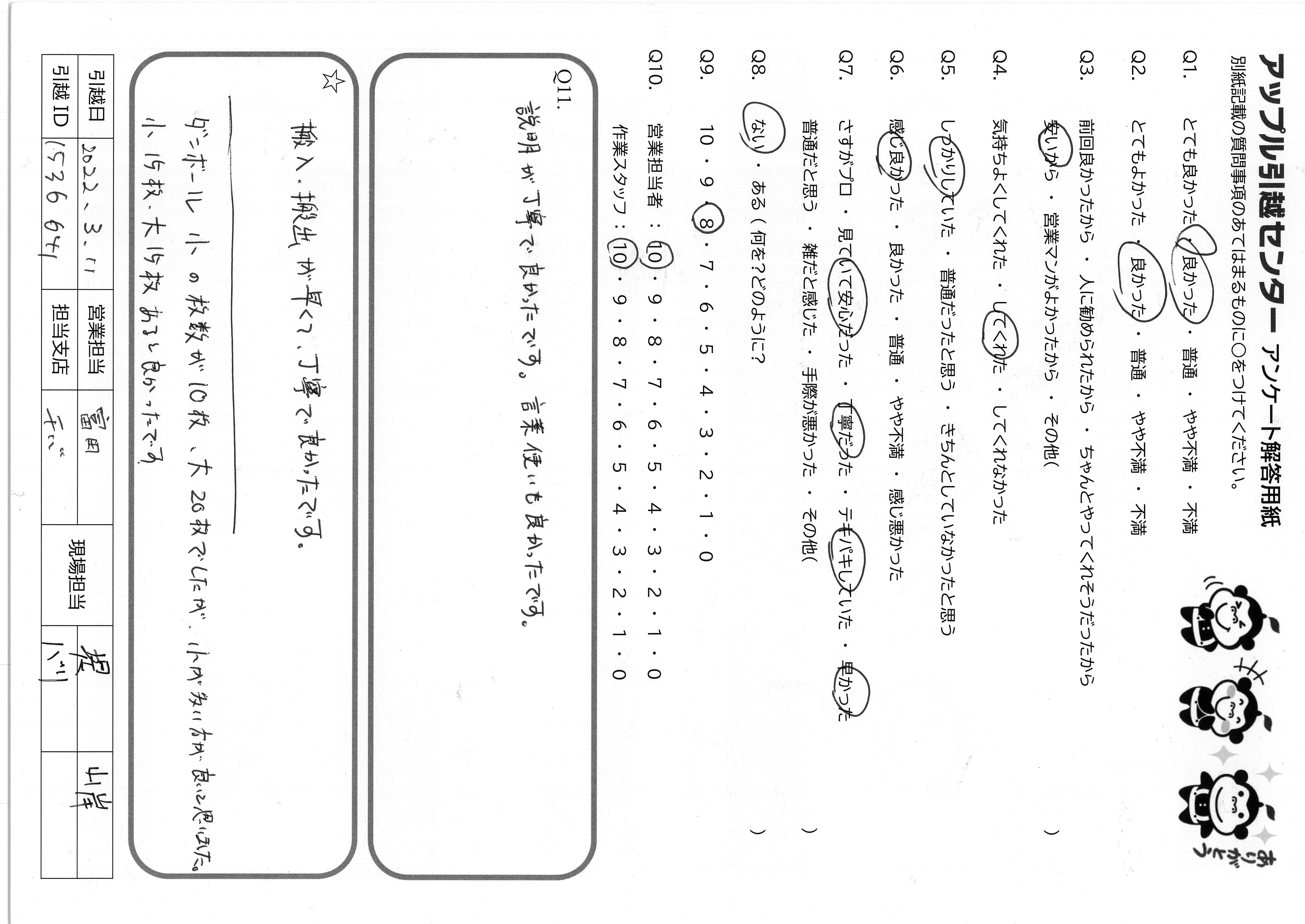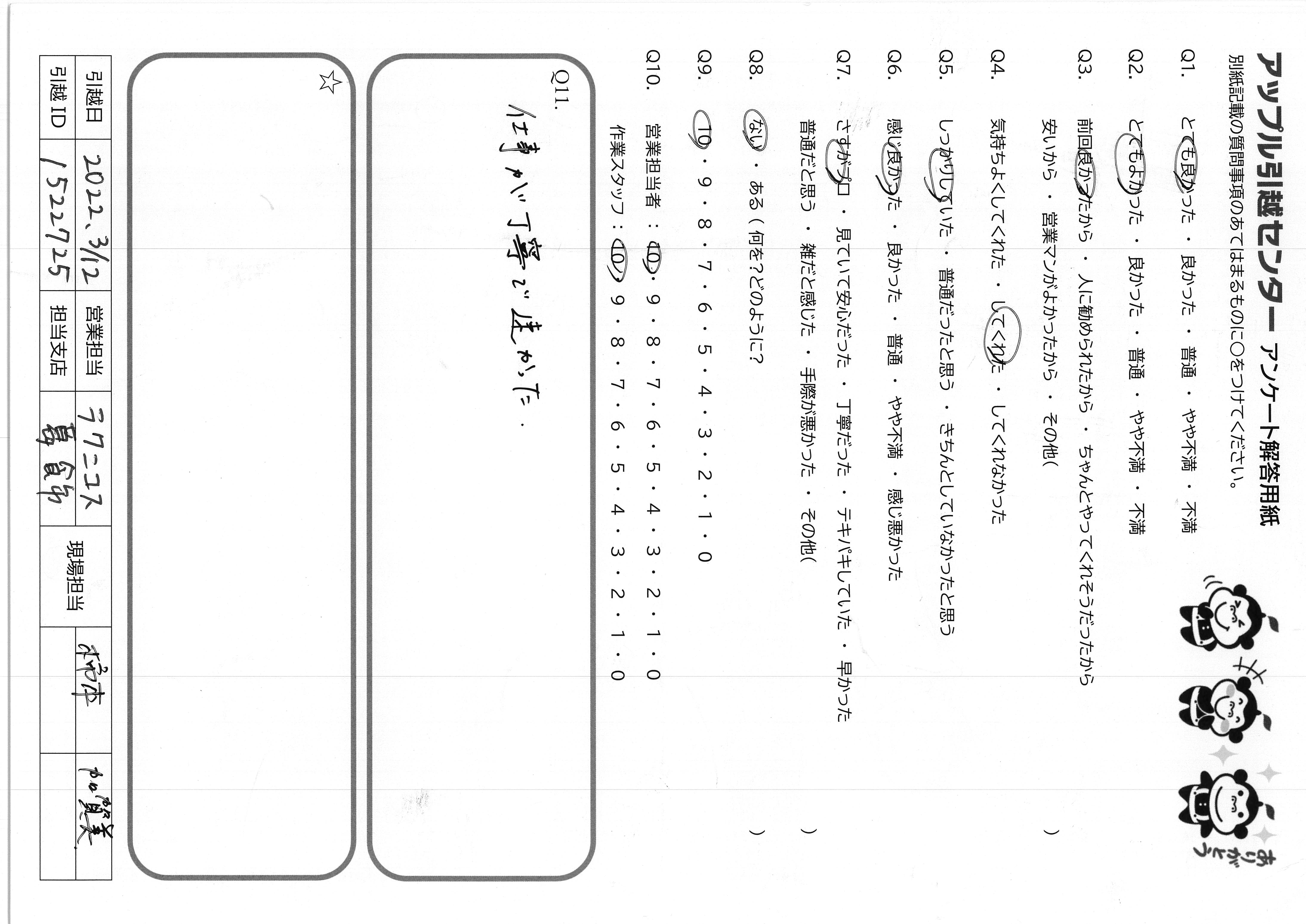 A.時間がなかったので、オンラインでの荷物確認ができたのは本当に助かりました 営業の下地さんのキャラが私にはすごく合っていてLINE相談の対応も早く 依頼してよかったです。現場担当の向久保さん、嶋田さんもテキパキ作業して いただき引越時間が最小限に行けたと思います
