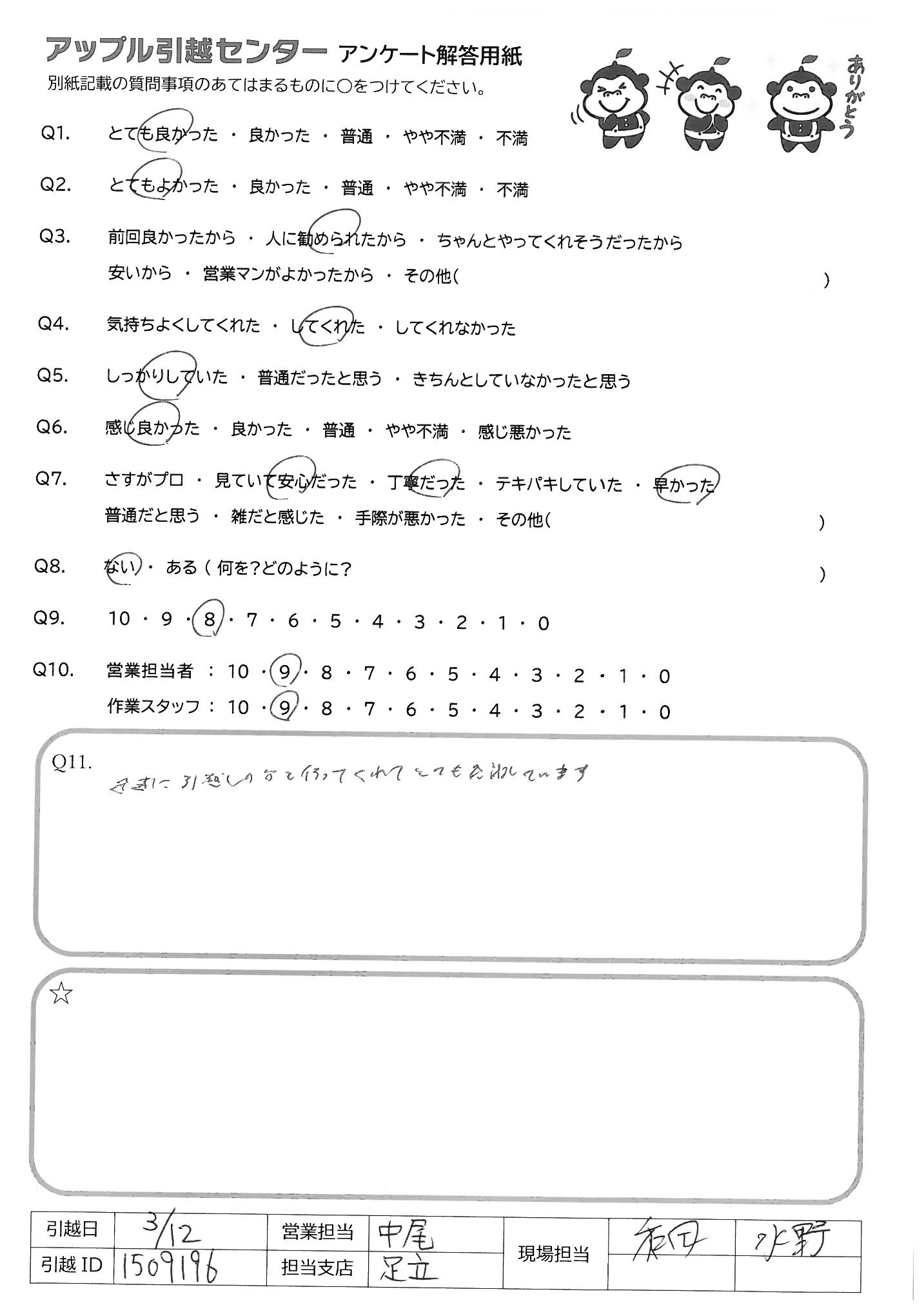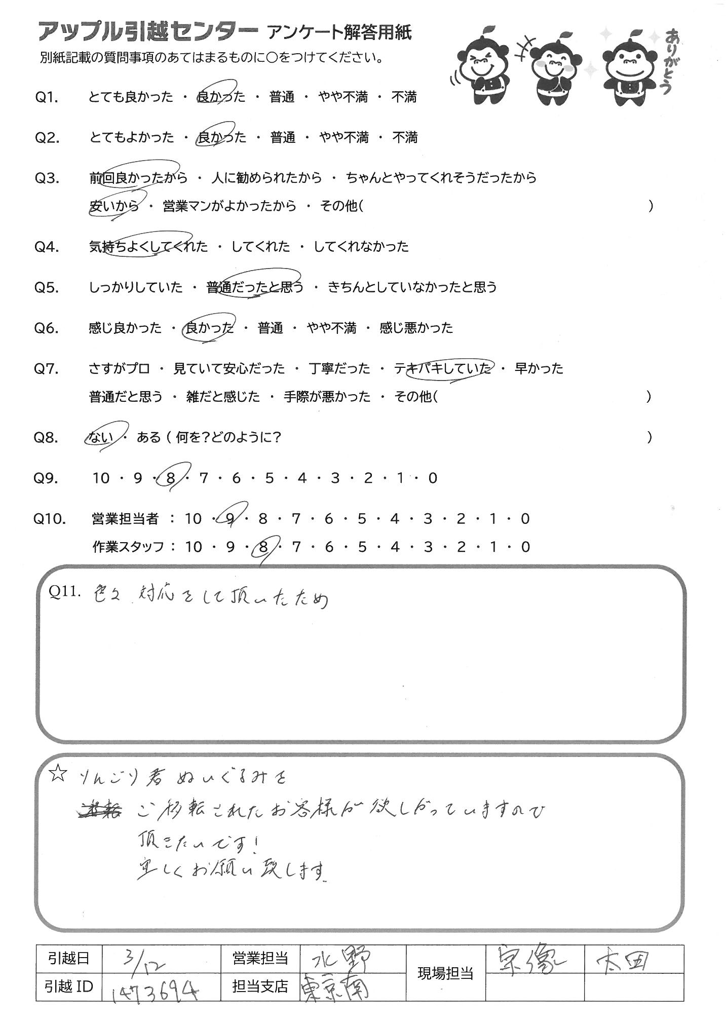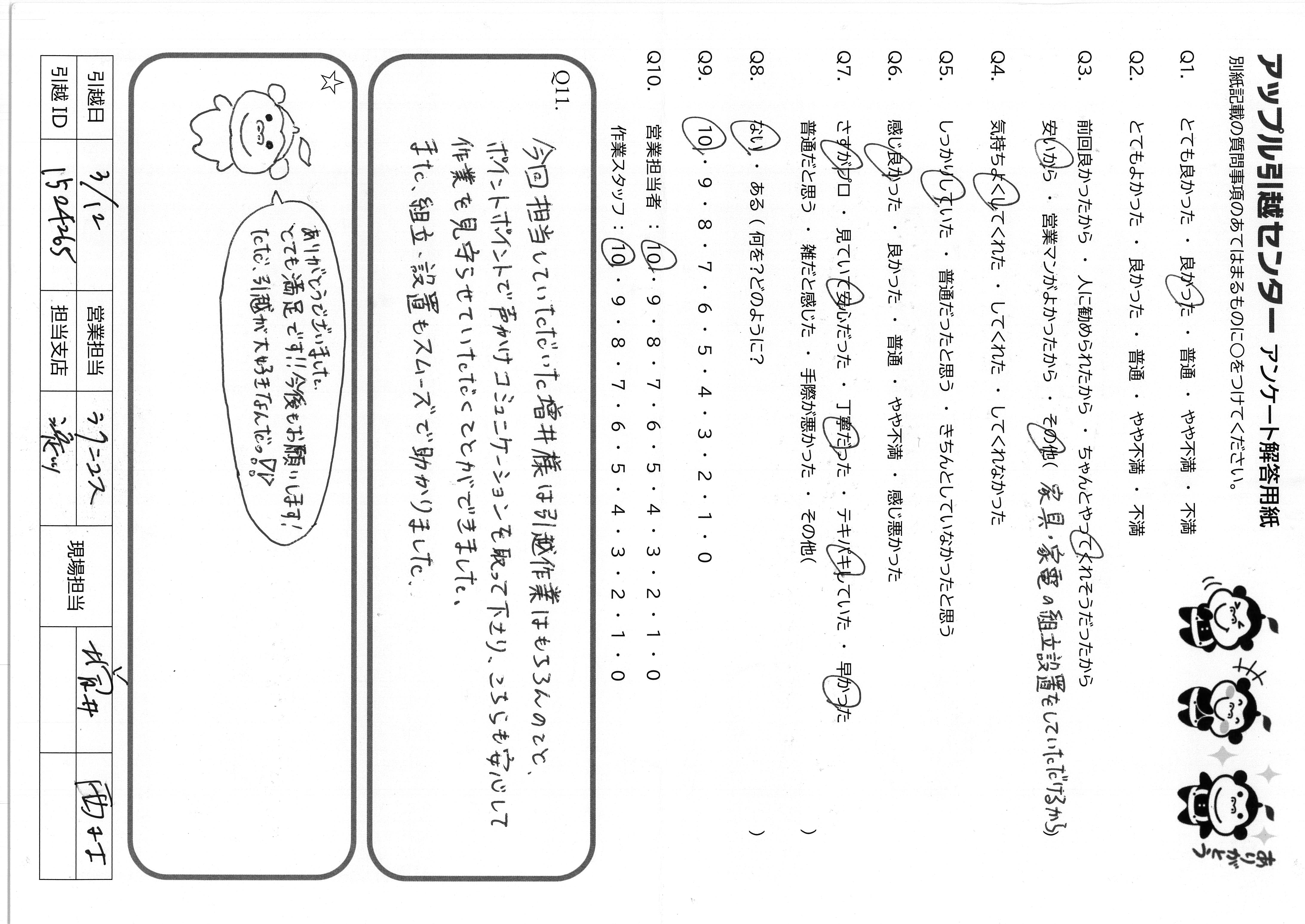 A.今回担当していただいた増井様は引越作業はもちろんのこと ポイントポイントで声かけコミュニケーションを取って下さりこちらも安心して 作業を見守らせていただくことができました また組立・設置もスムーズで助かりました