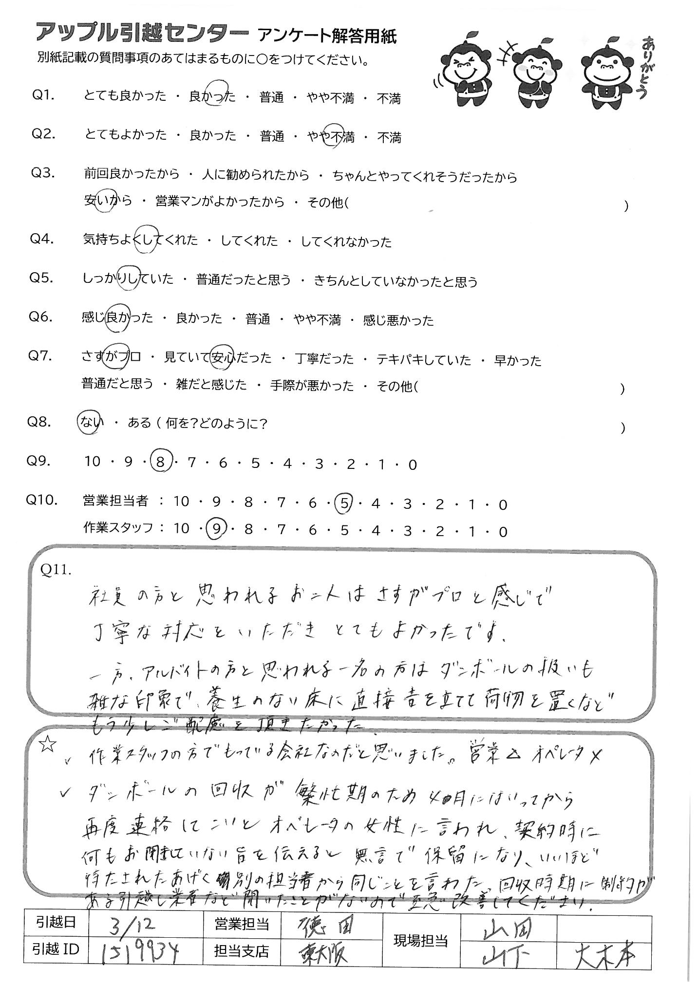 A.社員の方と思われるお二人はさすがプロと感じで 丁寧な対応をいただきとても良かったです 一方、アルバイトの方と思われる一名の方がダンボールの扱いも 雑な印象で養生のない床に直接音とを立てて荷物を置くなど もう少しご配慮いただきたかった