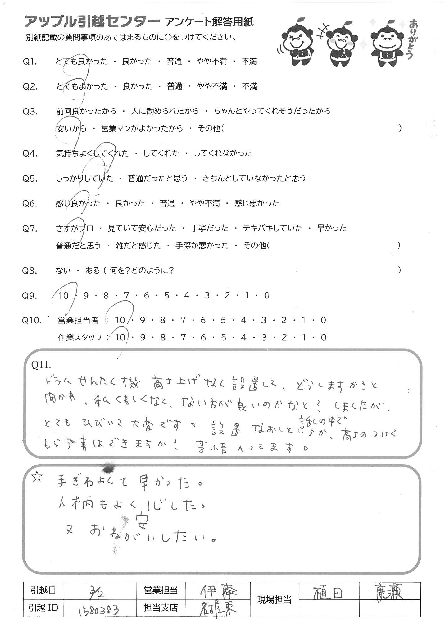 A.こちらの準備も十分でない中、想定以上の対応をしてもらい大変助かりました。 アップル引越しセンターさんにして良かったと思いました。