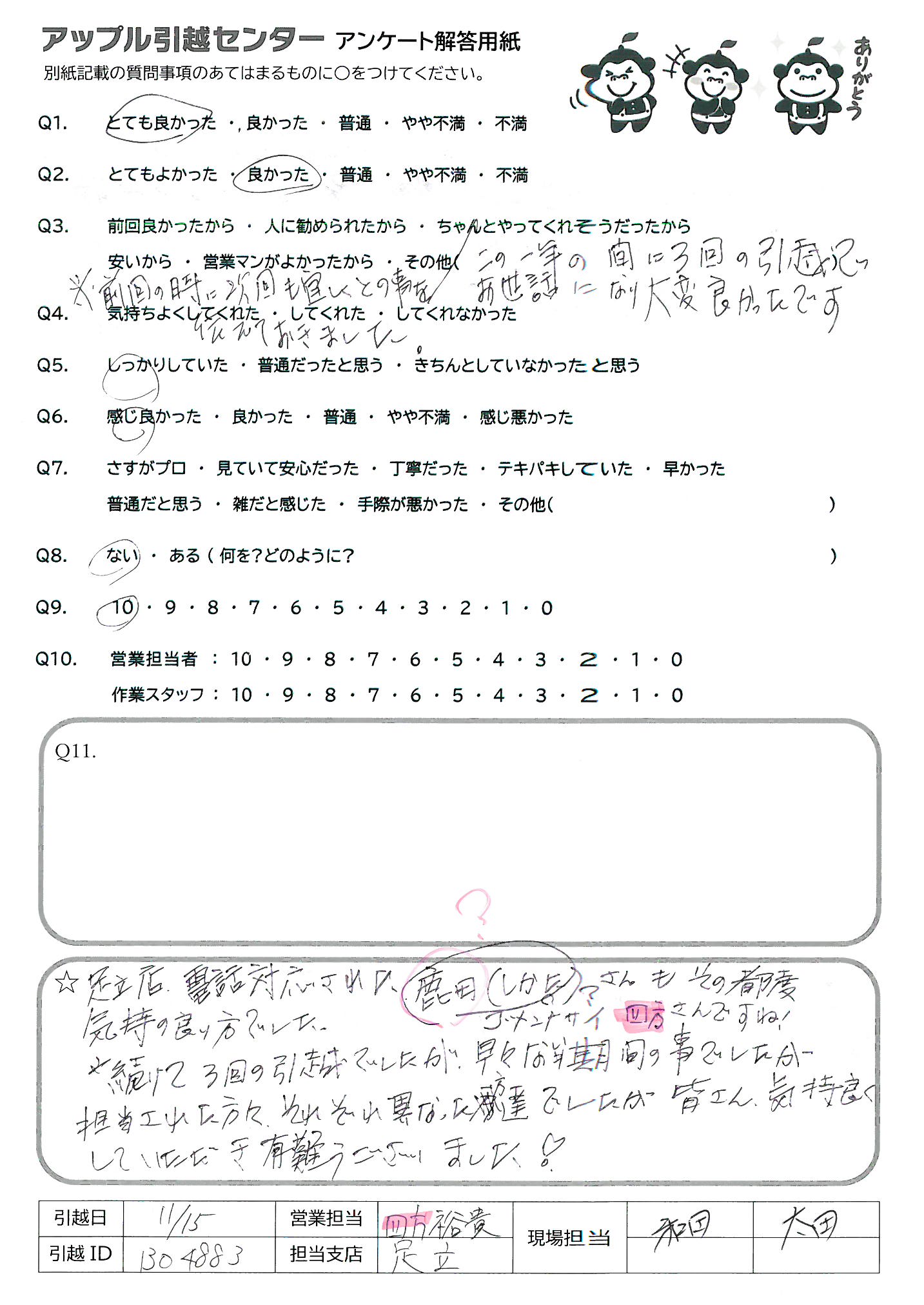 A.足立店、電話対応された鹿田(しかた)さんゴメンナサイ四方さんですね!もその都度気持の良い方でした。続けて3回の引越でしたが、早々な期間の事でしたが担当された方々それぞれ異なった方達でしたが皆さん気持ち良くしていただき有難うございました!