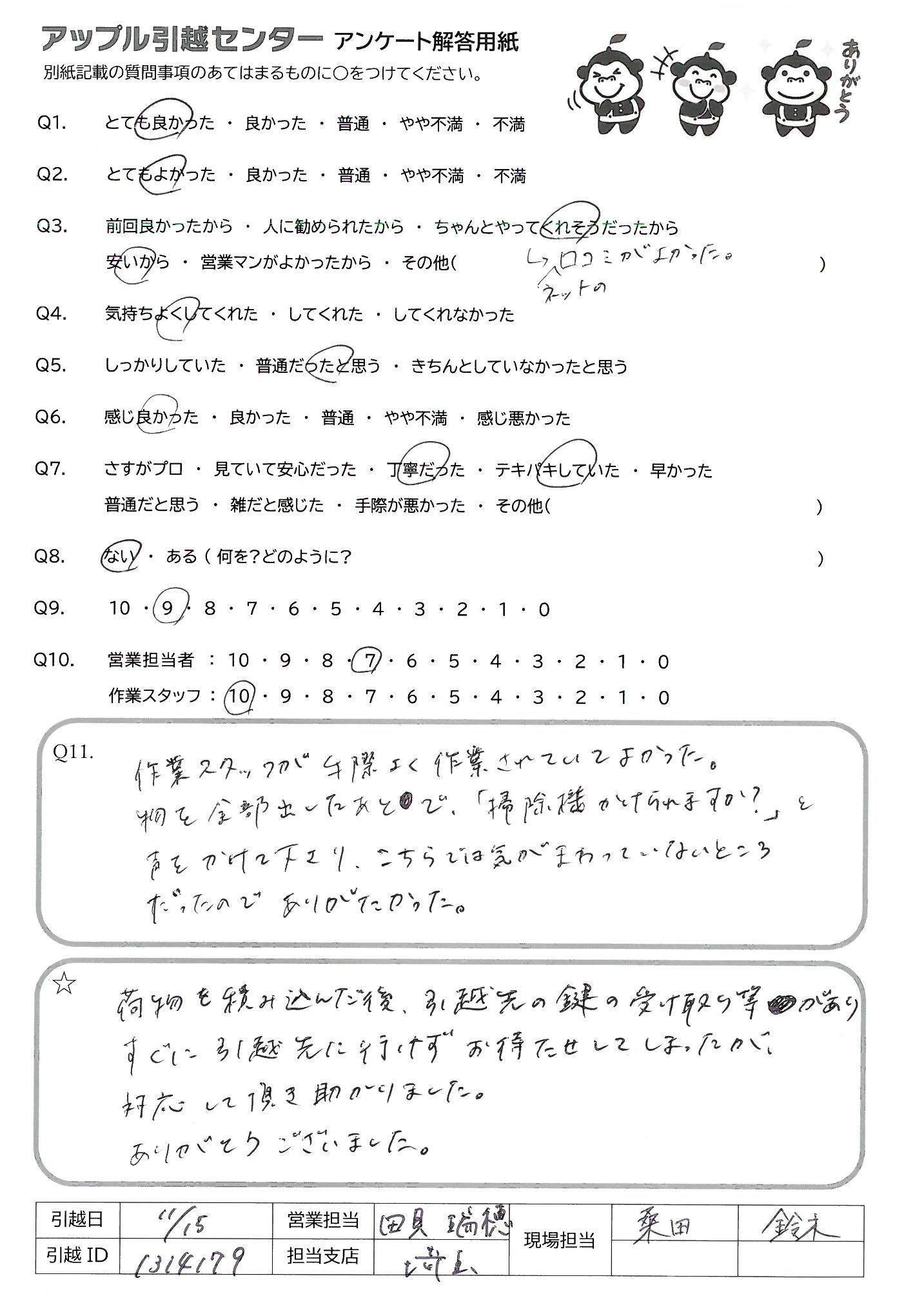 A.荷物を積み込んだ後、引越先の鍵の受け取り等がありすぐに引越先に行けずお待たせしてしまったが、対応して頂き助かりました。ありがとうございました。