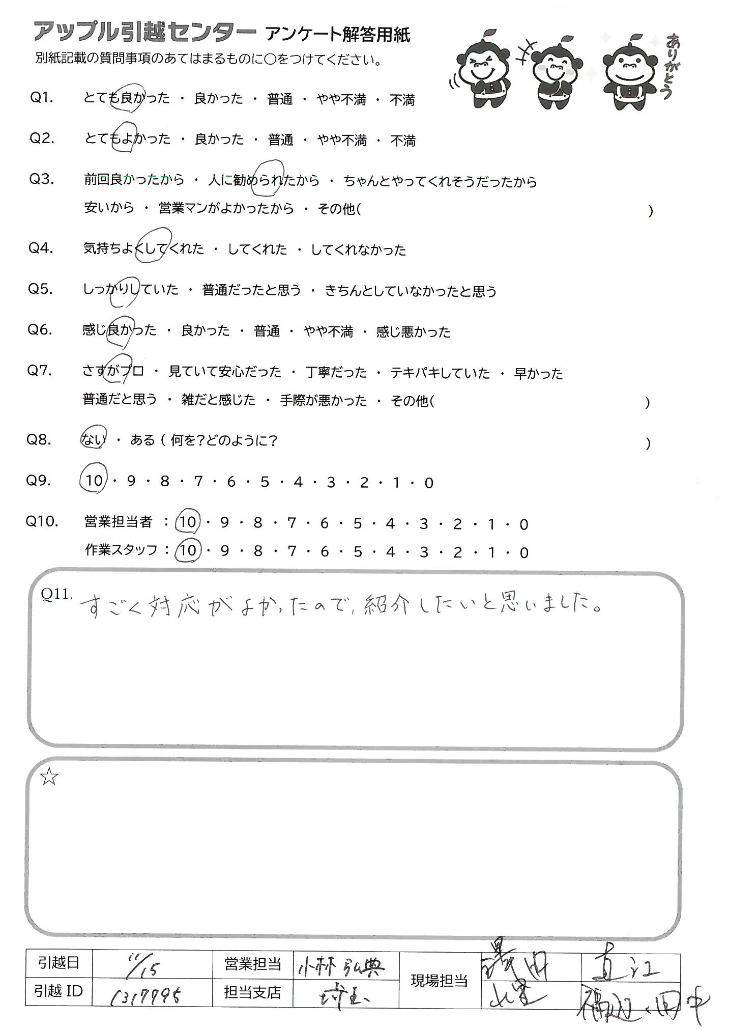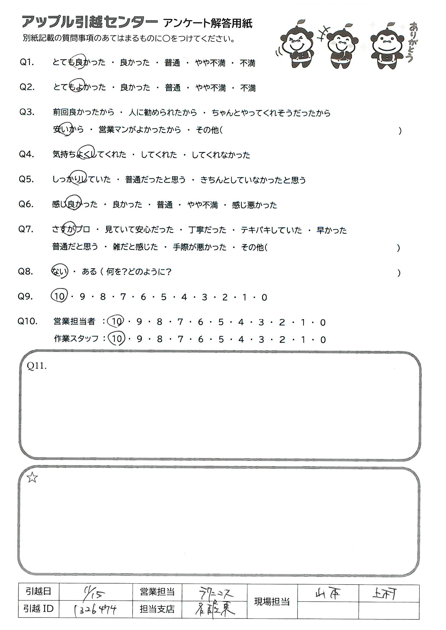 A.既に何人かにアップル引越センターをすすめています 安いだけじゃなく、丁寧な仕事ぶり、今回も大満足でした。 ありがとうございました。