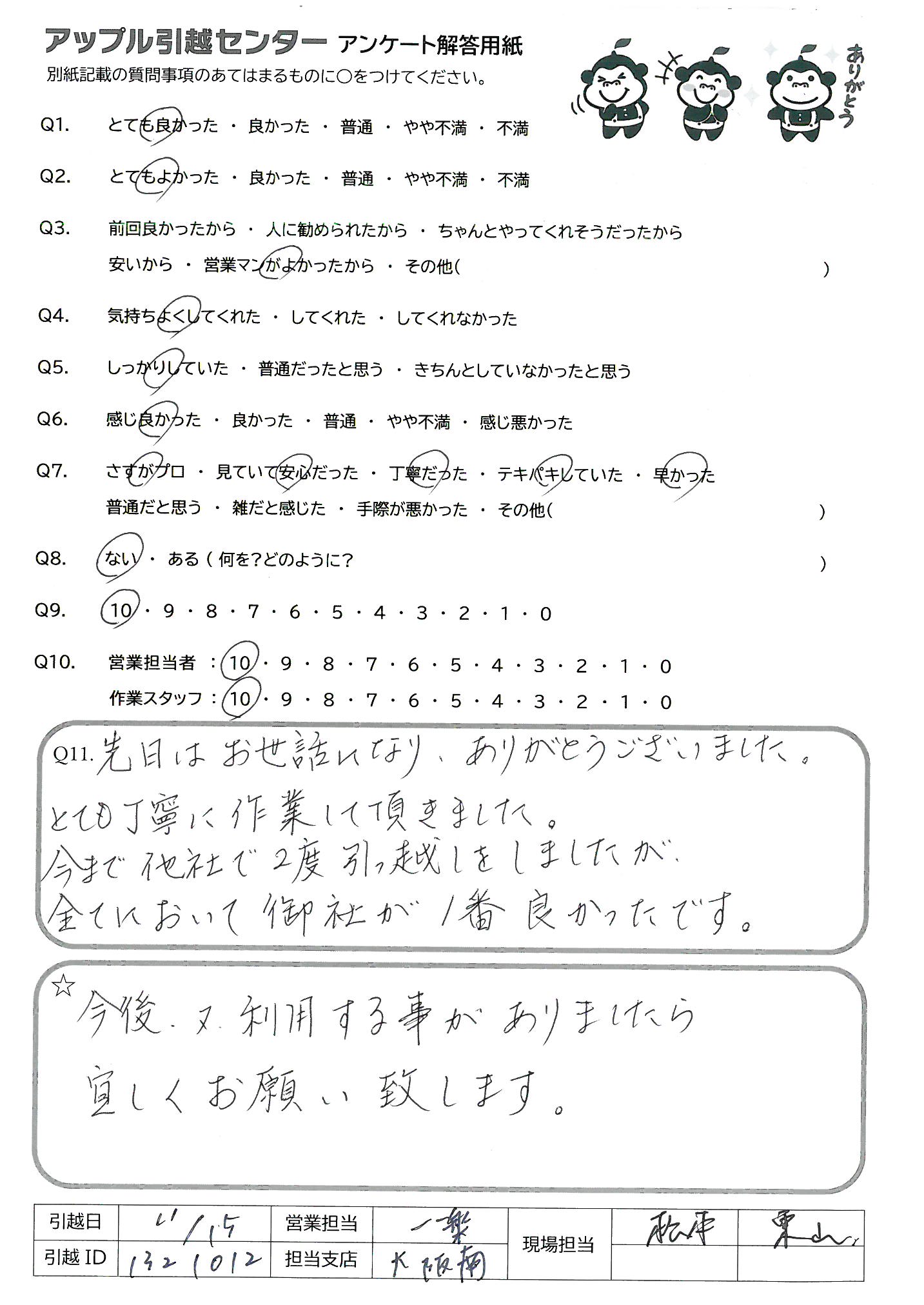 A.先日はお世話になり、ありがとうございました。 とても丁寧に作業して頂きました。 今まで他社で2度引っ越しをしましたが、全てにおいて御社が1番良かったです。