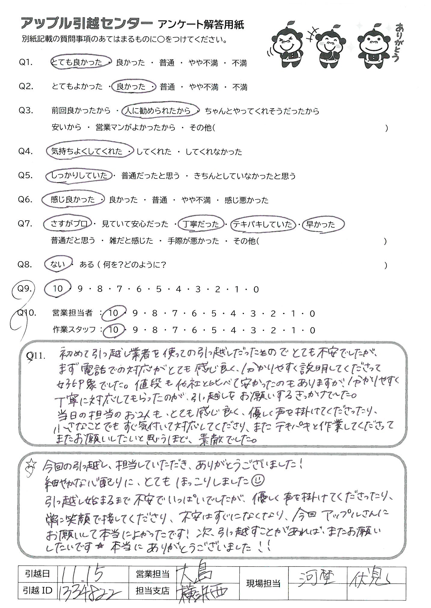 A.今回の引っ越し、担当していただき、ありがとうございました! 細やかな心配りに、とてもほっこりしました 引っ越し始まるまで不安でいっぱいでしたが、優しく声を掛けてくださったり、常に笑顔で接して下さり、不安はすぐになくなり、今回、アップルさんにお願いして本当によかったです!次、引っ越すことがあれば、またお願いしたいです。本当にありがとうございました!!