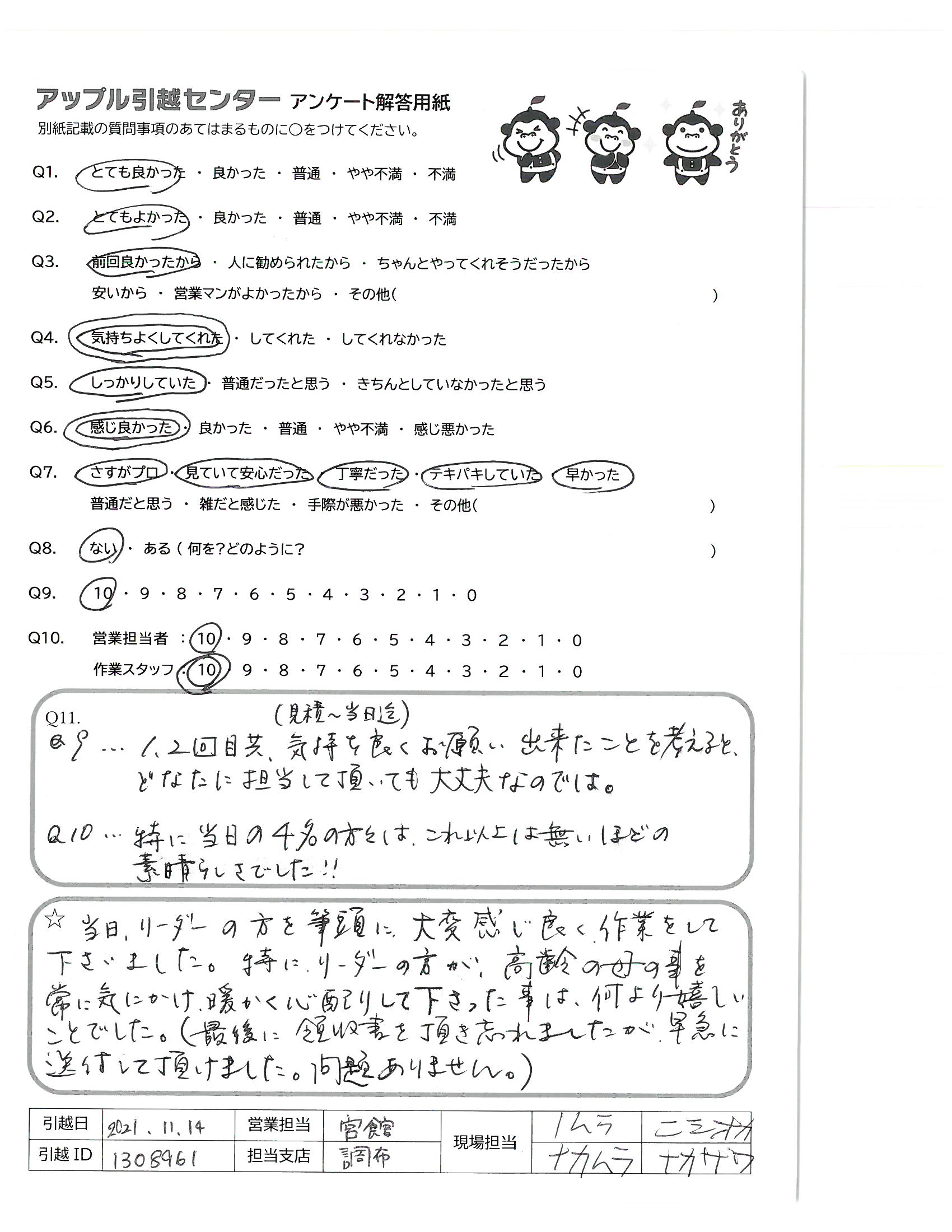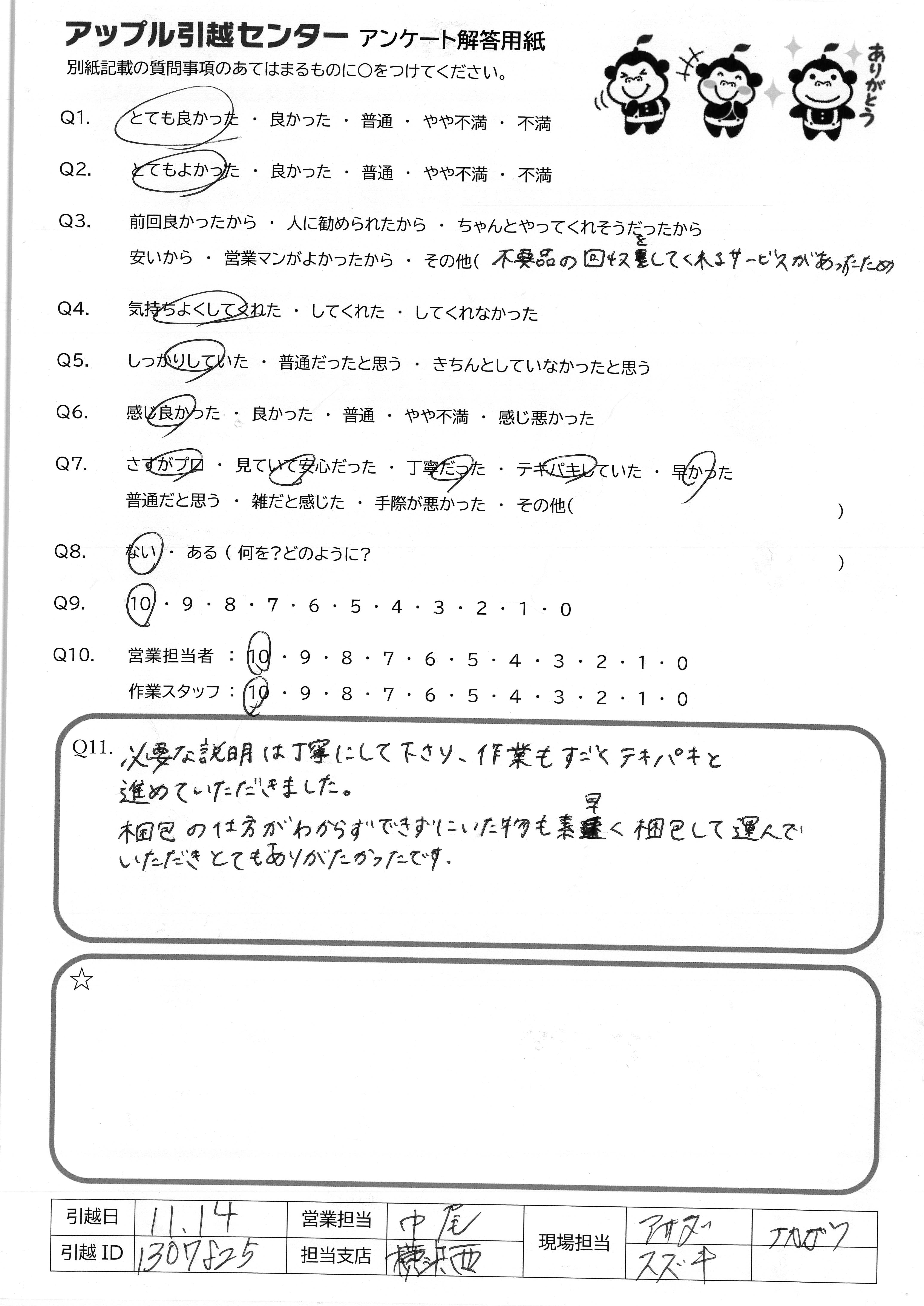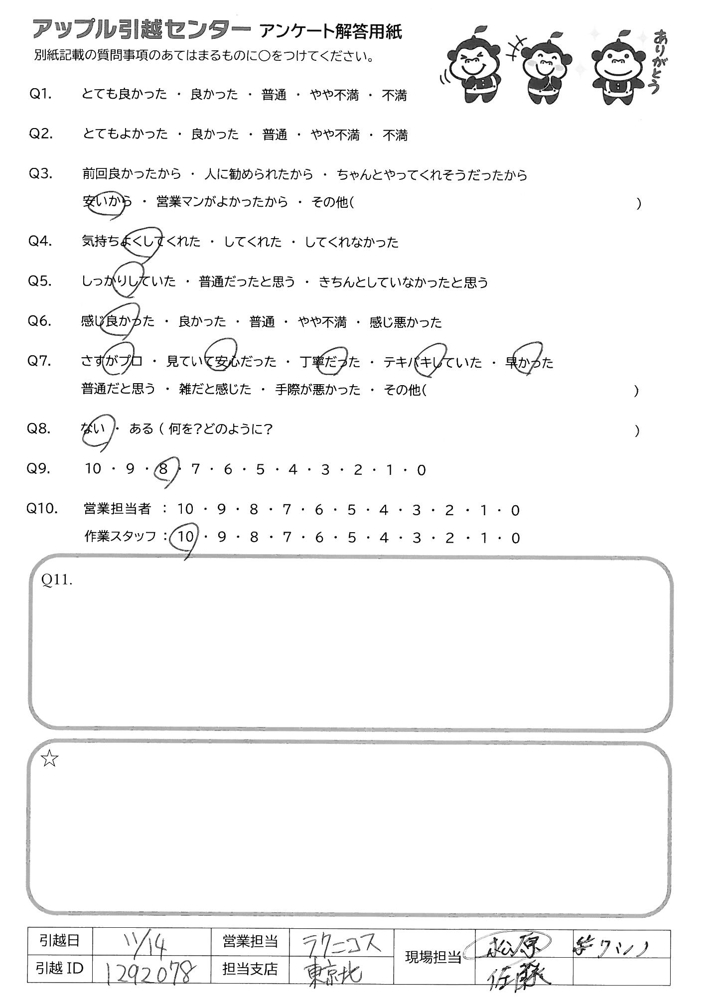 A.引っ越しの対応からお値段まで、全てに満足しています。また引っ越しする際はお願いしたいと思います。ありがとうございました。