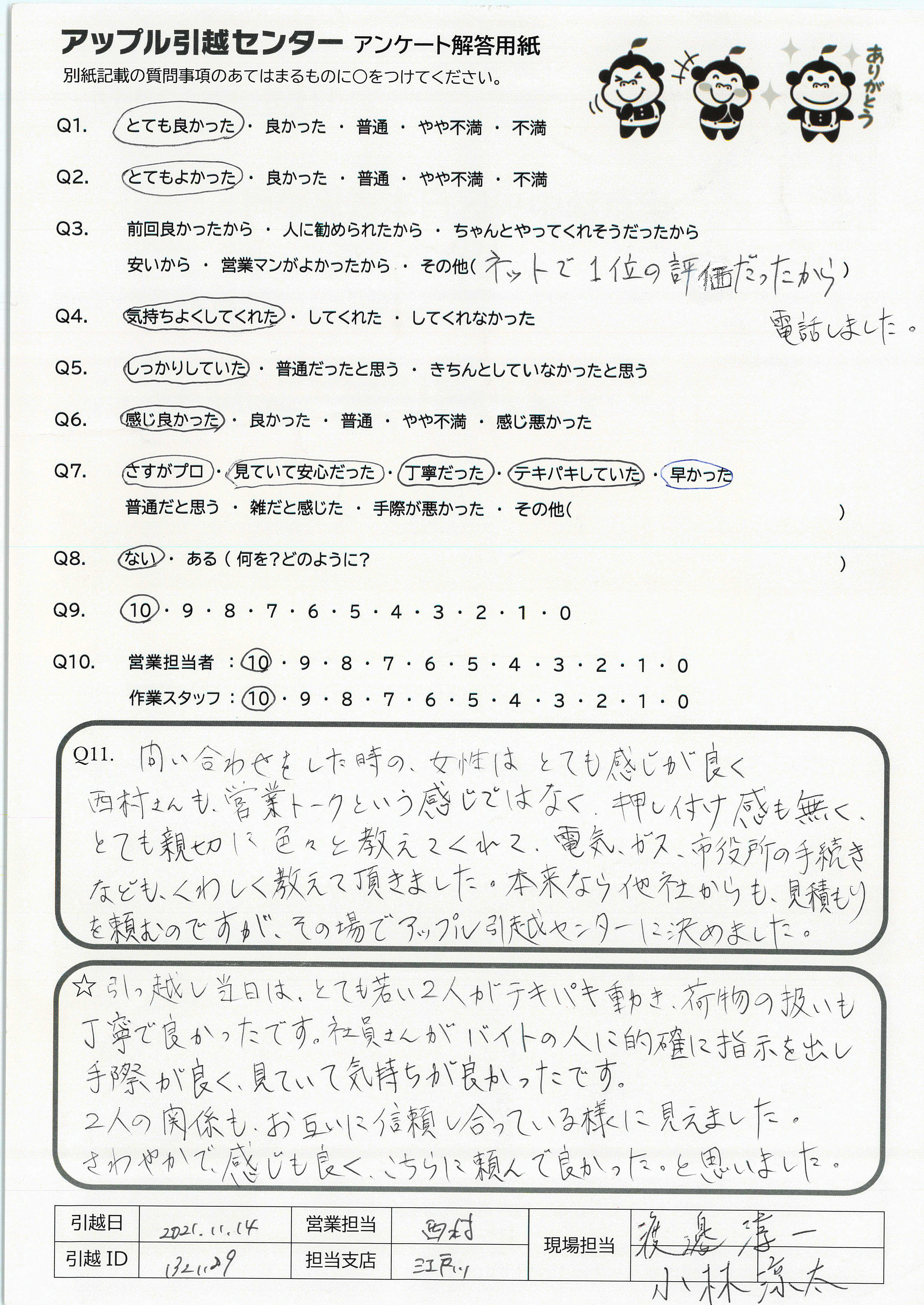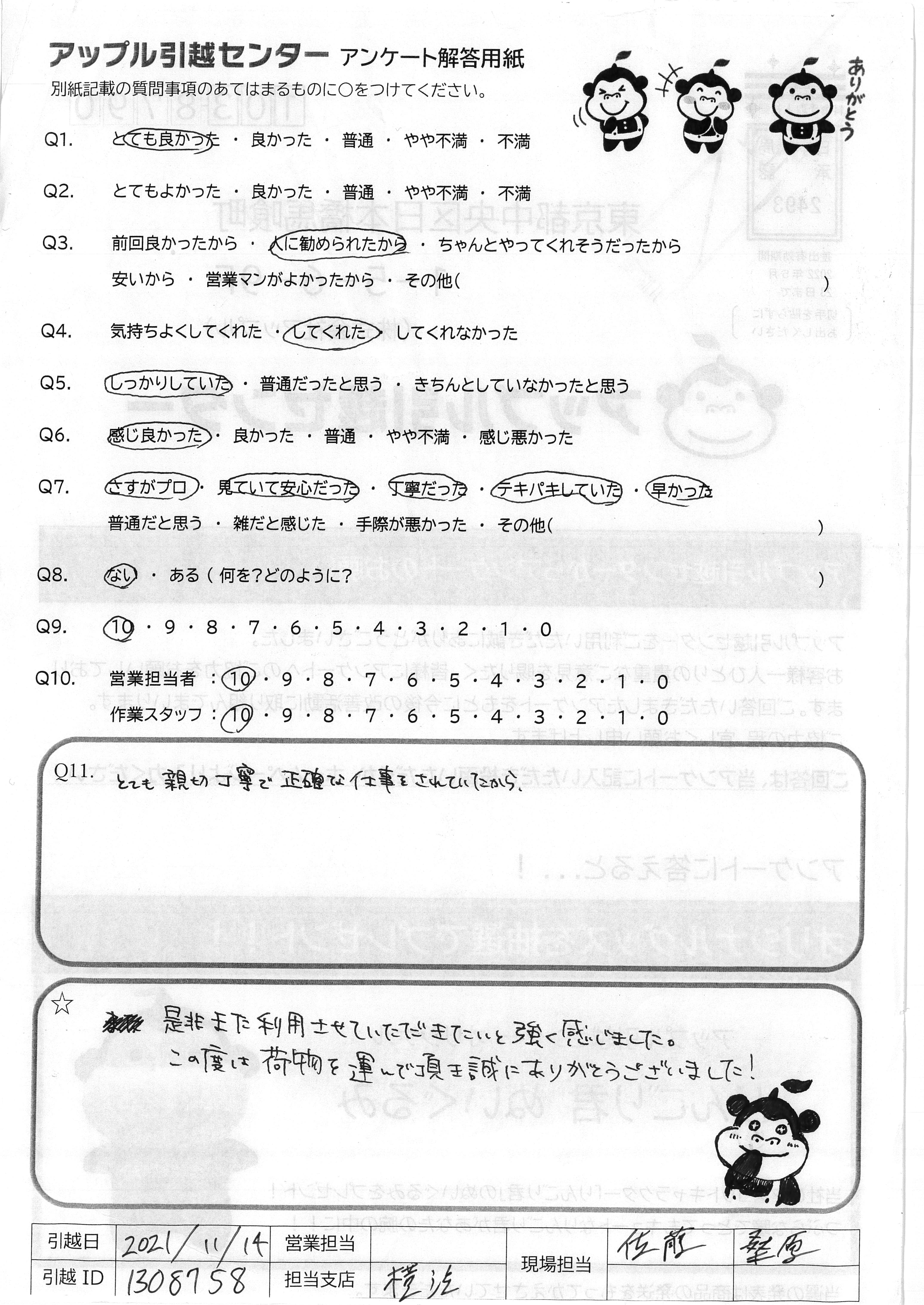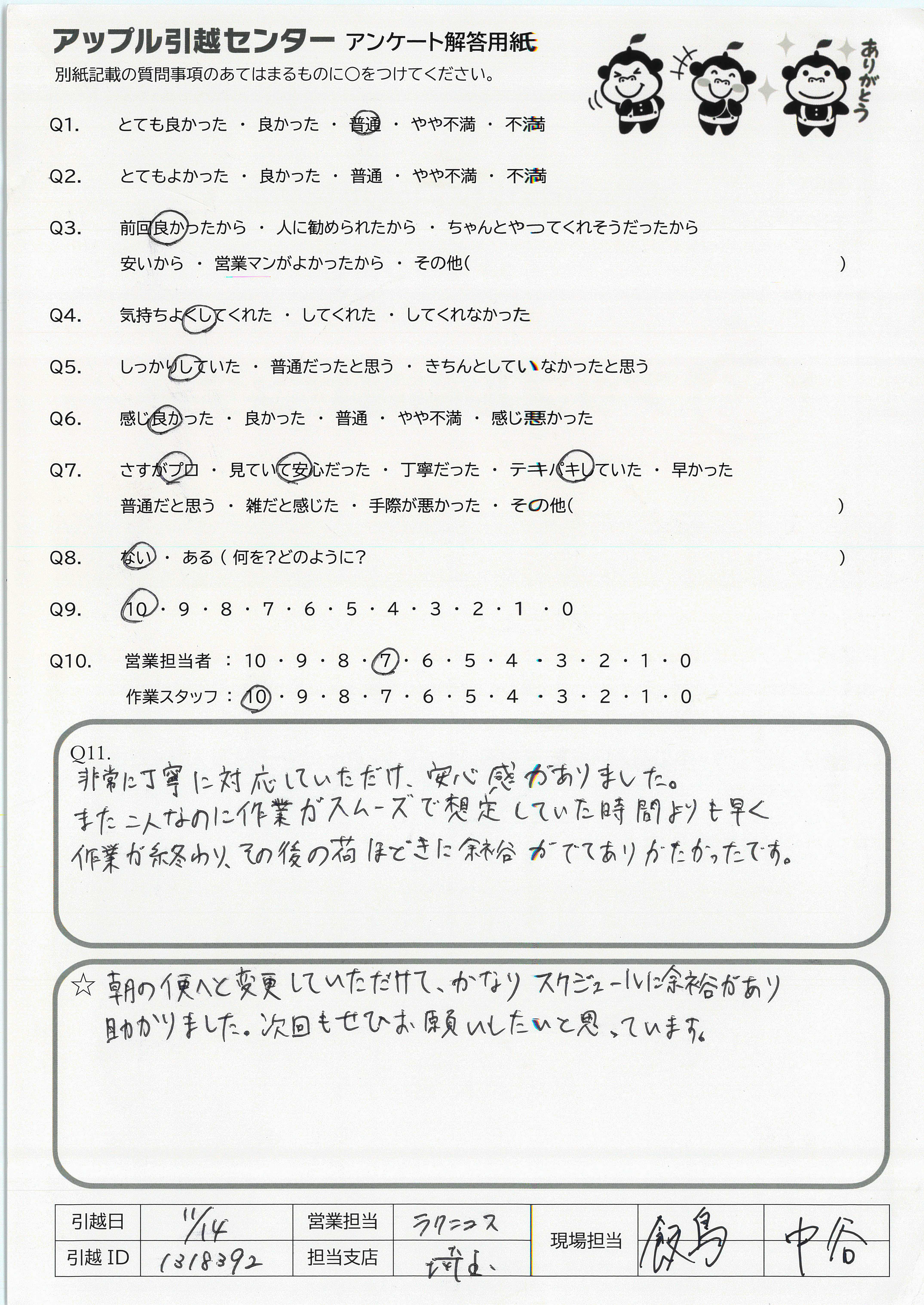A.無事引っ越しができてよかったです。次回もお願いしようと思います。