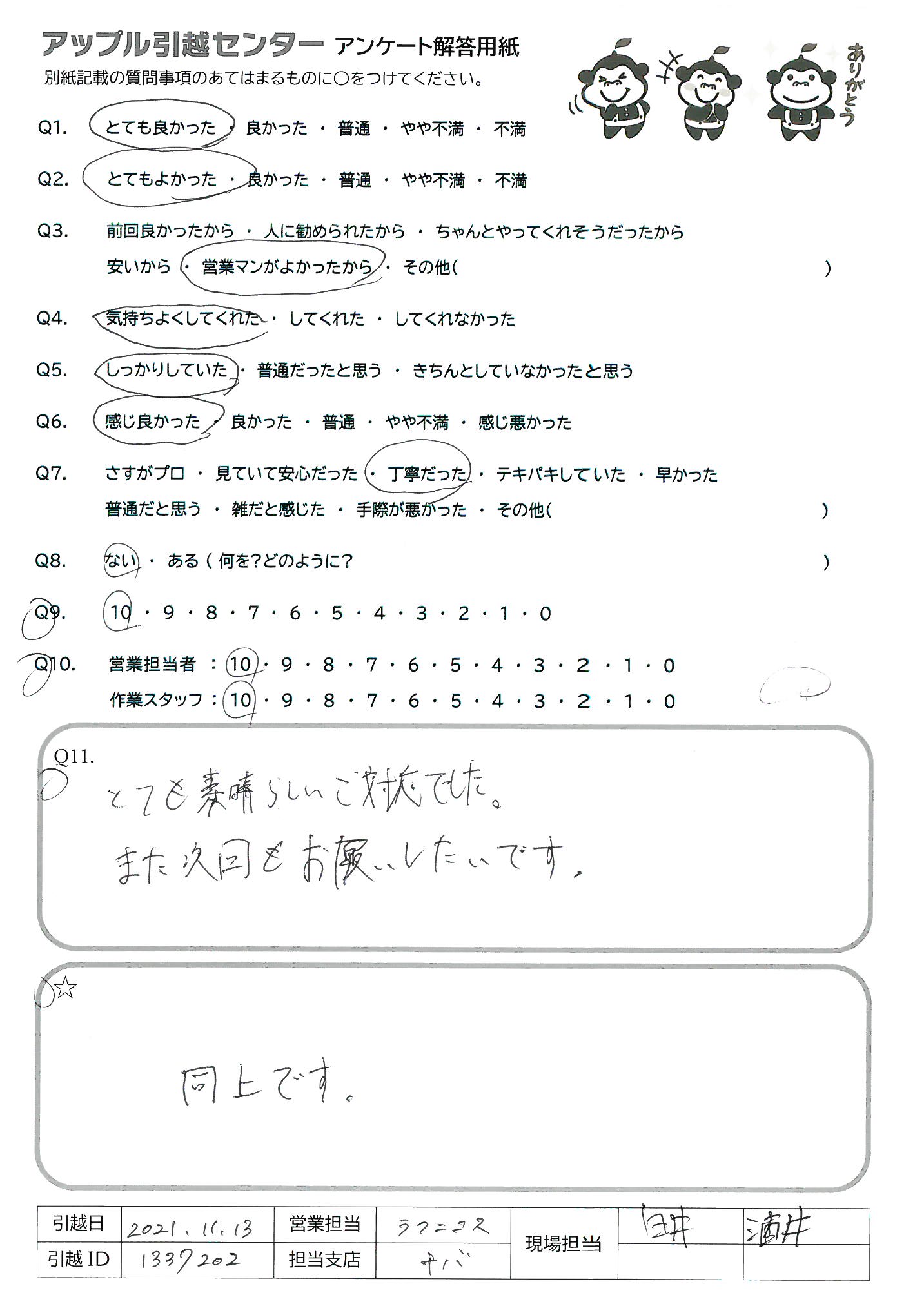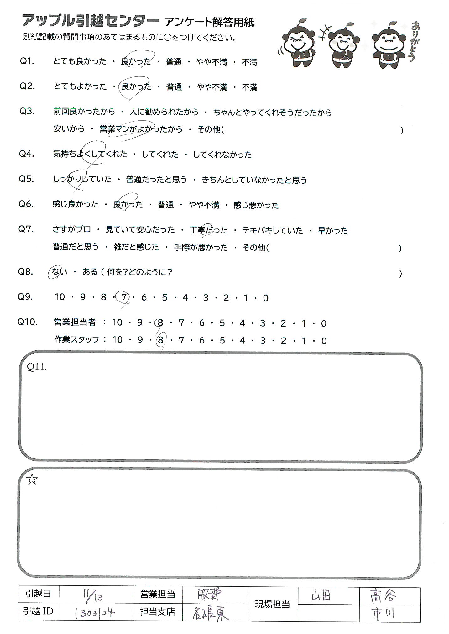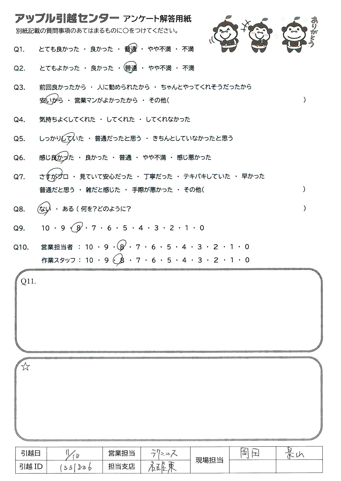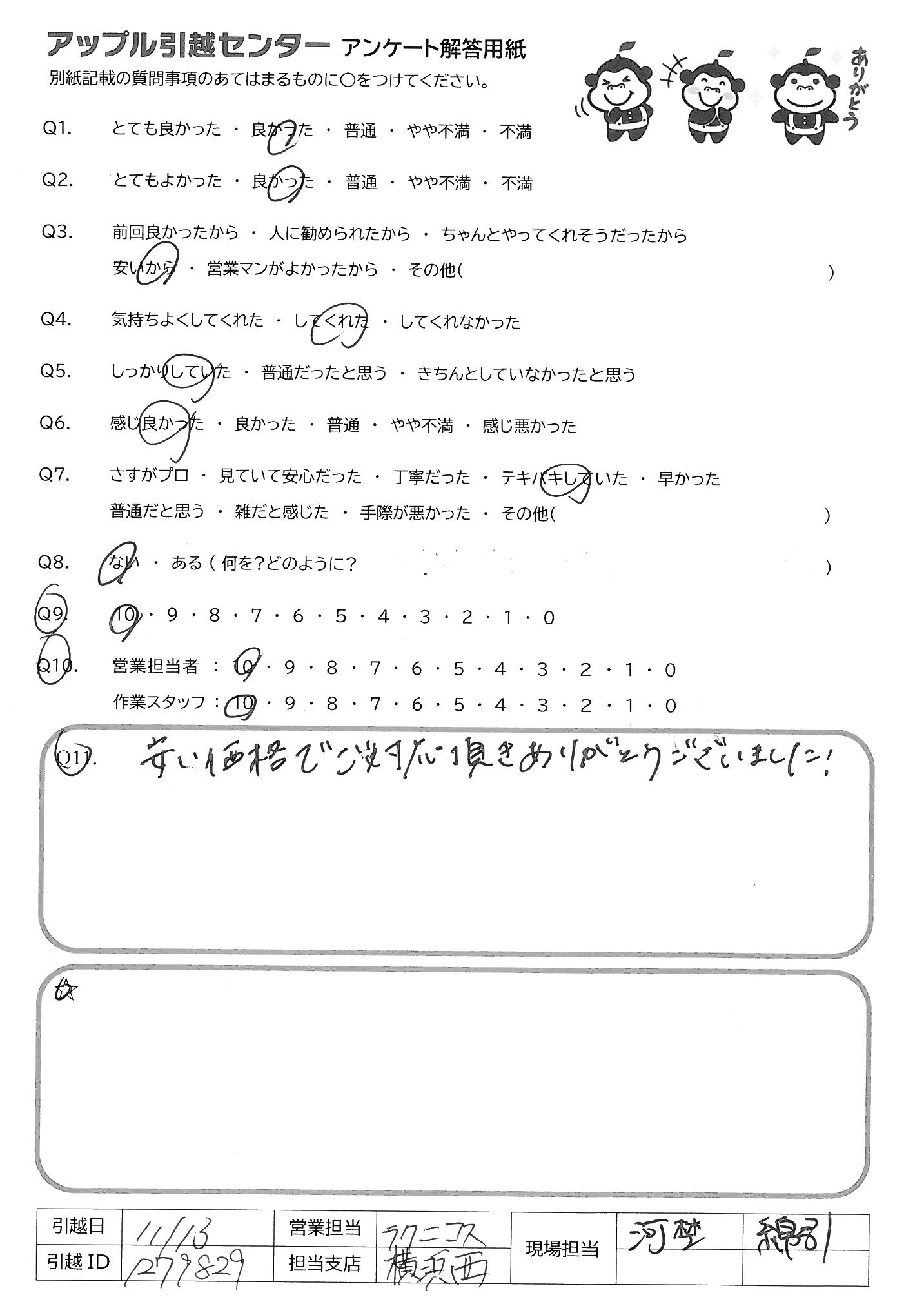 A.Q9→個人的にはすべてやってくれたので満足しているがその分料金を割高に感じる友人はいると思うので。 Q10→手際がよく、思っていたよりも早く作業が終わり助かった。 必要なコミュニケーションをしっかりとれていた。