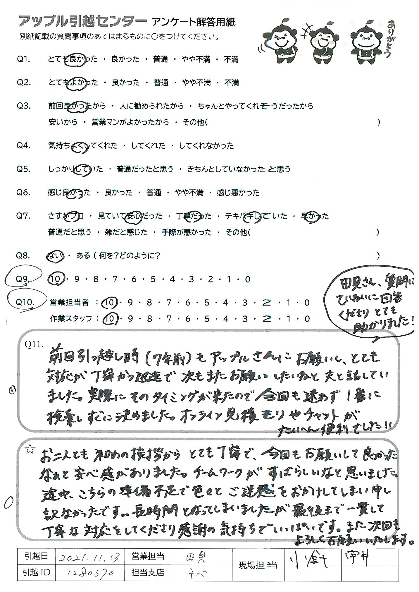 A.前回引っ越し時(7年前)もアップルさんにお願いし、とても対応が丁寧かつ迅速で次もまたお願いしたいねと夫と話していました。実際にそのタイミングが来たので今回も迷わず1番に検索しすぐに決めました。オンライン見積もりやチャットがたいへん便利でした。 田貝さん、質問にていねいに回答くださりとても助かりました!