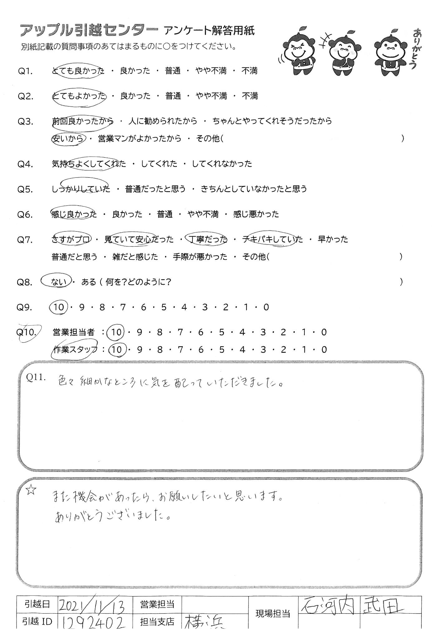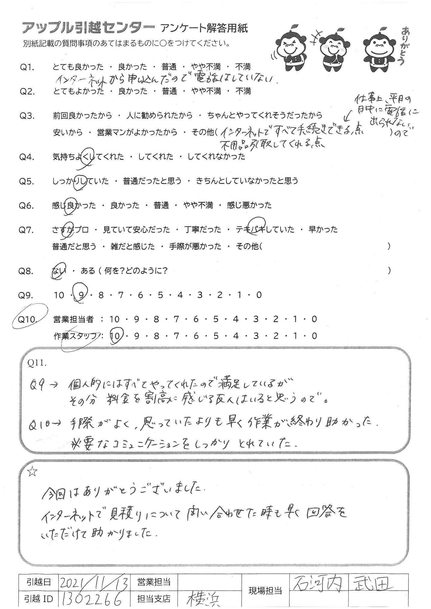 引越し日:2021年11月13日 エリア:神奈川県横浜市港北区