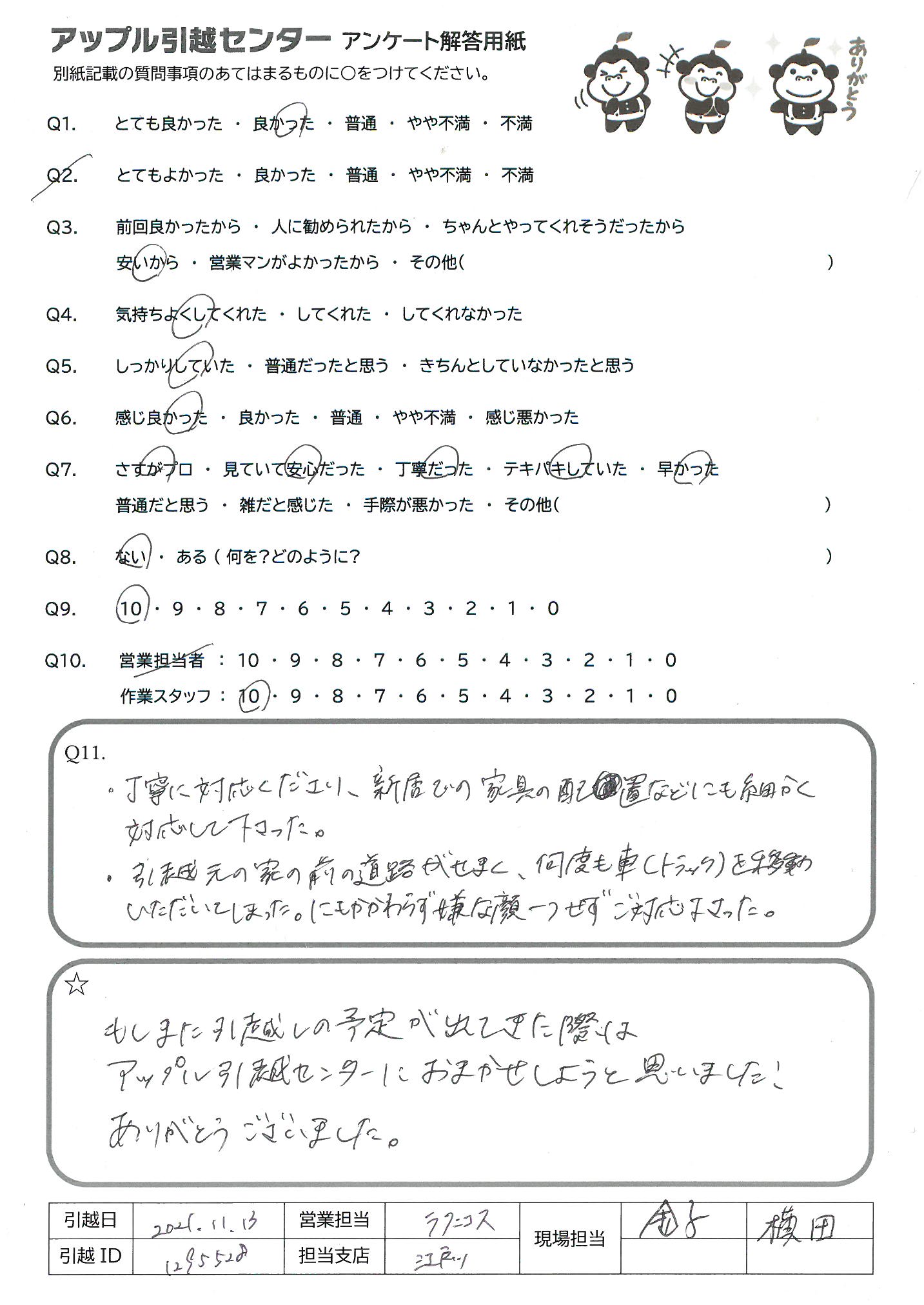 A.もしまた引越しの予定が出てきた際はアップル引越センターにおまかせしようと思いました! ありがとうございました。