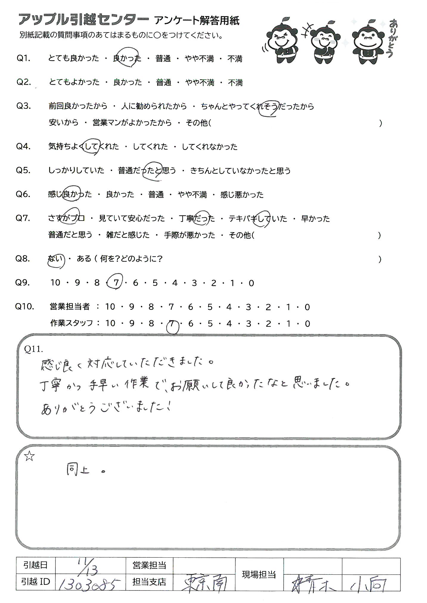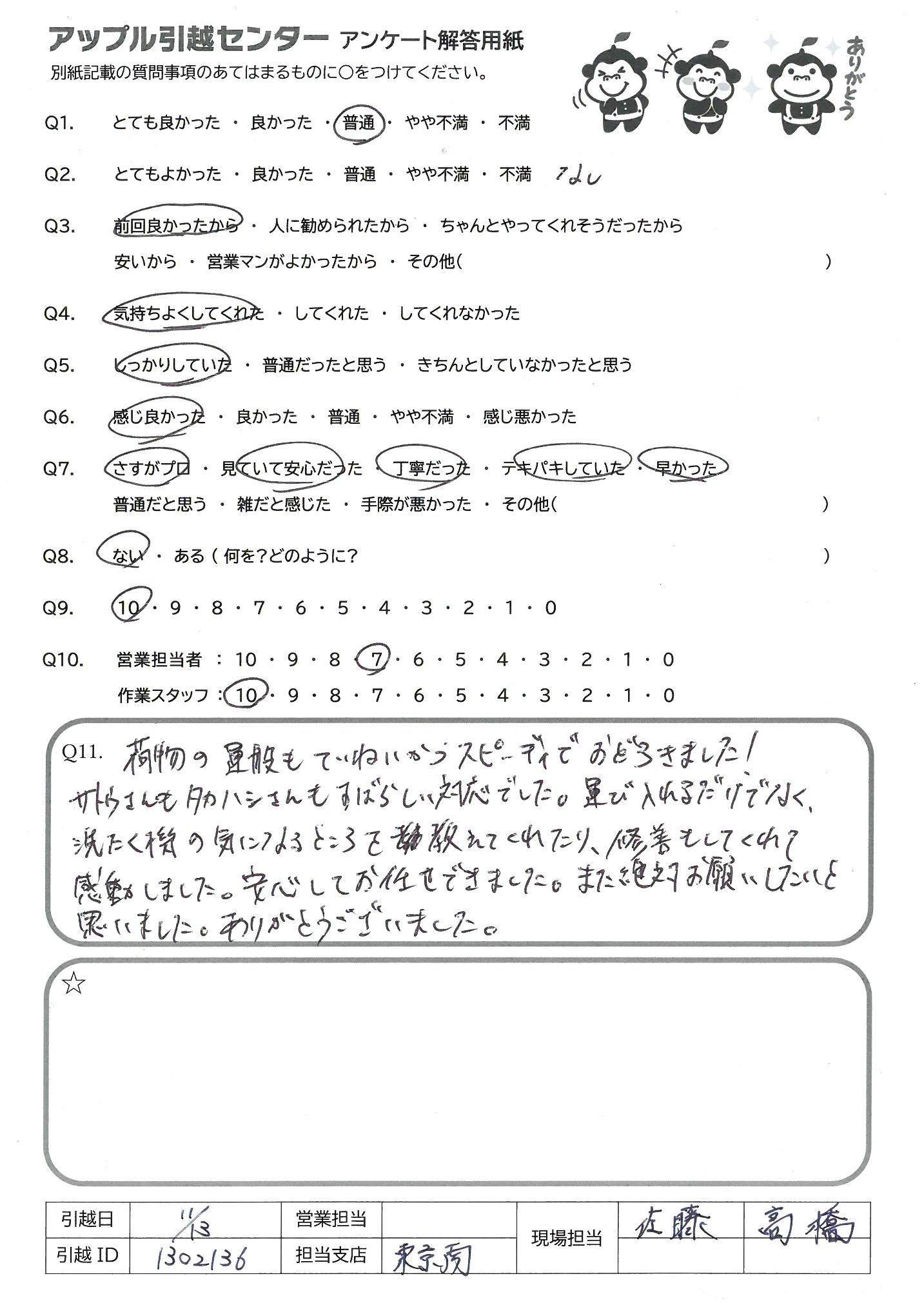 引越し日:2021年11月13日 エリア:東京都江東区