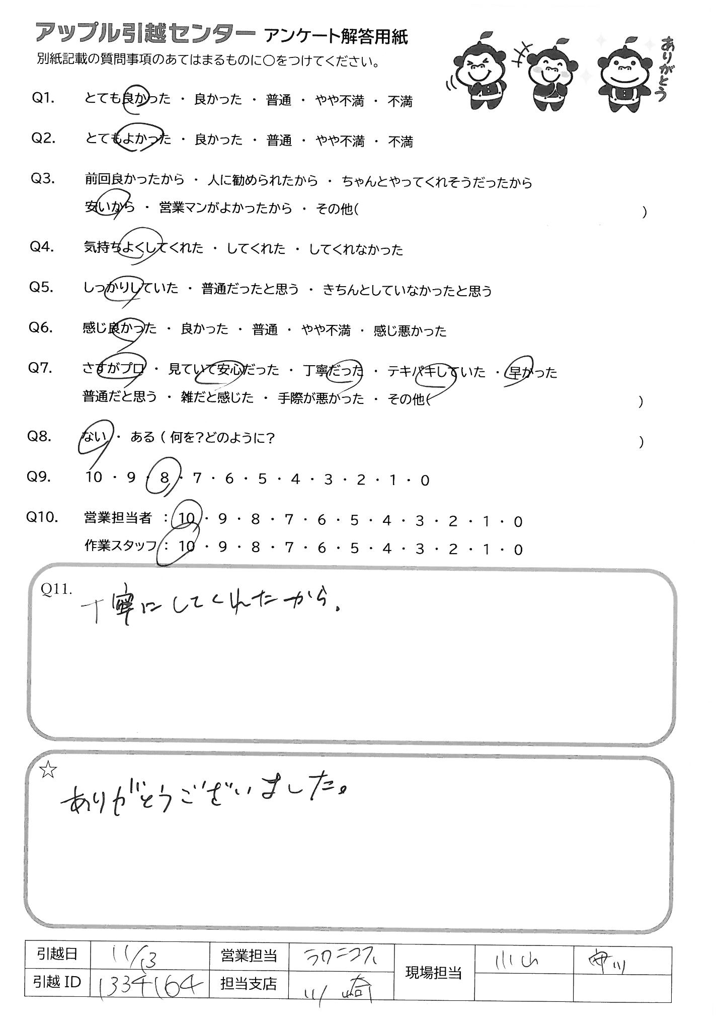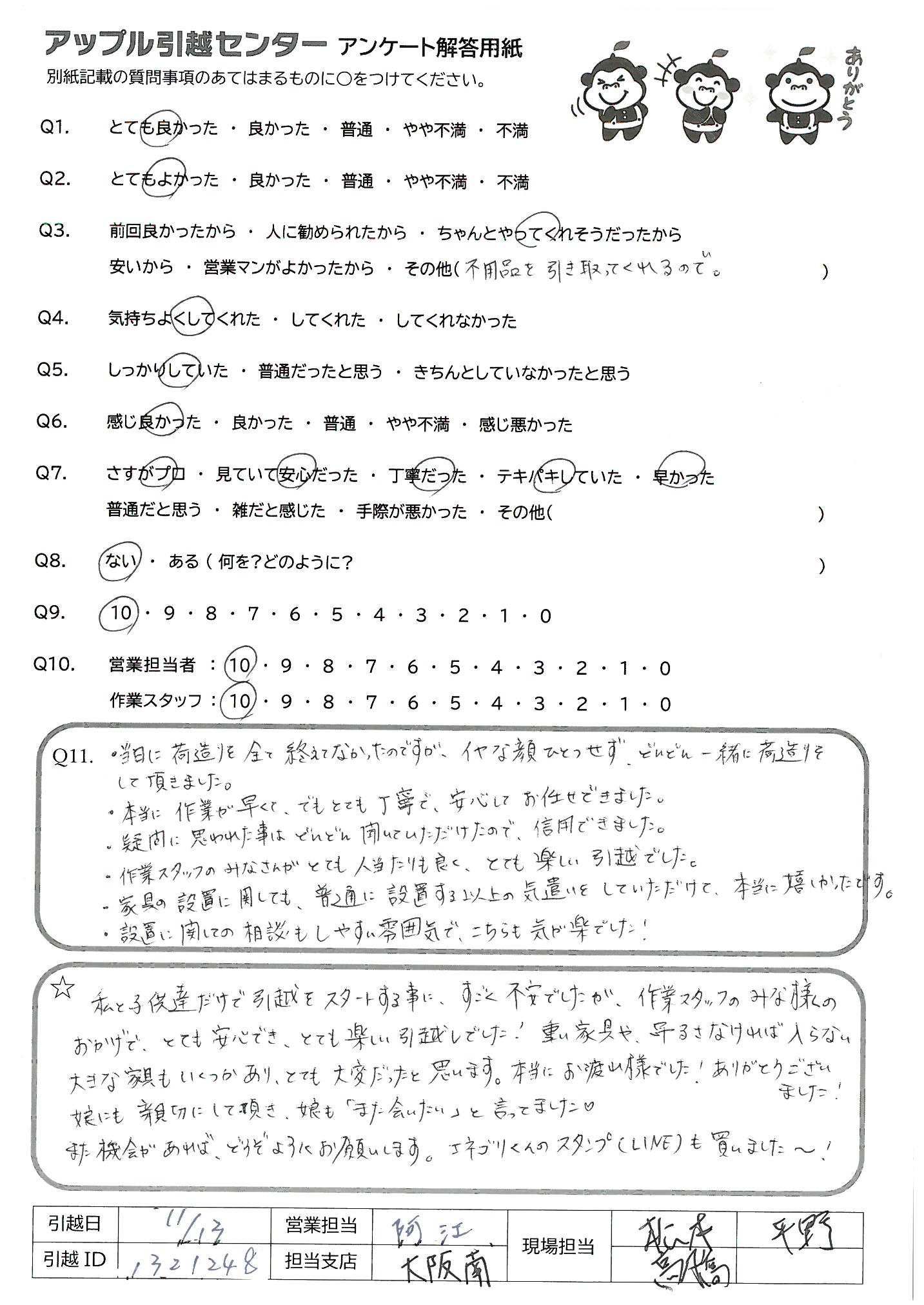 A.私と子供達だけで引越をスタートする事に、すごく不安でしたが、作業スタッフのみな様のおかげで、とても安心でき、とても楽しい引越しでした!重い家具や吊るさなければ入らない大きな家具もいくつかあり、とても大変だったと思います。本当にお疲れ様でした!ありがとうございました! 娘にも親切にして頂き、娘も「また会いたい」と言ってました。 また機会があれば、どうぞよろしくお願いします。エネゴリくんのスタンプ(LINE)も買いました~!